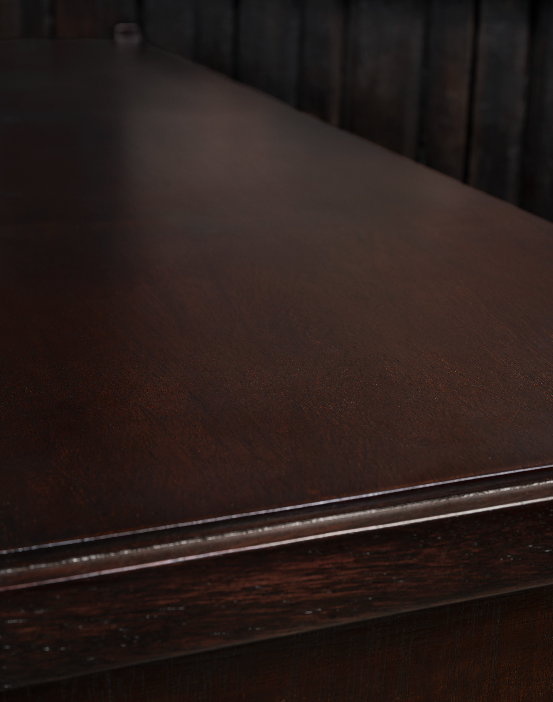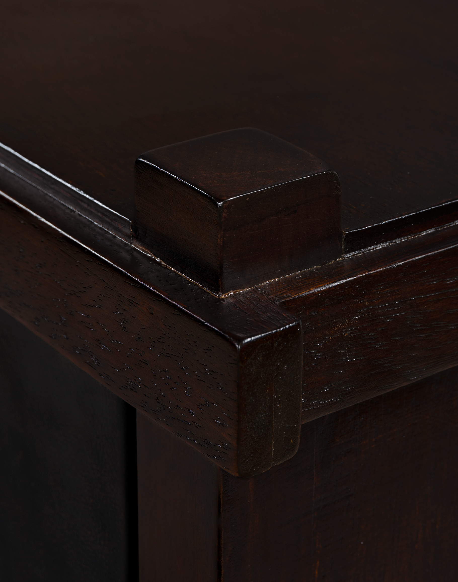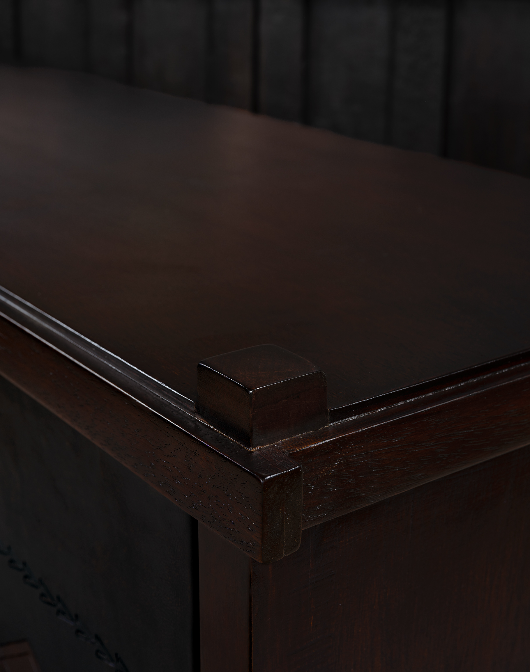 Bring elevated Western sophistication to your dining room or living space with the Cortez Leather Panel Buffet—a striking piece that blends rugged ranch heritage with refined designer detailing.this buffet features a rich, hand-applied finish in deep espresso and dark saddle brown tones, allowing the natural wood grain to subtly show through with warmth and depth. The clean-lined case is anchored by a slightly elevated base and framed top, giving it a tailored, architectural presence that feels both substantial and polished.
