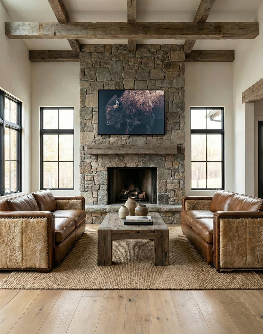 The Cowboy Architect Sofa, a star of the mountain and refined ranch styles is a testament to American craftsmanship and quality. Its hand-burnished leather achieves an aged patina in the right places, reflecting the qualities that only time, wear, and frequent care could have naturally accomplished. The large boxy arms and studded genuine brass nail heads add a rustic classic feel while maintaining a modern, refined design. The plush pillow back provides sink-in comfort that is perfect for relaxation. Wrapped in premium Shearling hides and accented with a thick leather belting, it's a piece that exudes American pride. The exquisite black walnut wood legs are hand-cut, sanded, and oil-rubbed to finish. The Cowboy Architect Sofa is not just stylish but also durable, constructed with a hardwood frame and high-density foam cushion, ensuring lasting comfort and durability. 100% American-made to the highest quality of standards and craftsmanship, it's a piece that will bring your family style and comfort for years. At Adobe Interiors, we create the furniture, and you create the memories.