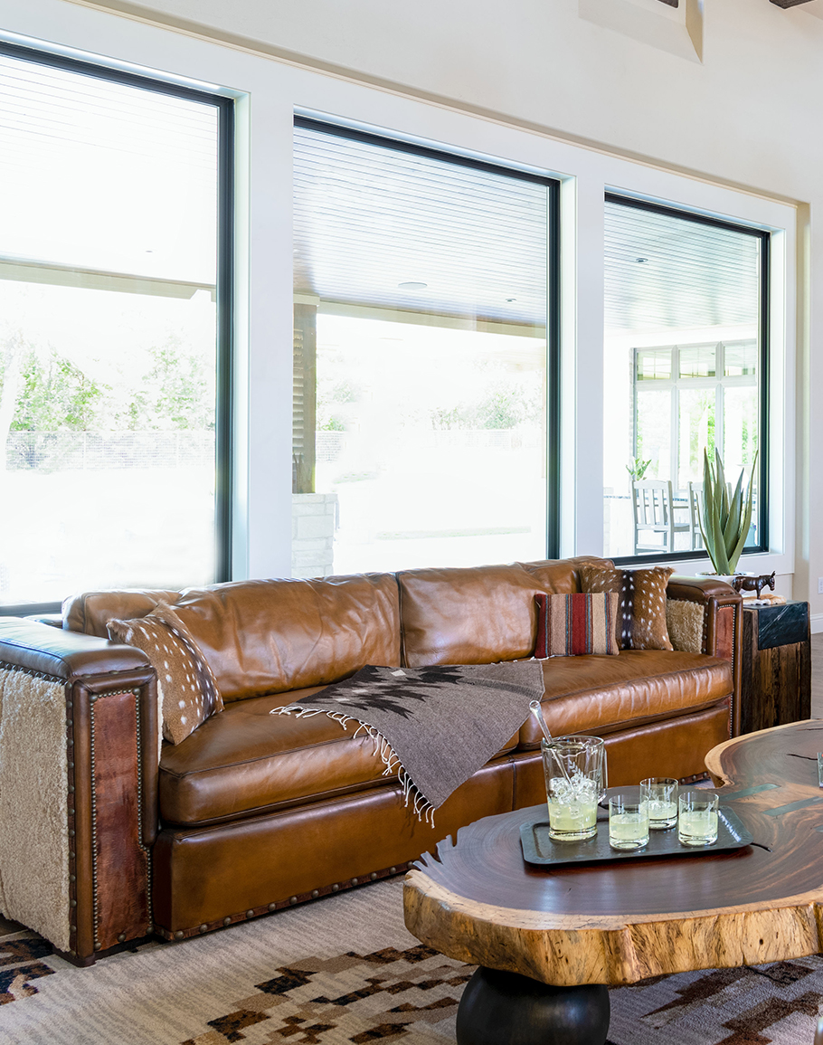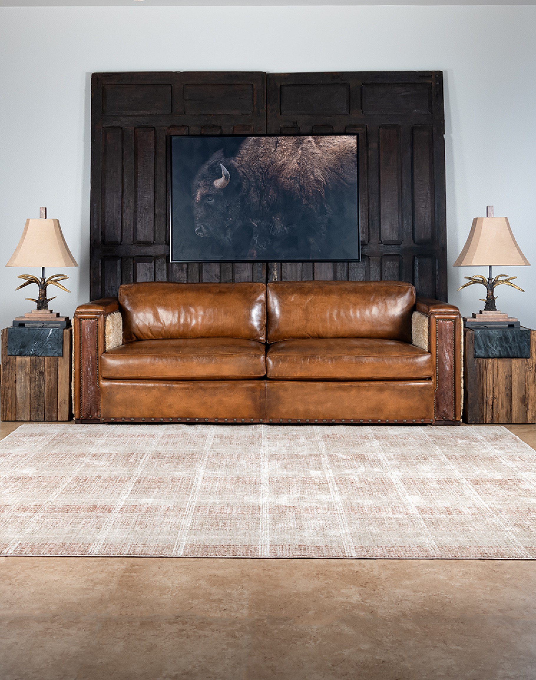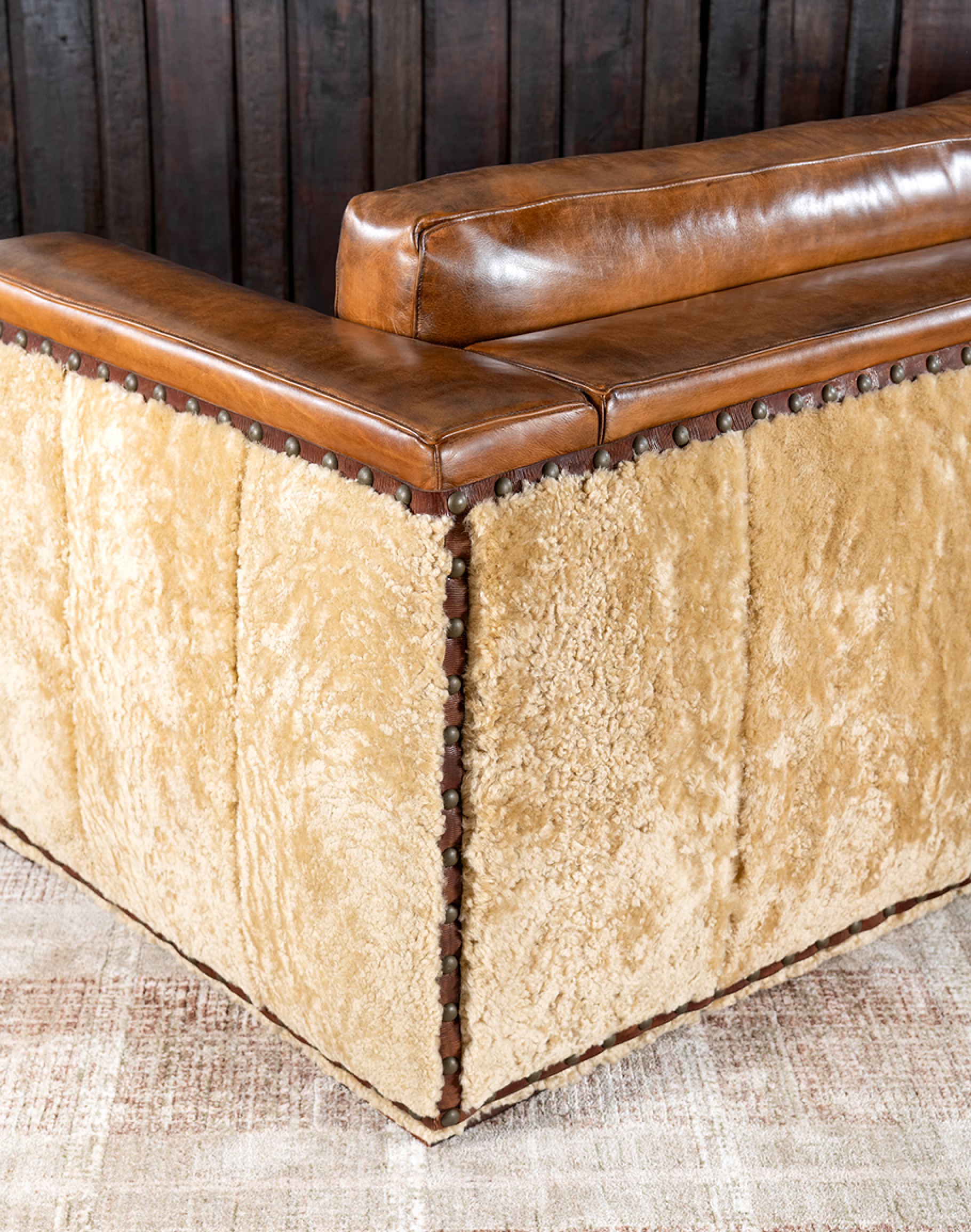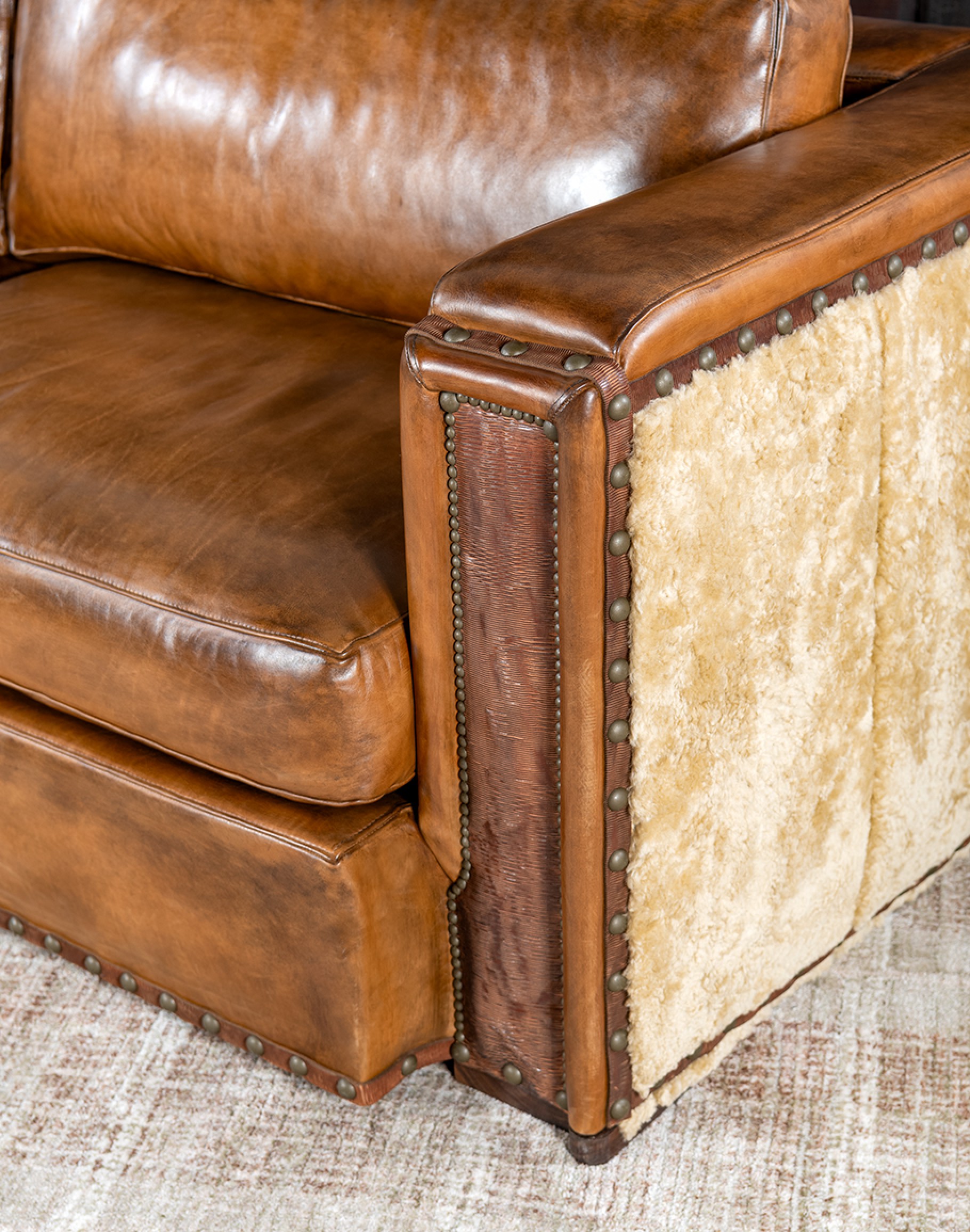 The Cowboy Architect Sofa, a star of the mountain and refined ranch styles is a testament to American craftsmanship and quality. Its hand-burnished leather achieves an aged patina in the right places, reflecting the qualities that only time, wear, and frequent care could have naturally accomplished. The large boxy arms and studded genuine brass nail heads add a rustic classic feel while maintaining a modern, refined design. The plush pillow back provides sink-in comfort that is perfect for relaxation. Wrapped in premium Shearling hides and accented with a thick leather belting, it's a piece that exudes American pride. The exquisite black walnut wood legs are hand-cut, sanded, and oil-rubbed to finish. The Cowboy Architect Sofa is not just stylish but also durable, constructed with a hardwood frame and high-density foam cushion, ensuring lasting comfort and durability. 100% American-made to the highest quality of standards and craftsmanship, it's a piece that will bring your family style and comfort for years. At Adobe Interiors, we create the furniture, and you create the memories.