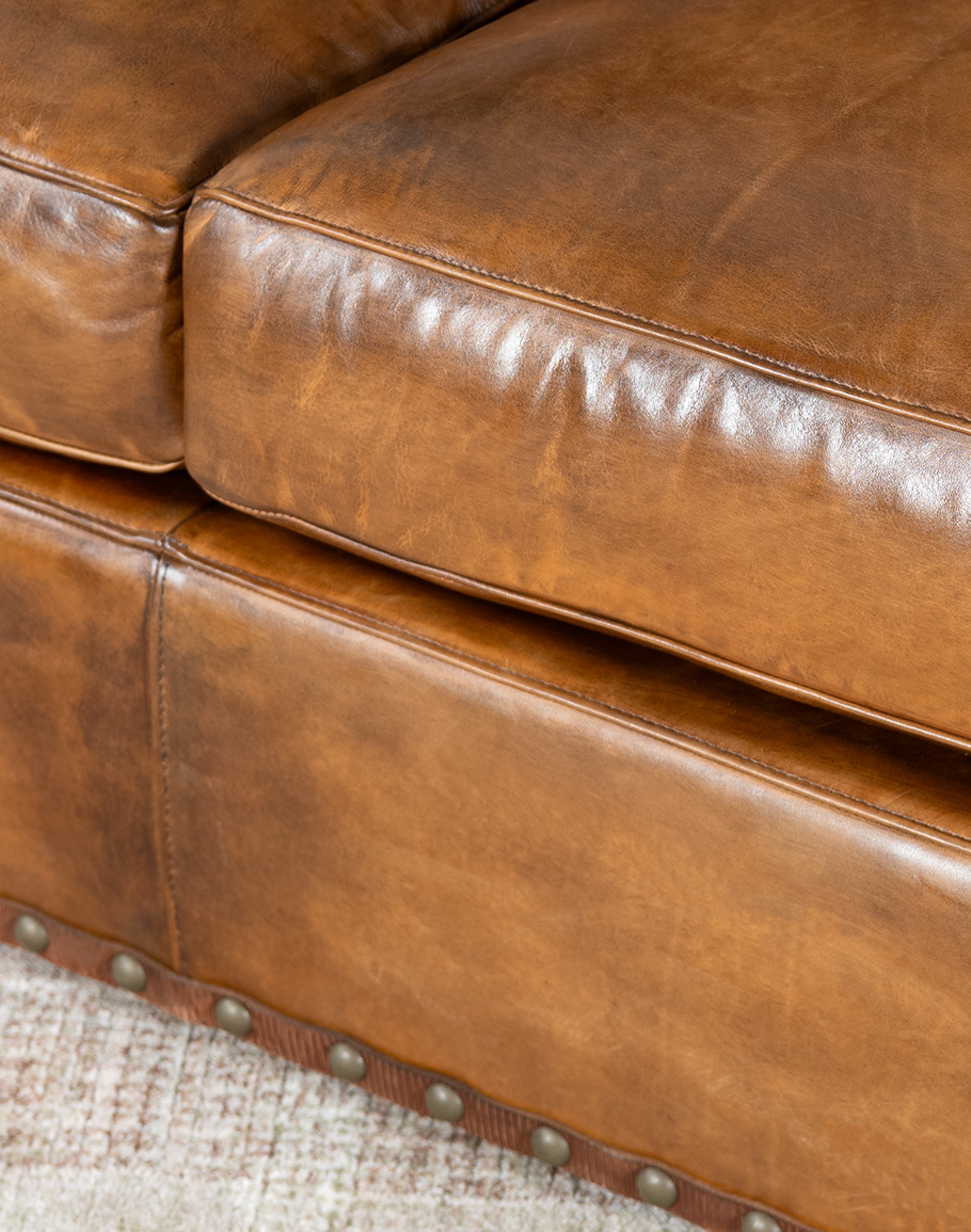 Leather Description: This is a full grain aniline leather tanned in a historic leather producing region of Italy using English hides. The century old tannery prepares this leather article by applying a hot wax, then turning the hides in old wooden tanning drums overnight to soften the natural fibers and impart it with a remarkable suppleness. The leather is then upholstered in its "crust form" on the furniture in North Carolina, After the furniture is made our leather artisans apply a multi step hand rubbed Patina using the same waxes and pigments used in Italy. Performing this process on the actual finished piece allows our artisans to develop a unique Patina, composition, and overall essence that creates a piece of furniture that has uniqueness, character and style that matches the individual who's selecting it. This leather imparts the feeling of a softer, well broken in leather one might find on a decades old chair discovered in a French country estate or the Parisian flea market. The leather is brand new from our Artisans hands... without the aging issues that sometimes come from the hands of time. Truly a unique, hand-made article in an era when only companies committed to the highest standards lavish this sort of attention and time to unique American made furniture.