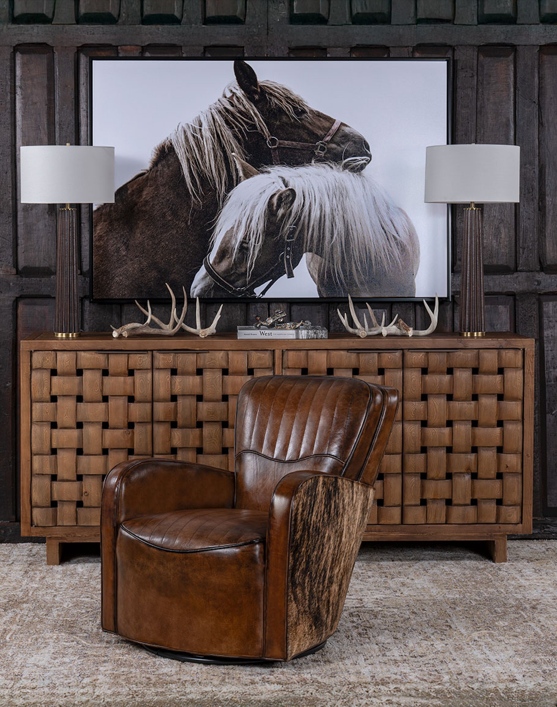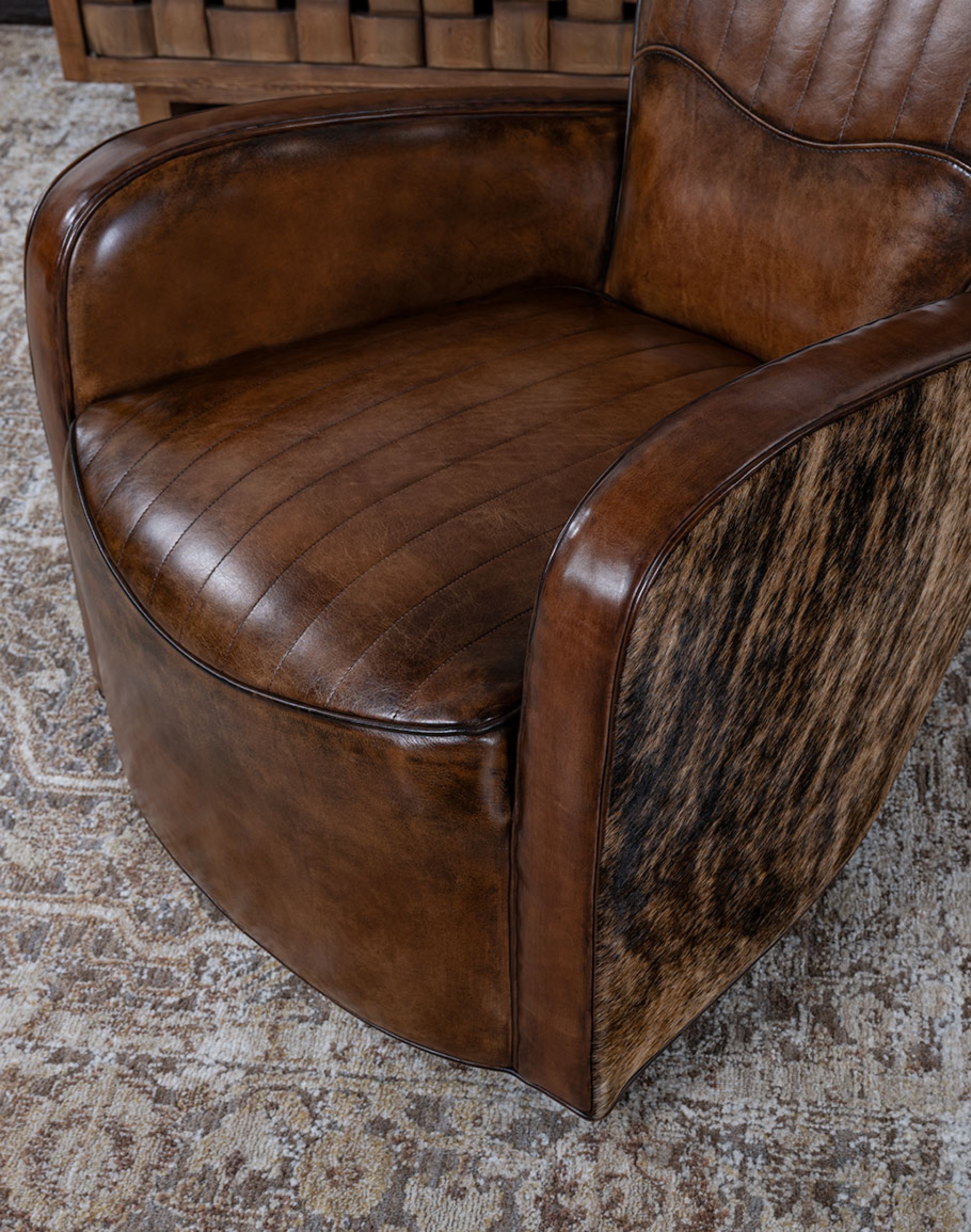 The Cowboy Paris Swivel Chair is a timeless modern and retro elegance blend! Indulge in the epitome of American craftsmanship with our Cowboy Paris Swivel Chair. At home in the Classic Ranch collection, it will also blend into several design styles, making it a star in the Eclectic Ranch collection as well. Brindle cowhide is meticulously placed on the outer arms and outside back, exuding sophistication and luxury.