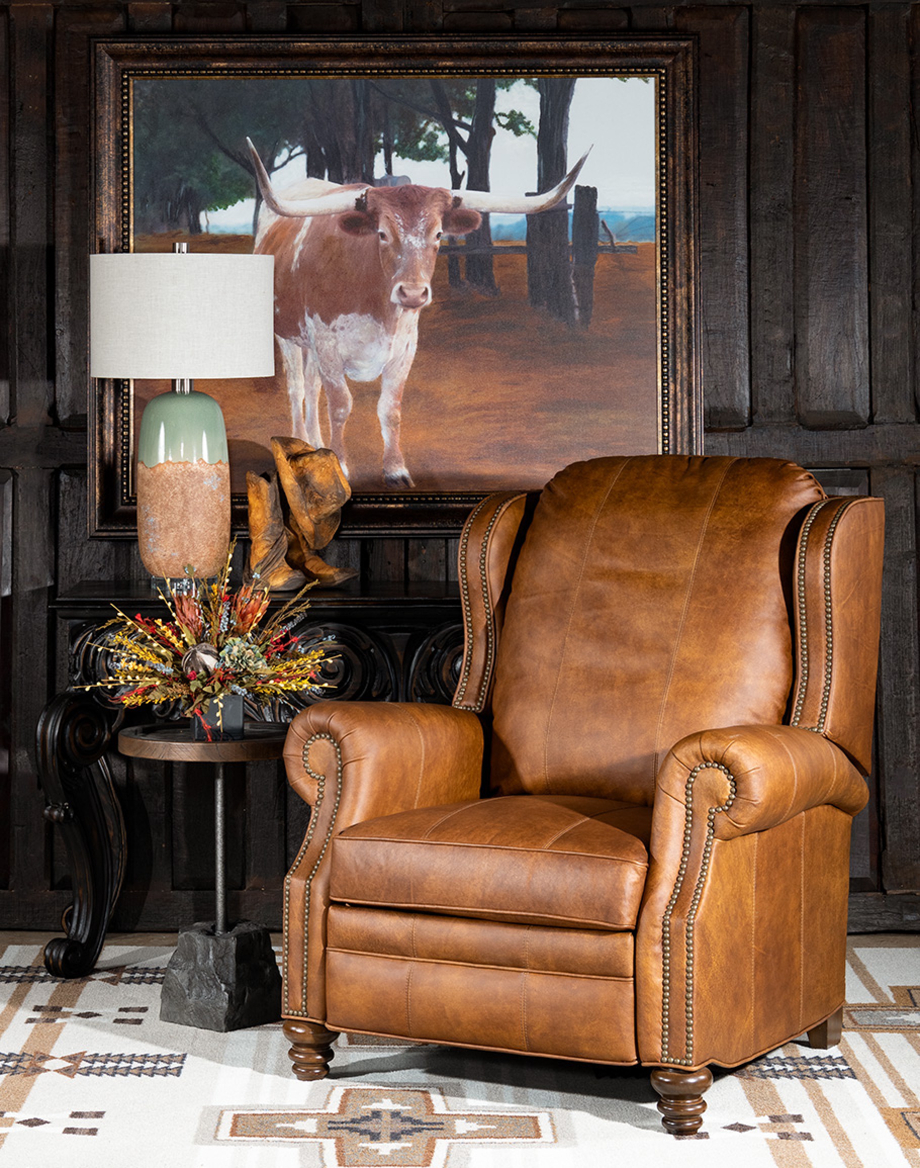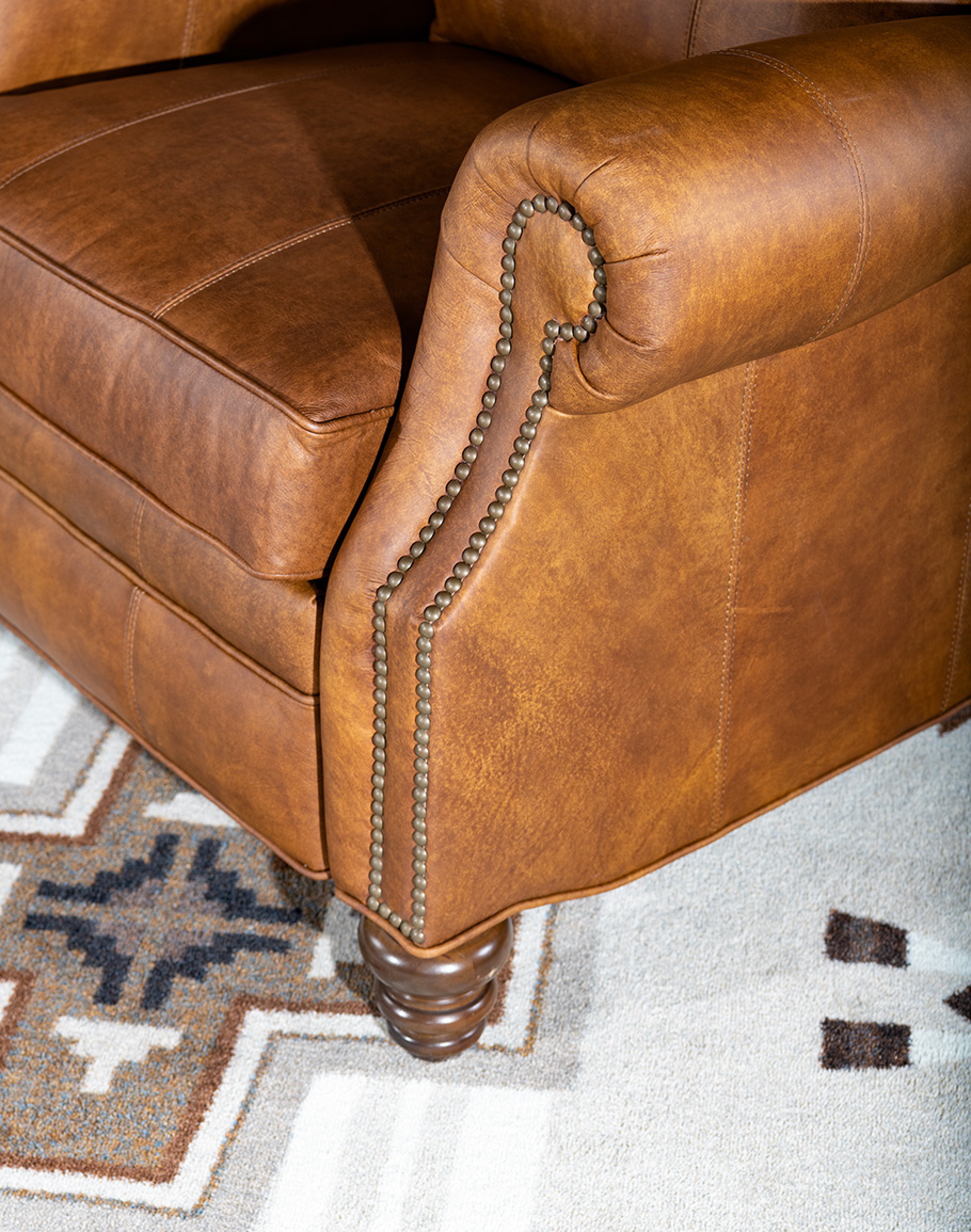 Experience the ultimate in Western-style comfort and luxury with the Cowboy Suela Recliner from Adobe Interiors. Made with high-quality leather upholstery and expert craftsmanship, this recliner is the perfect blend of classic Western style and modern comfort. 100% American made, it's a true testament to the art of handcrafted furniture. With its plush seating and stylish design, it's the perfect addition to any home. Shop now and elevate your home decor with the Cowboy Suela Recliner from Adobe Interiors.