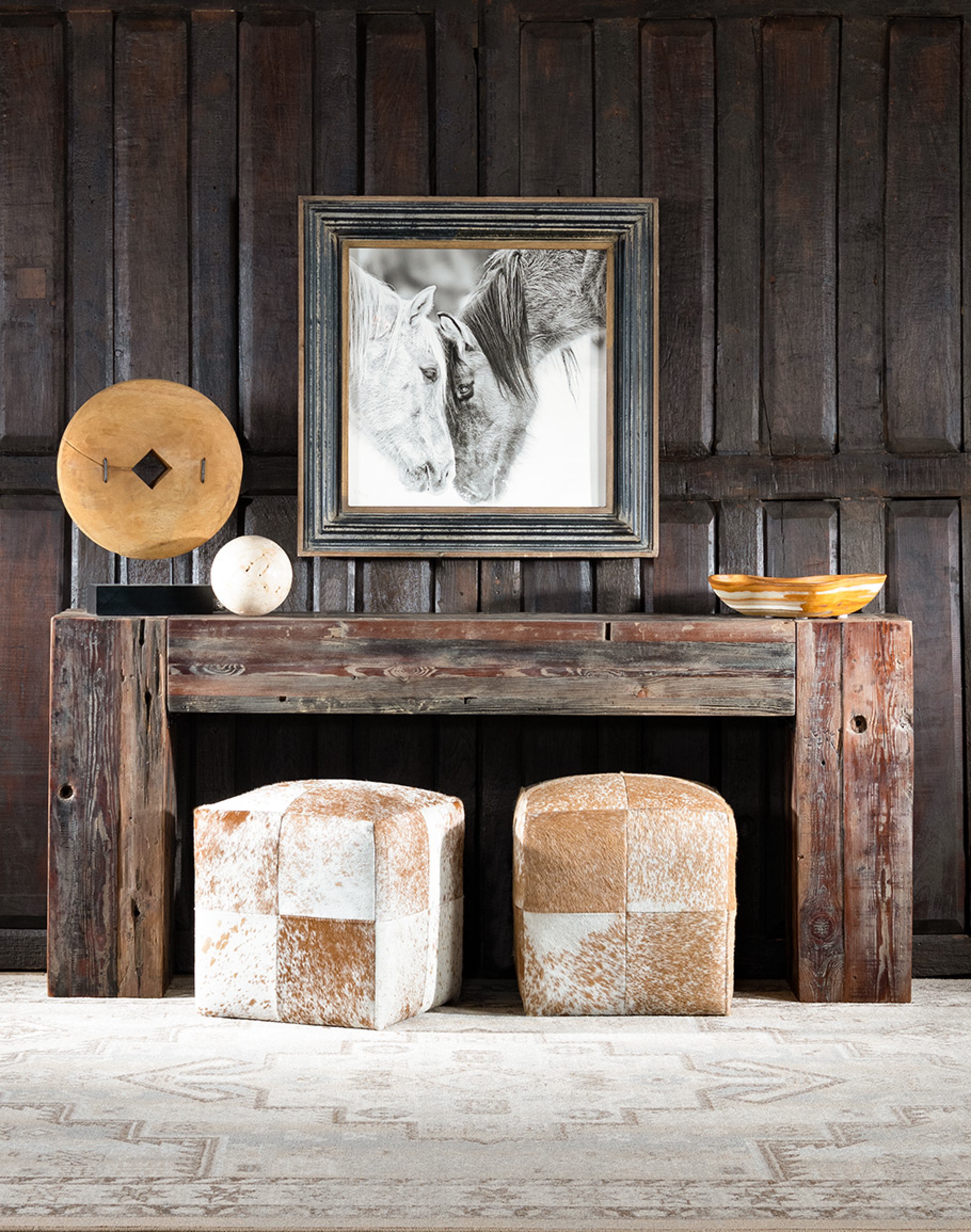 The Ivena is a one-of-a-kind console constructed from recycled, reclaimed boat wood. This statement piece showcases years of use with a natural wood g..