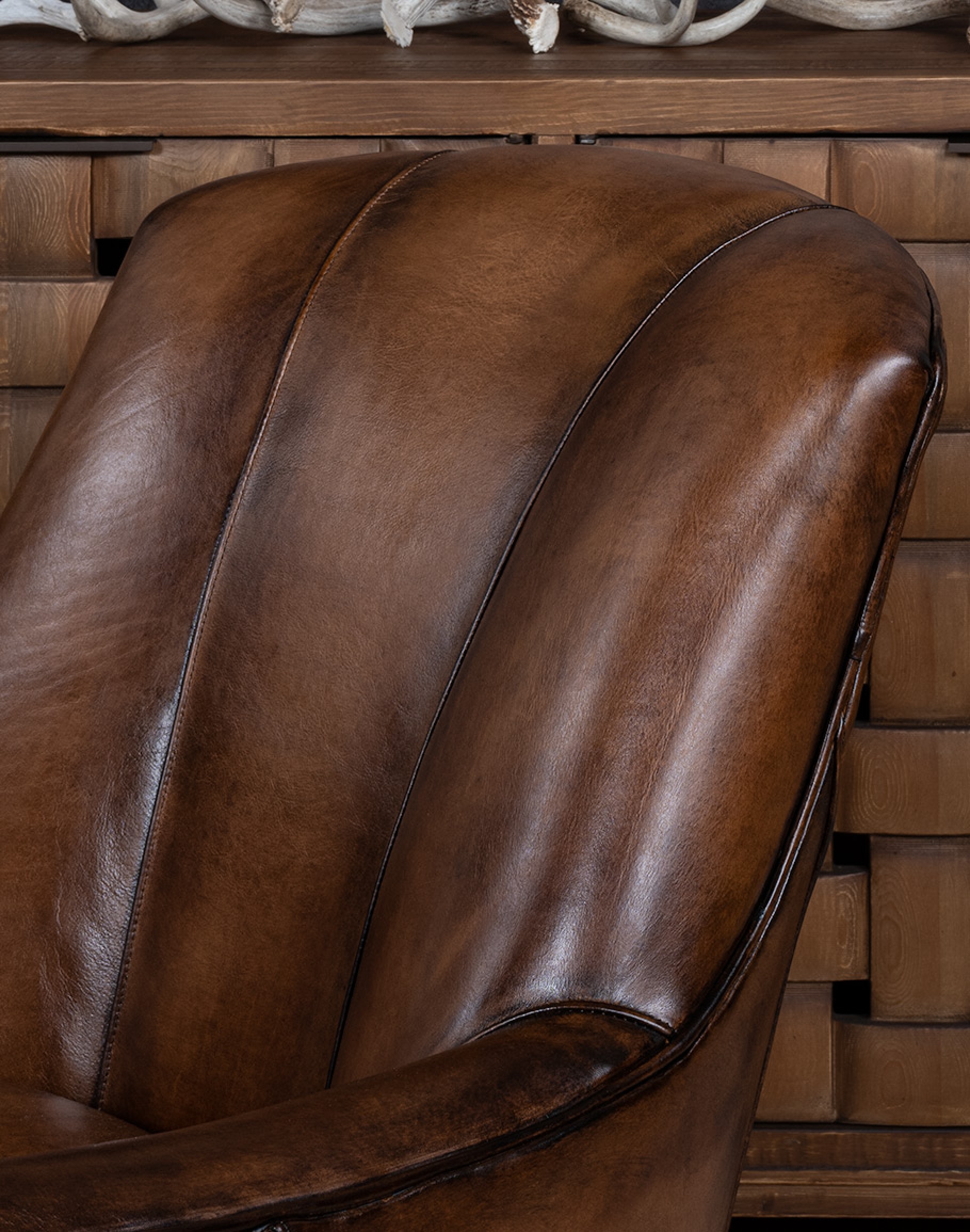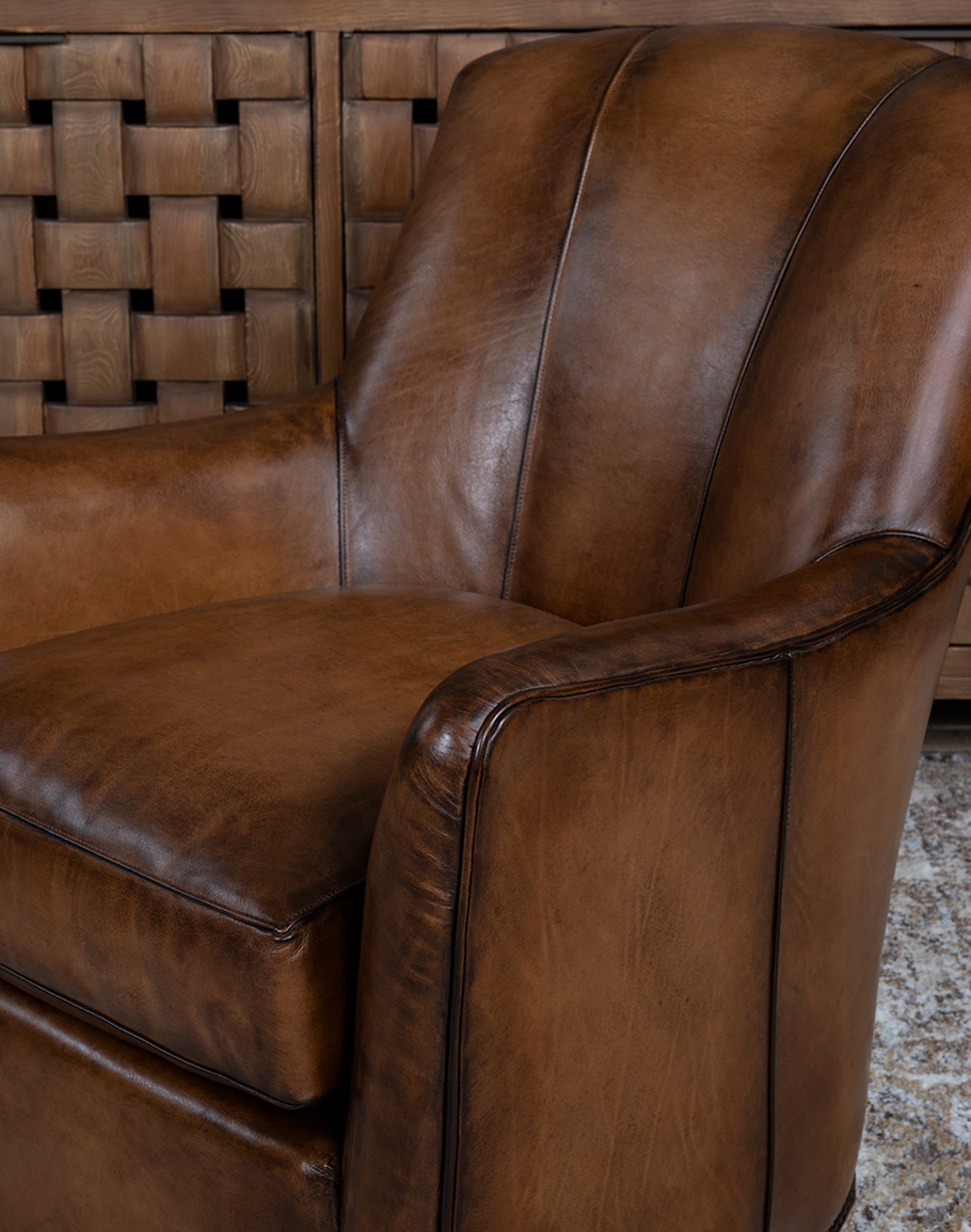Leather Description: Artisan Leathers beautifully evoke this time worn quality, unique to every individual piece, like the originals. To pure aniline leather crusts, already fully and carefully upholstered to the piece, a base color is created with multiple applications of waxes and oils, hand-worked by the leather Artisan. After drying, this craftsman then carefully builds-up the finish with an expert’s eye, and touch, to achieve an aged patina in just the right places to reflect the aged qualities only time, wear, and frequent care could have accomplished naturally.