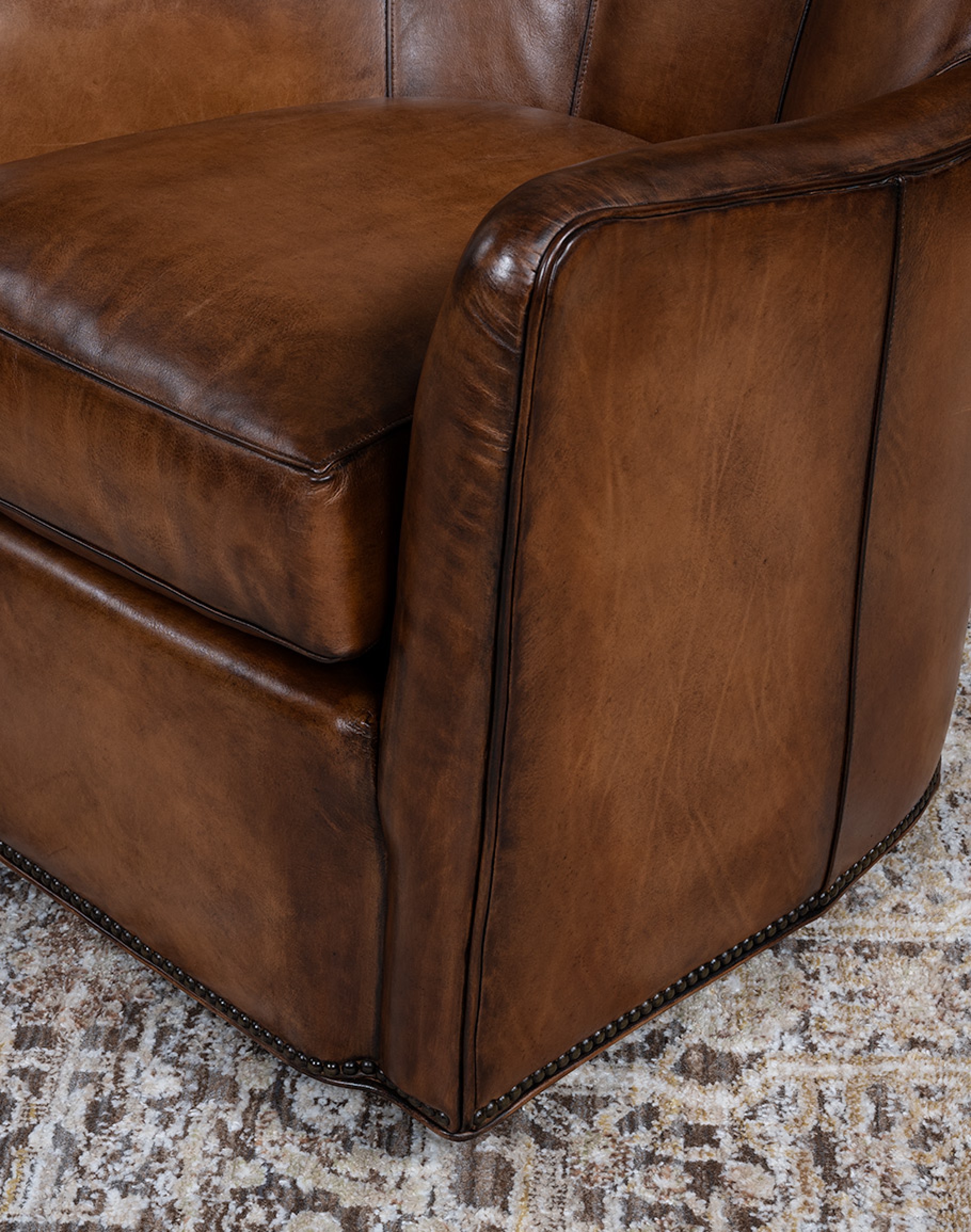 Medium brown, hand-burnished leather stretched over premium cushioning and a fine, durable frame defines the Crockett Swivel Chair. This fine piece of upscale furniture includes beautiful hand burnished detailing in the leather and a clean, robust design. The Crockett Swivel Chair also features nail head accents that complement and accentuate the supple, tones of the leather coverings. This piece is an excellent example of fine rustic design. The Crockett Swivel Chair pairs perfectly with a wide range of décor schemes, thanks in large part to its clean, simplistic design and high construction quality. This chair is a subtle, functional accent piece that would be perfectly at home in a room pursuing a luxurious aesthetic. There’s no shortage of ways this comfortable, well-designed and attractive piece of furniture can edify your home. 100% American Made to the highest standards of quality and craftsmanship.