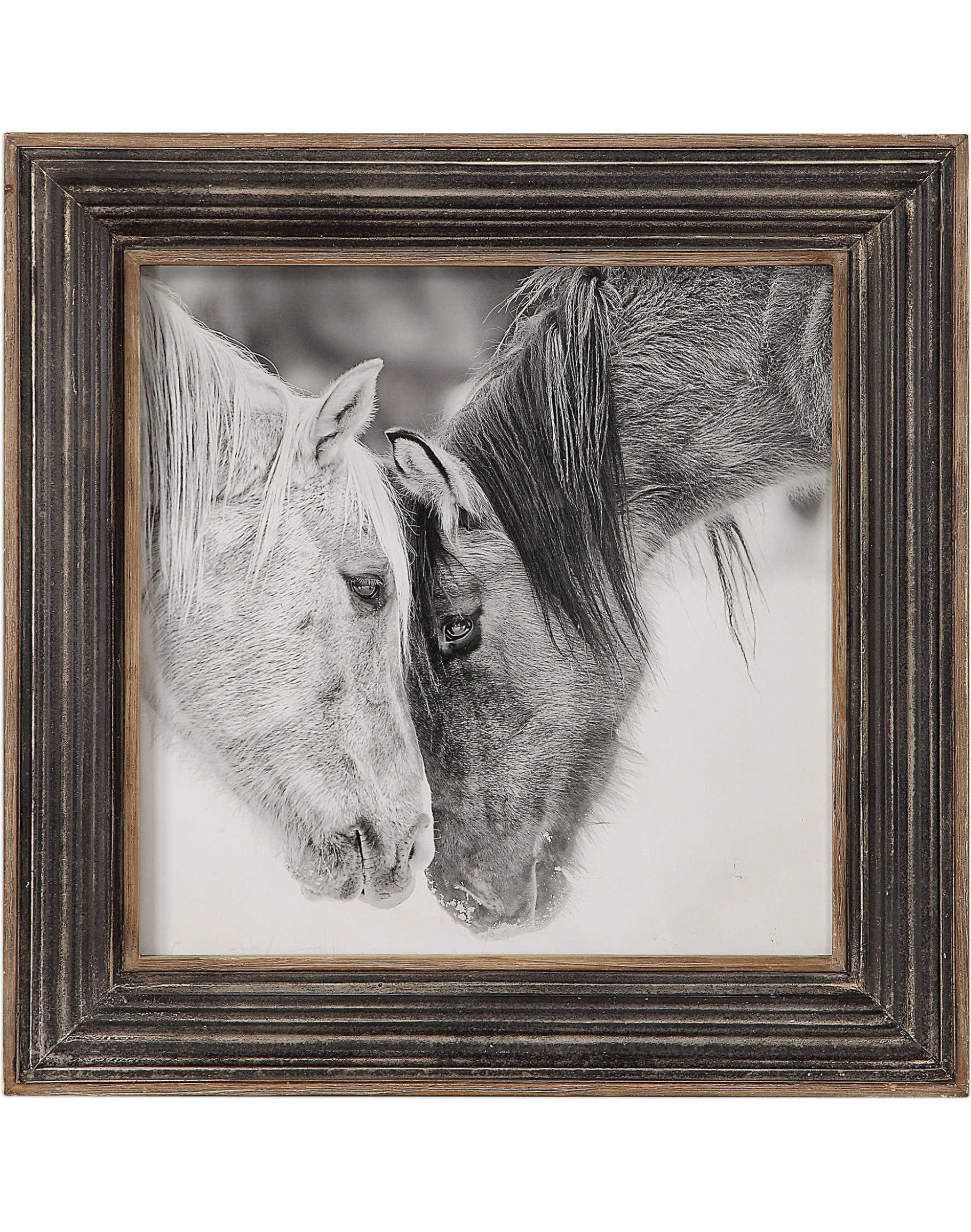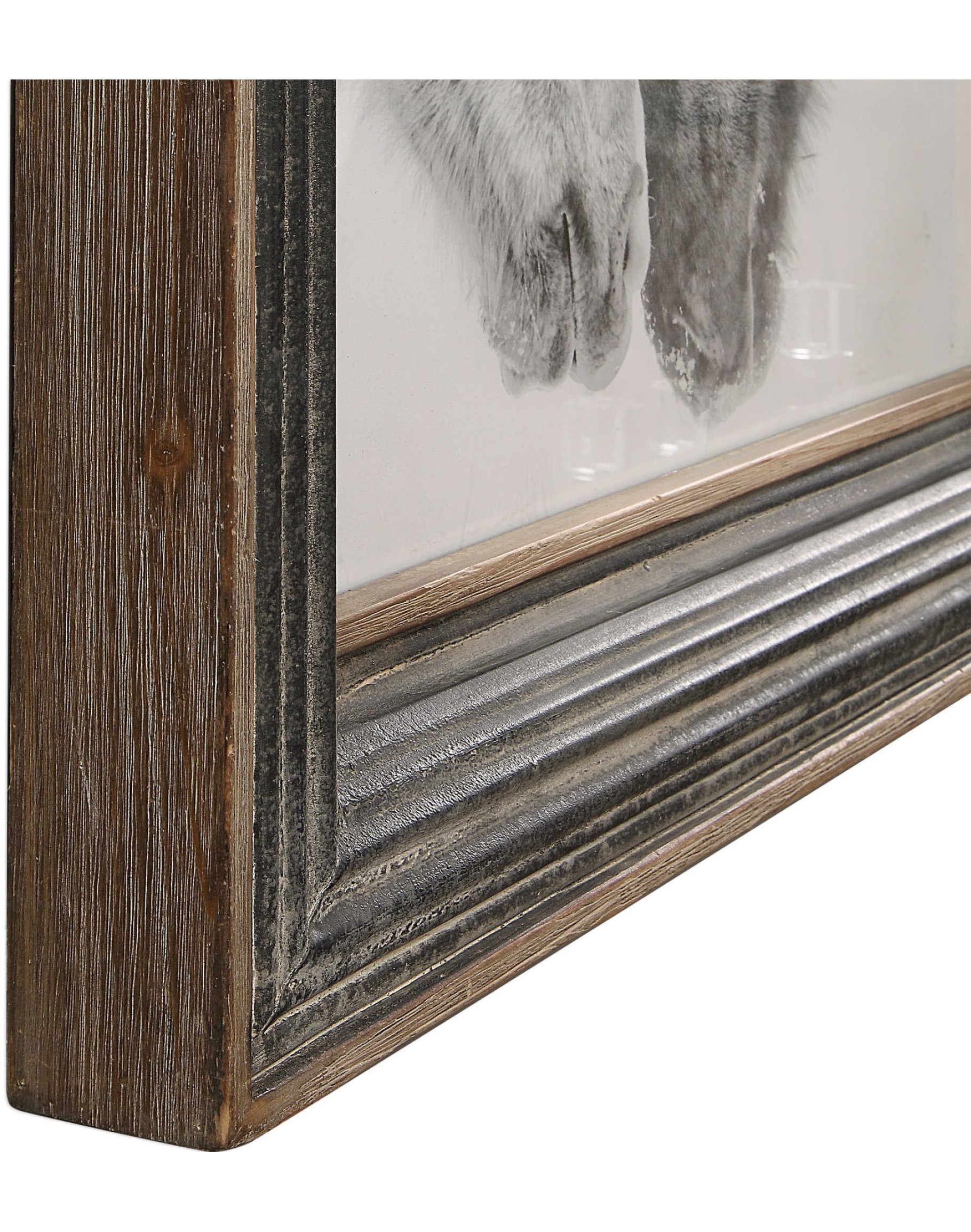 Rustic charm is added to a design with this black and white printed photograph. The transitional animal print is surrounded by a distressed wood and metal frame with corrugated style ridges. A distressed black finish and gray wash adds dimension to this piece. This print is placed under protective glass.