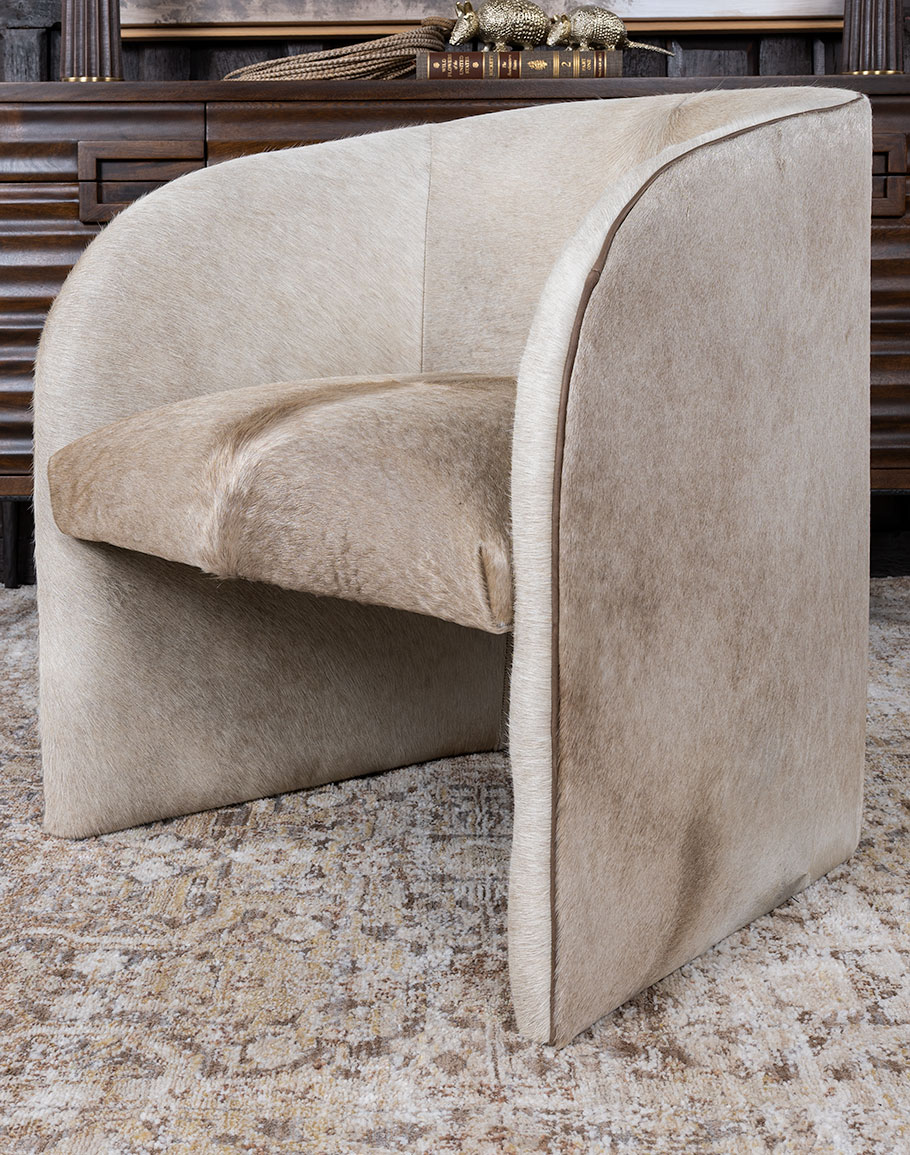 he Dallas Blonde Cowhide Chair is a sculptural blend of modern design and rustic luxury. Upholstered in premium upholstery-grade cowhide in a natural blonde tone, each chair features one-of-a-kind hide variations that bring warmth and texture to any space. Handcrafted in the USA, it includes a tight seat back and a spring-foam seat cushion for lasting comfort and support. Trimmed in top grain leather welt, this chair delivers tailored sophistication from every angle. Perfect for refined ranch interiors, western modern spaces, or upscale lounges.At Adobe Interiors, we create the furniture, and you create the memories