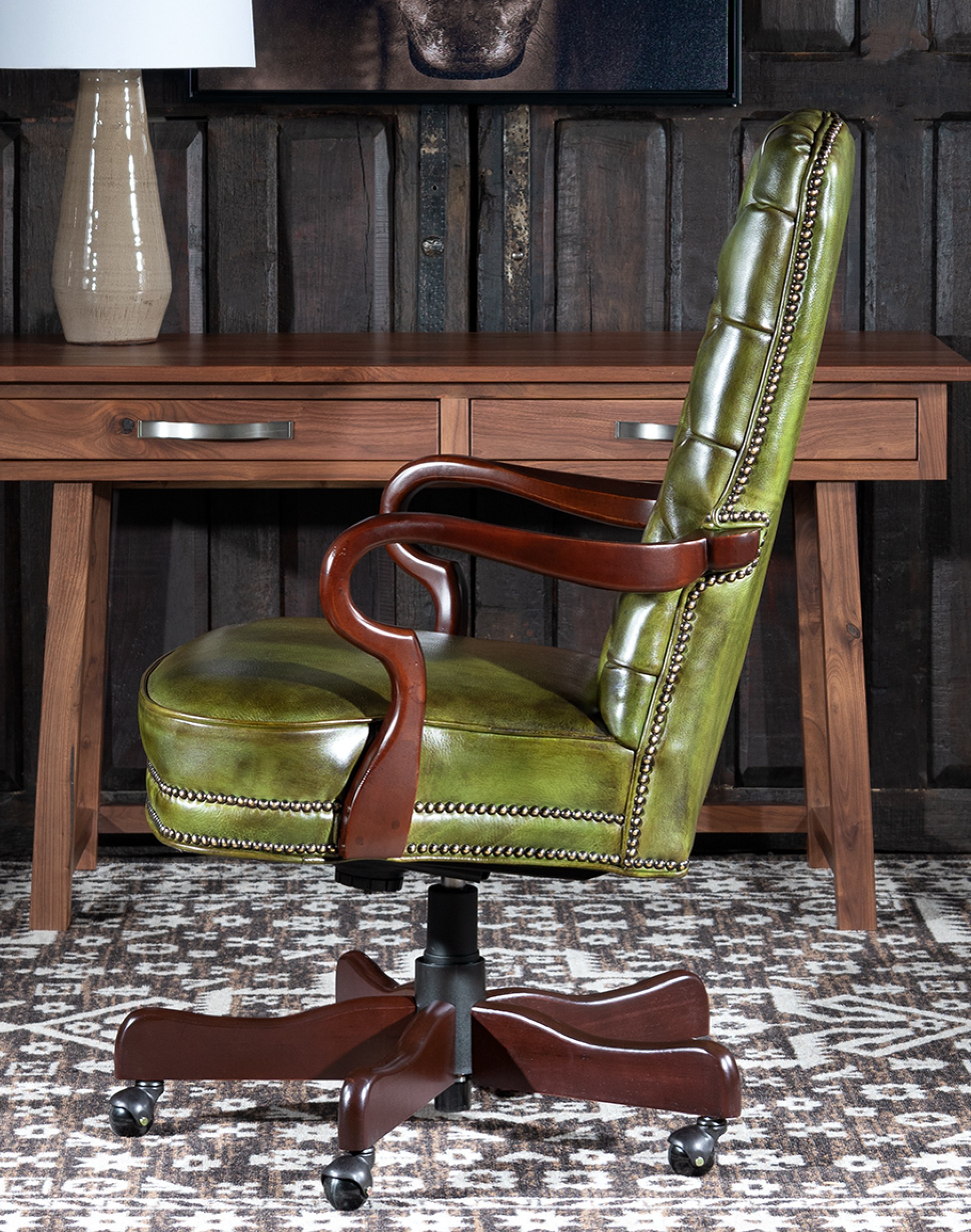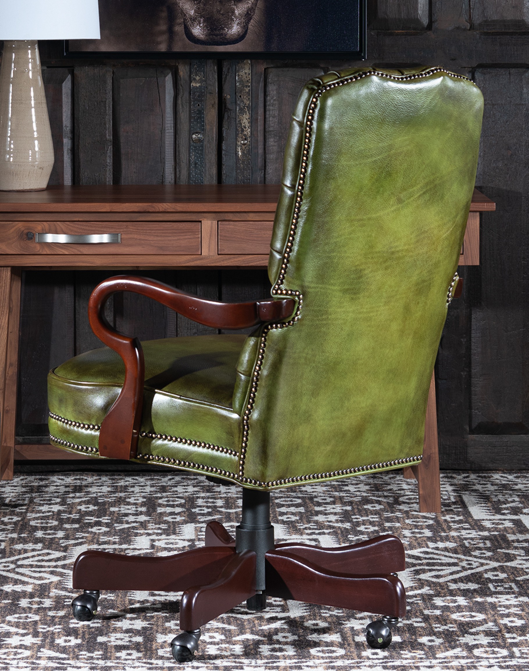 Enhance your office with the Dalton Green Executive Desk Chair. Crafted in America with full-grain leather and elegant hardwood, this luxurious chair combines supreme comfort with impeccable style. Upholstered in premium full-grain leather, the chair features exquisite hand-burnished details that enhance its sophisticated look and feel. Designed with your comfort in mind, the chair allows you to work for hours without discomfort, making it an ideal choice for professionals who value style and functionality. The Dalton Green Executive Desk Chair symbolizes American craftsmanship and refined style. This 100% American-made chair is constructed to the highest standards, ensuring lasting durability and comfort. As at home on the ranch as in an urban setting, this chair exemplifies a Classic and Refined Ranch style. At Adone Interiors, we create the furniture, and you create the memories.