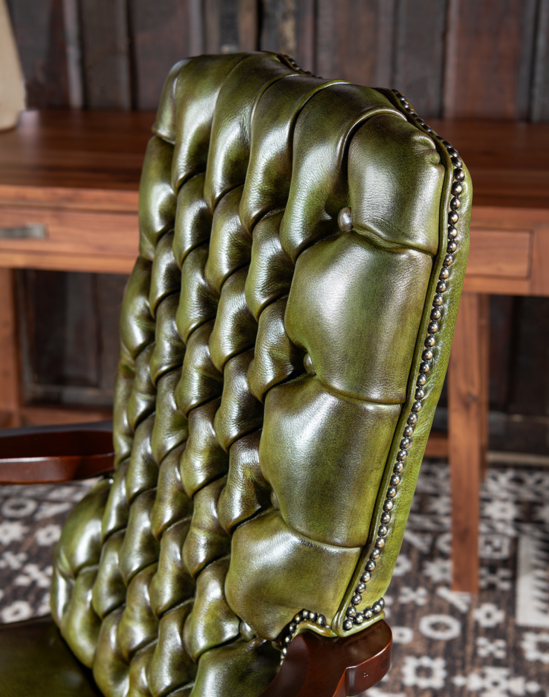 Superior Materials: Upholstered in premium full-grain leather, the chair features exquisite hand-burnished details that enhance its sophisticated look and feel.