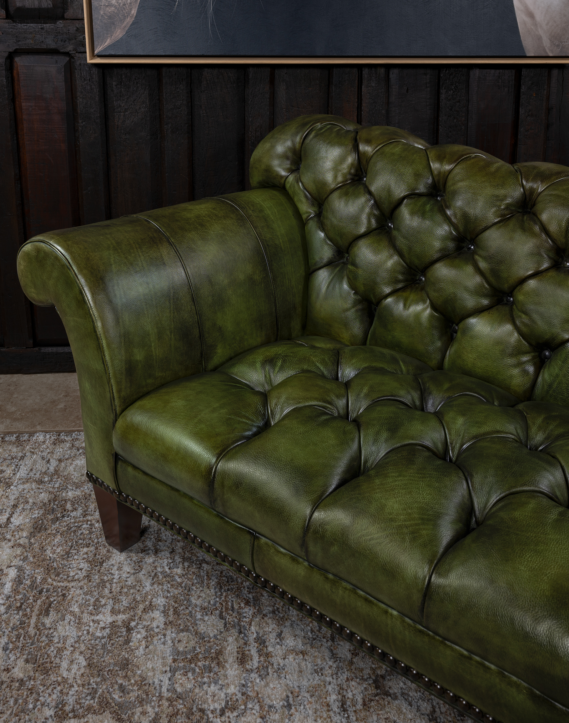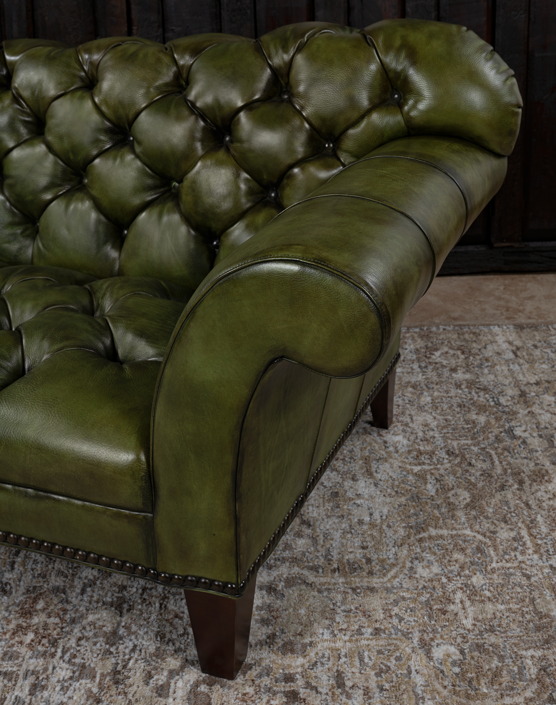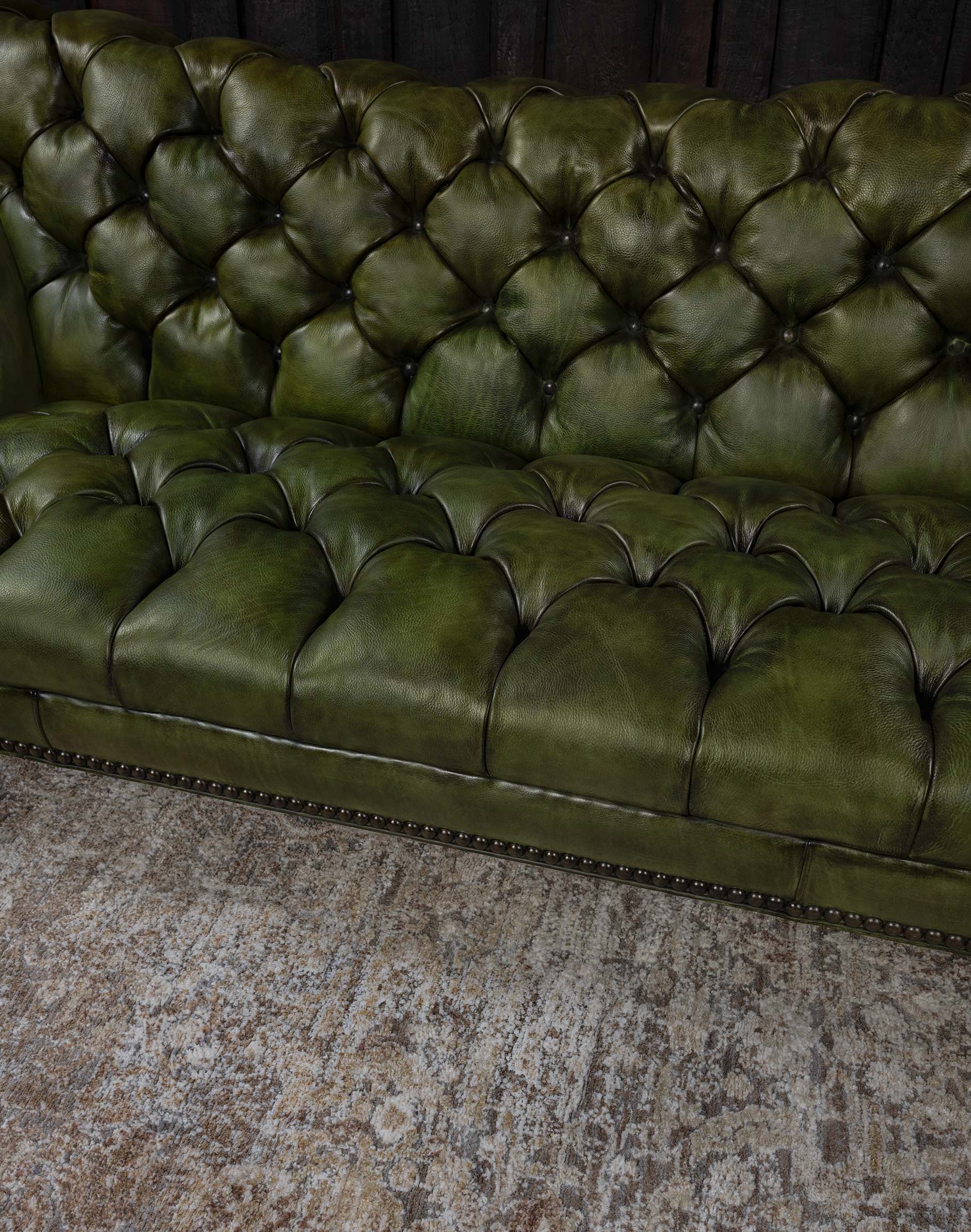 Our Daphne Leather Chesterfield Sofa is a classy, timeless piece of furniture that dominates décor and conversations. This hand-tufted couch is every bit as fashionable as it is glamorous! The Daphne Chesterfield Sofa features an elegantly curving design that echoes some of the finest natural patterns. Rich, natural and beautiful olive green leather makes this couch the perfect addition to any home pursuing an upscale Western aesthetic. The Daphne Chesterfield Sofa is a prime example of the quality possible with hand-crafted furniture. Our signature hand antiqued leather gives this unique high-end sofa a patina of timeless elegance. Because of its distinctive shape and versatile finishing material, the Daphne Chesterfield Sofa is a welcome addition to virtually any sitting room or living room. This beautiful piece of leather furniture pairs well with almost any interpretation of the fine rustic aesthetic. It exudes luxury, yet can be paired with virtually any design aesthetic thanks to its simple, timeless design.