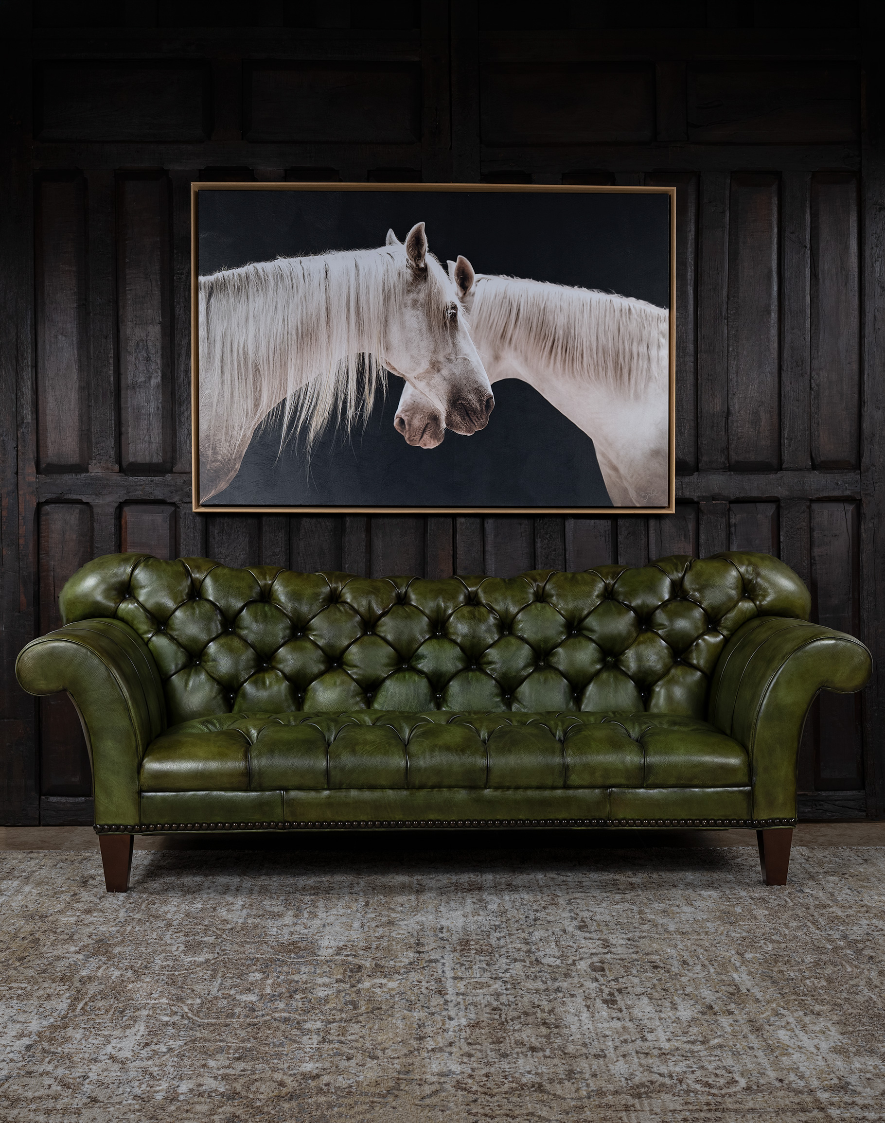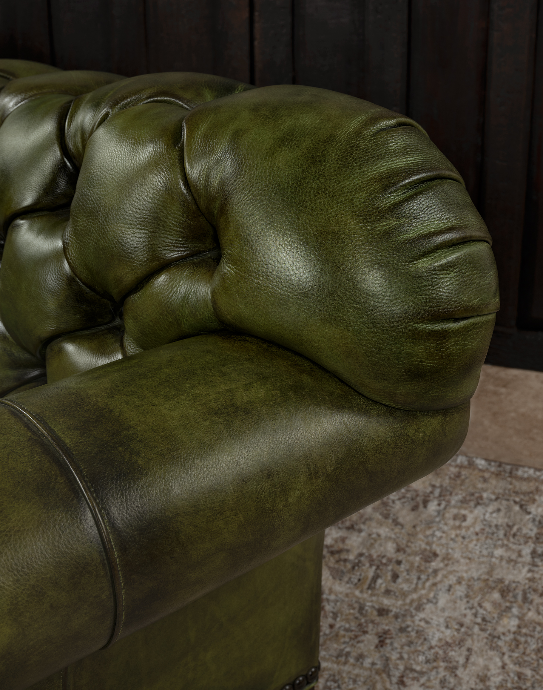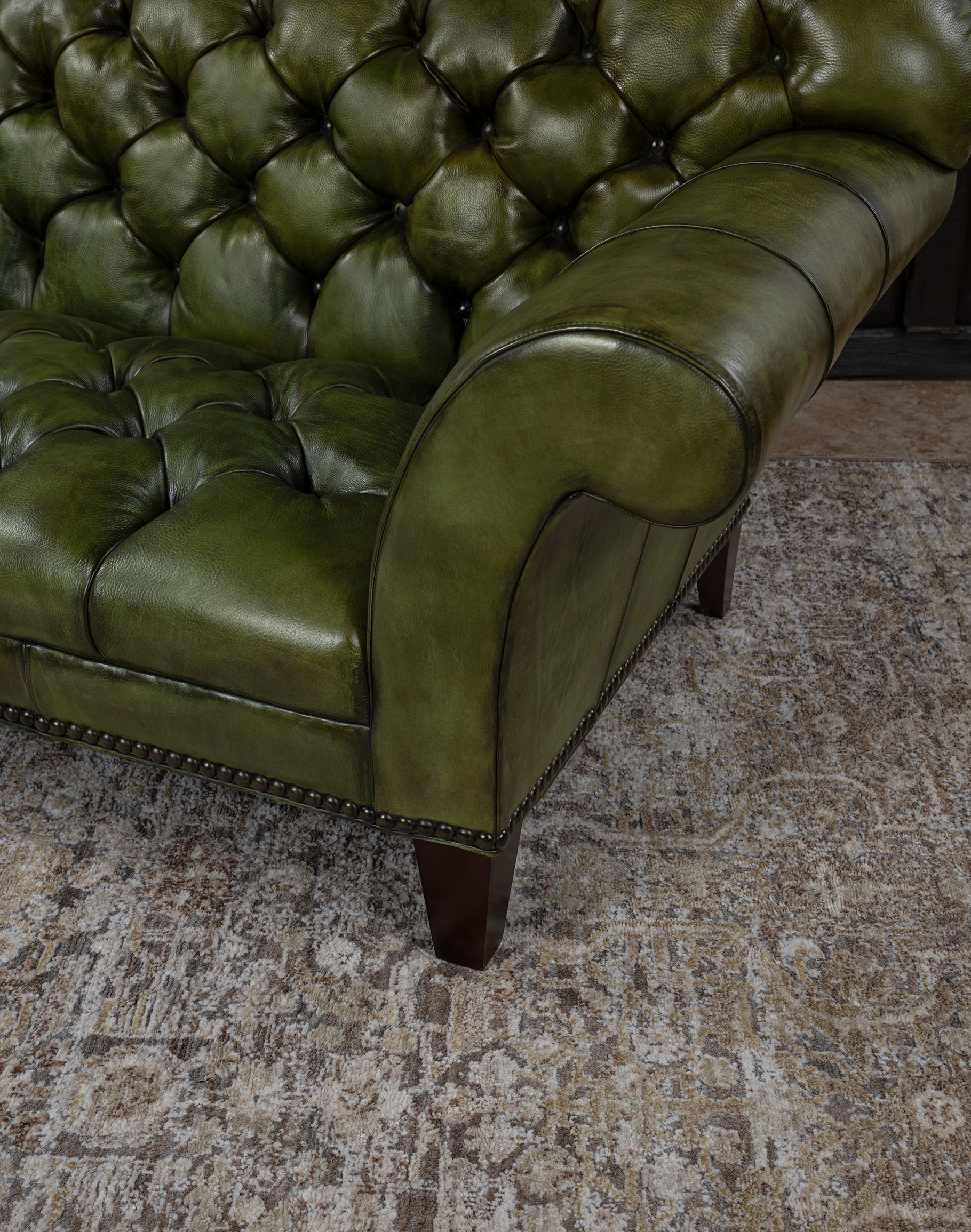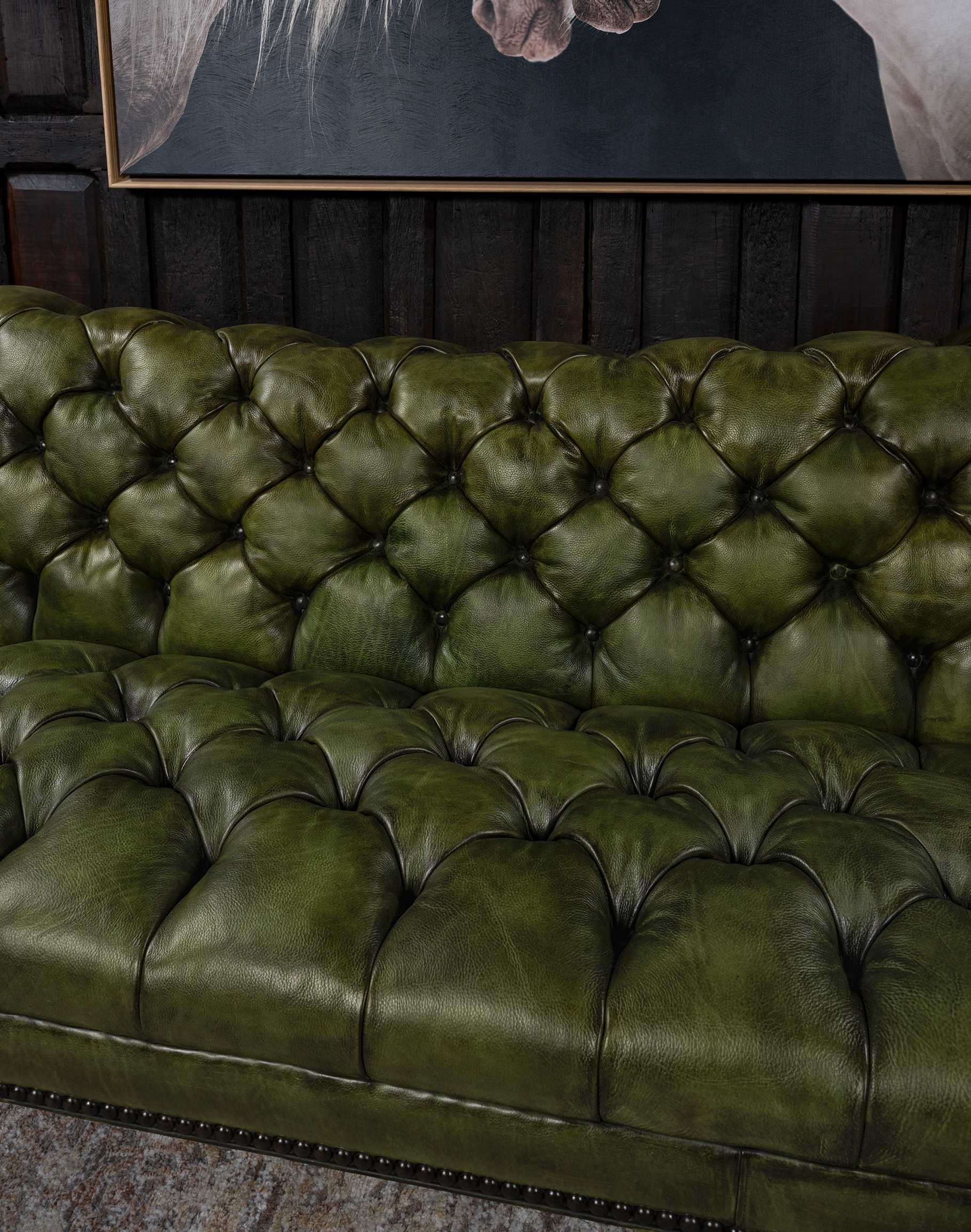 Our Daphne Leather Chesterfield Sofa is a classy, timeless piece of furniture that dominates décor and conversations. This hand-tufted couch is every bit as fashionable as it is glamorous! The Daphne Chesterfield Sofa features an elegantly curving design that echoes some of the finest natural patterns. Rich, natural and beautiful olive green leather makes this couch the perfect addition to any home pursuing an upscale Western aesthetic. The Daphne Chesterfield Sofa is a prime example of the quality possible with hand-crafted furniture. Our signature hand antiqued leather gives this unique high-end sofa a patina of timeless elegance. Because of its distinctive shape and versatile finishing material, the Daphne Chesterfield Sofa is a welcome addition to virtually any sitting room or living room. This beautiful piece of leather furniture pairs well with almost any interpretation of the fine rustic aesthetic. It exudes luxury, yet can be paired with virtually any design aesthetic thanks to its simple, timeless design.