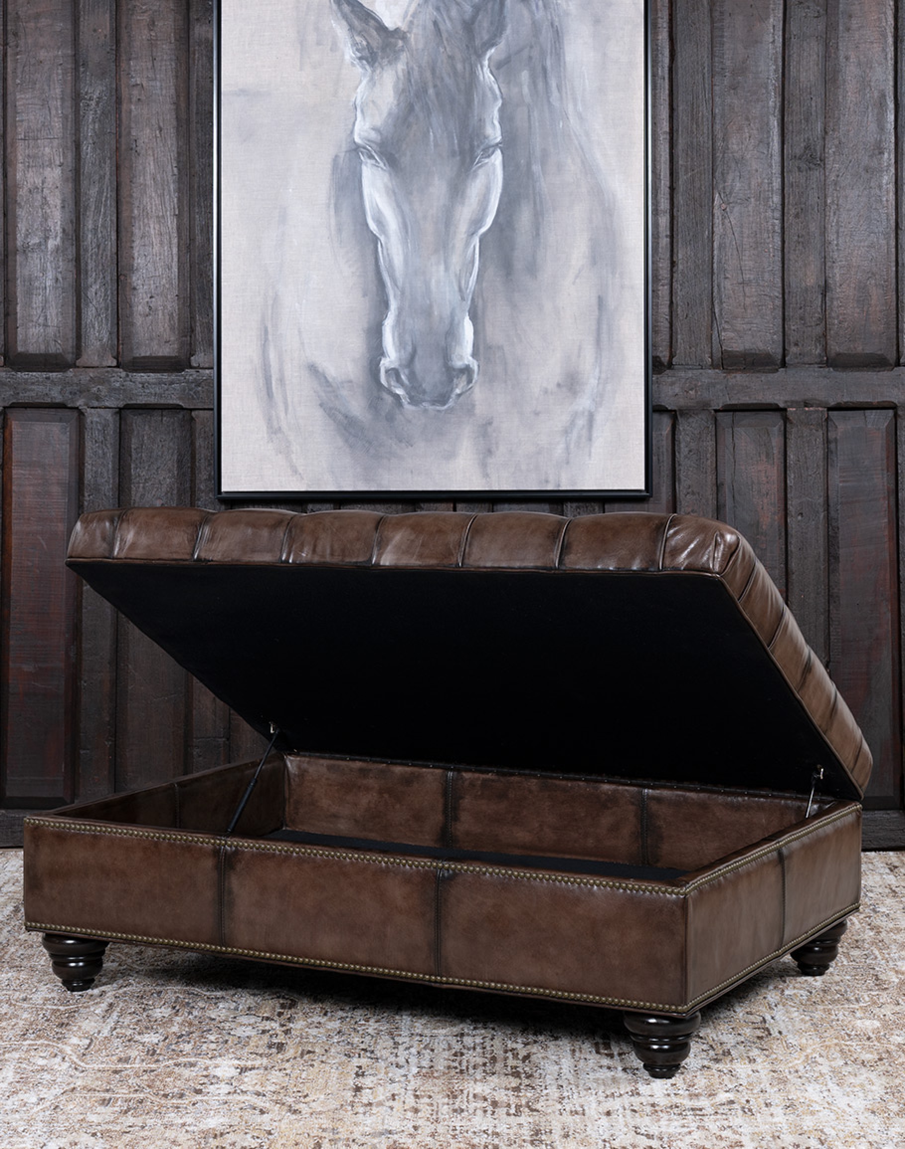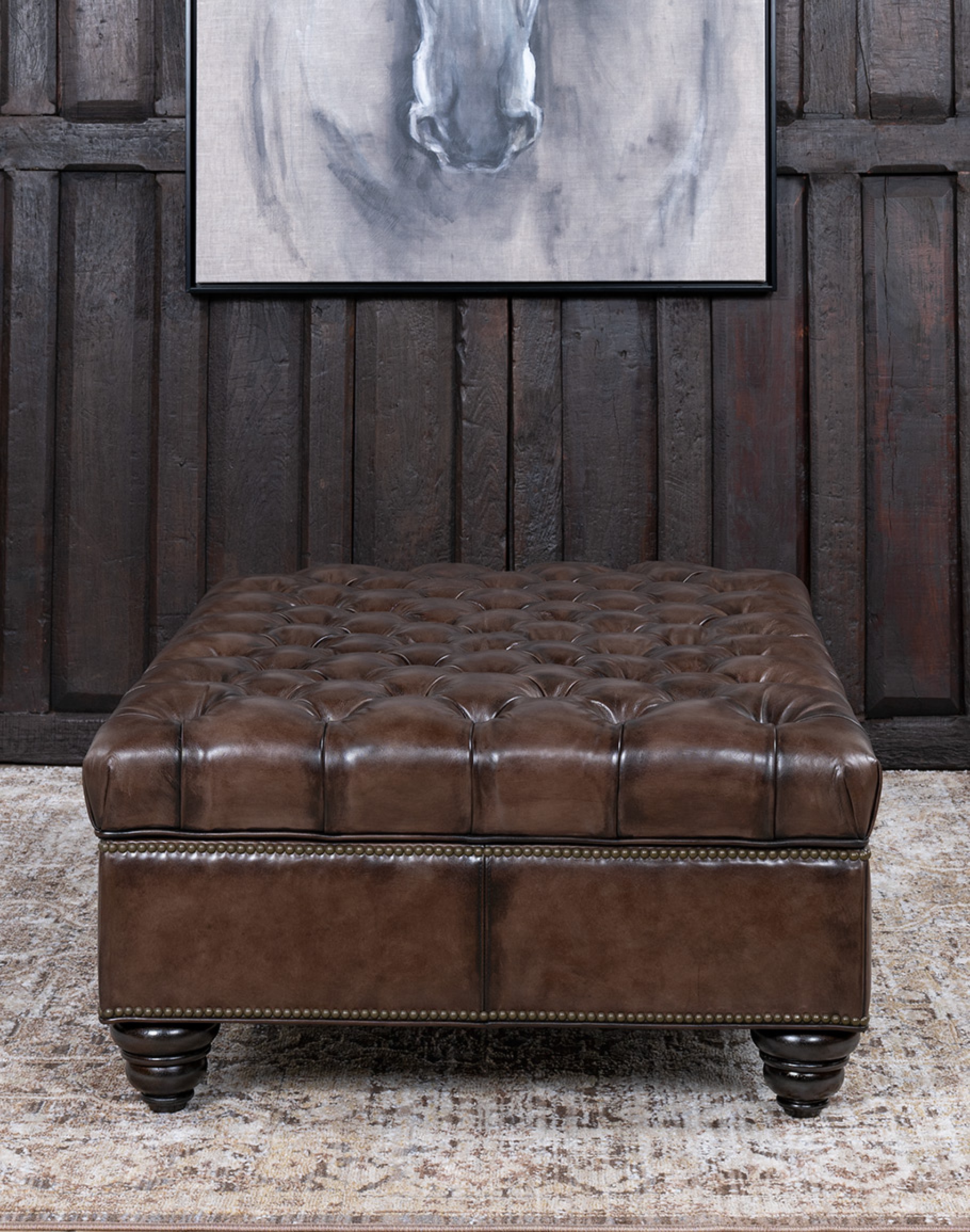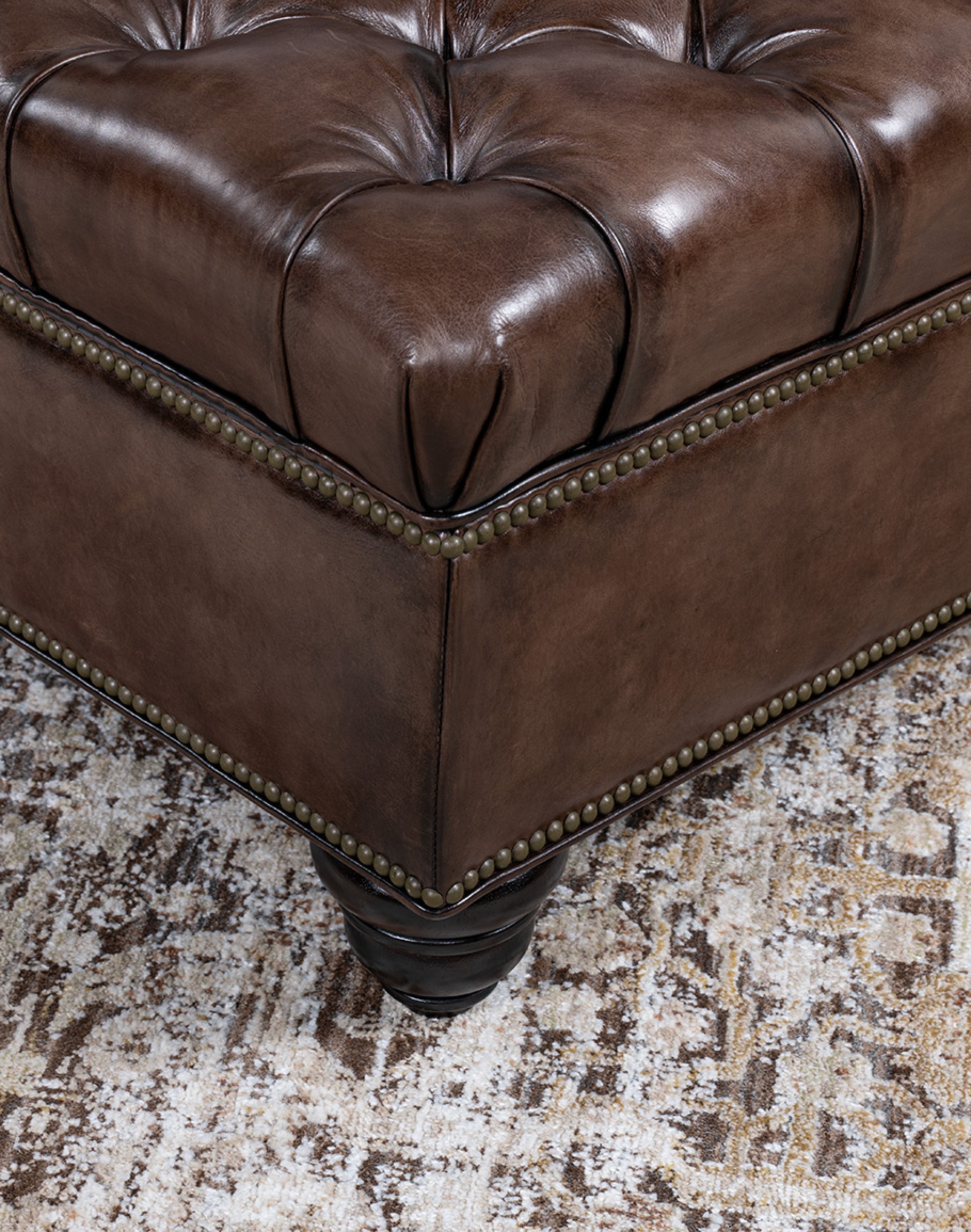 Crafted with a solid hardwood frame, wrapped in full-grain leather in a rich smoke brown hue, the surface features deep diamond tufting for a classic, tailored look. Antique brass nailhead trim outlines the silhouette, adding a refined Western touch that complements both traditional and transitional interiors. The turned wooden legs, finished in a deep espresso tone, provide a sturdy foundation while enhancing its elegant profile.
