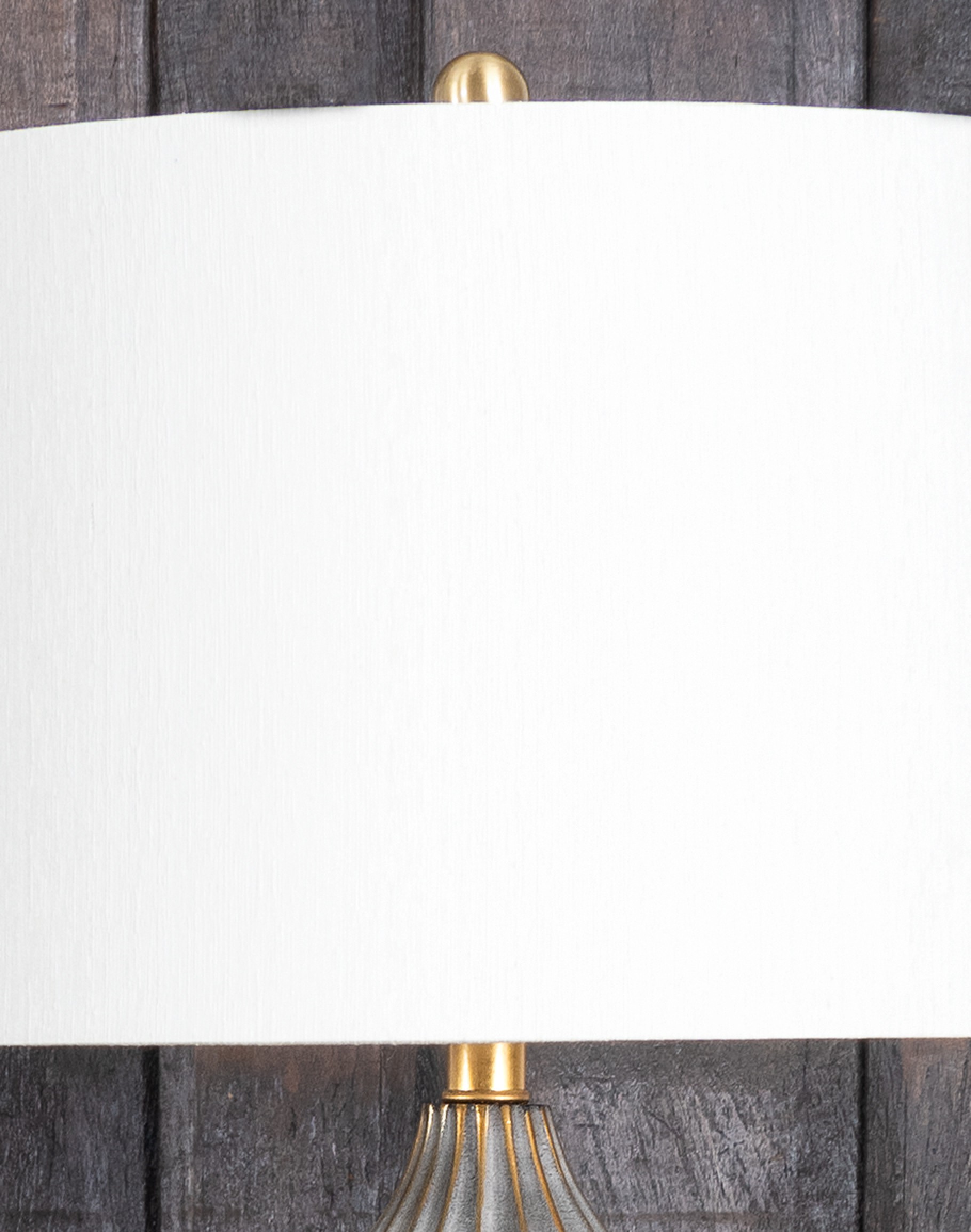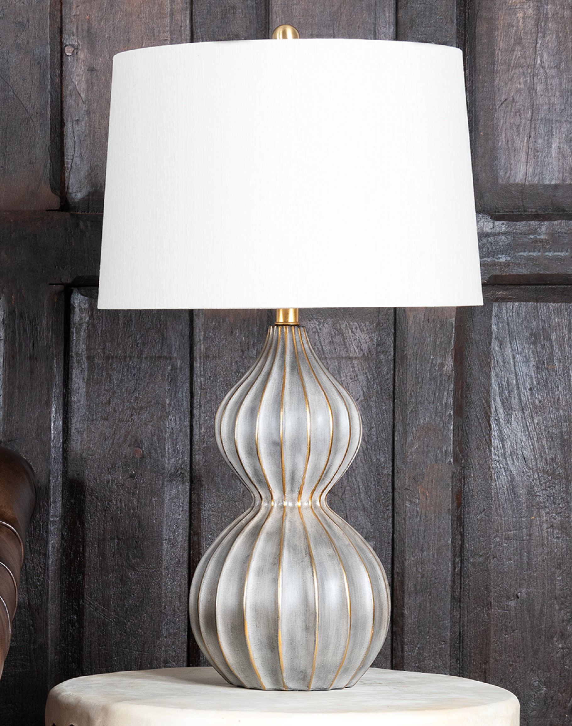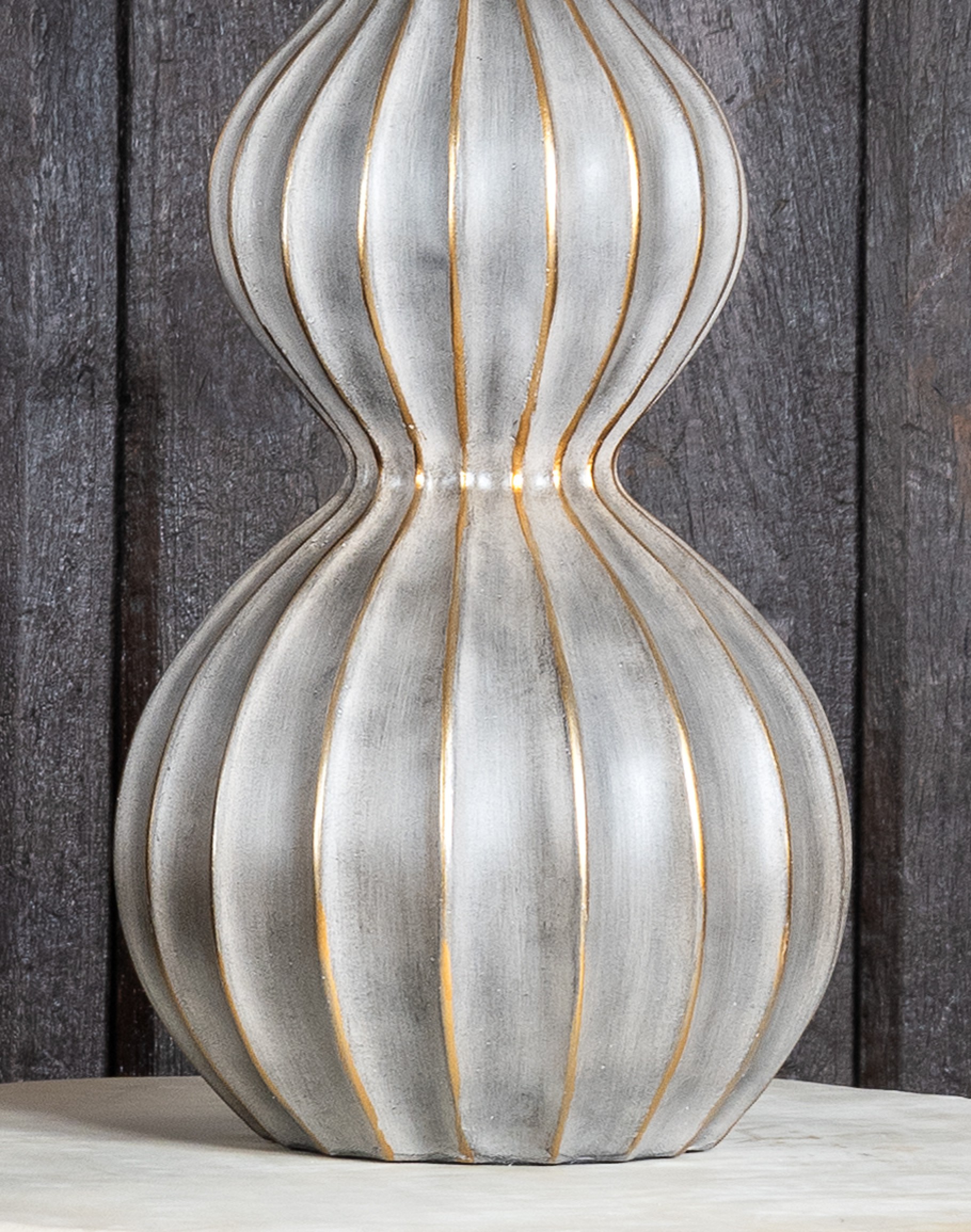 Introducing the Delphine Lamp, a masterpiece that seamlessly blends modern aesthetics with refined elegance. This stunning lamp features a fluted gourd cast composite base, exuding a bold and sophisticated vibe. The base is meticulously painted with natural concrete, imparting a masculine appeal that complements any contemporary setting. The antique gold ribbing adds a touch of opulence, creating a striking contrast against the off-white silkette drum shade.
