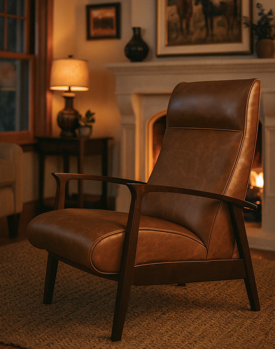 Introducing our Denali Leather Recliner, an exemplary blend of desert, refined, and eclectic ranch Western styles that are perfect for those seeking a comfortable, stylish, and incredibly cozy seating option within limited spaces. This exemplary piece of modern rustic design features a sleek silhouette with tapered exposed wood arms paired with premium leather upholstery that exudes a contemporary aesthetic. The luxurious pull-up leather of the recliner will acquire a gorgeous patina over time, adding to its already exquisite appeal. Crafted with utmost precision and care, this elegant leather recliner is proudly 100% American-made, adhering to the highest standards of quality and craftsmanship. Its plush cushioning and expertly designed reclining mechanism ensure the utmost comfort, making it the perfect addition to any home or office. It is certain to become a treasured favorite of your family and friends. At Adobe Interiors, we create the furniture, and you create the memories.