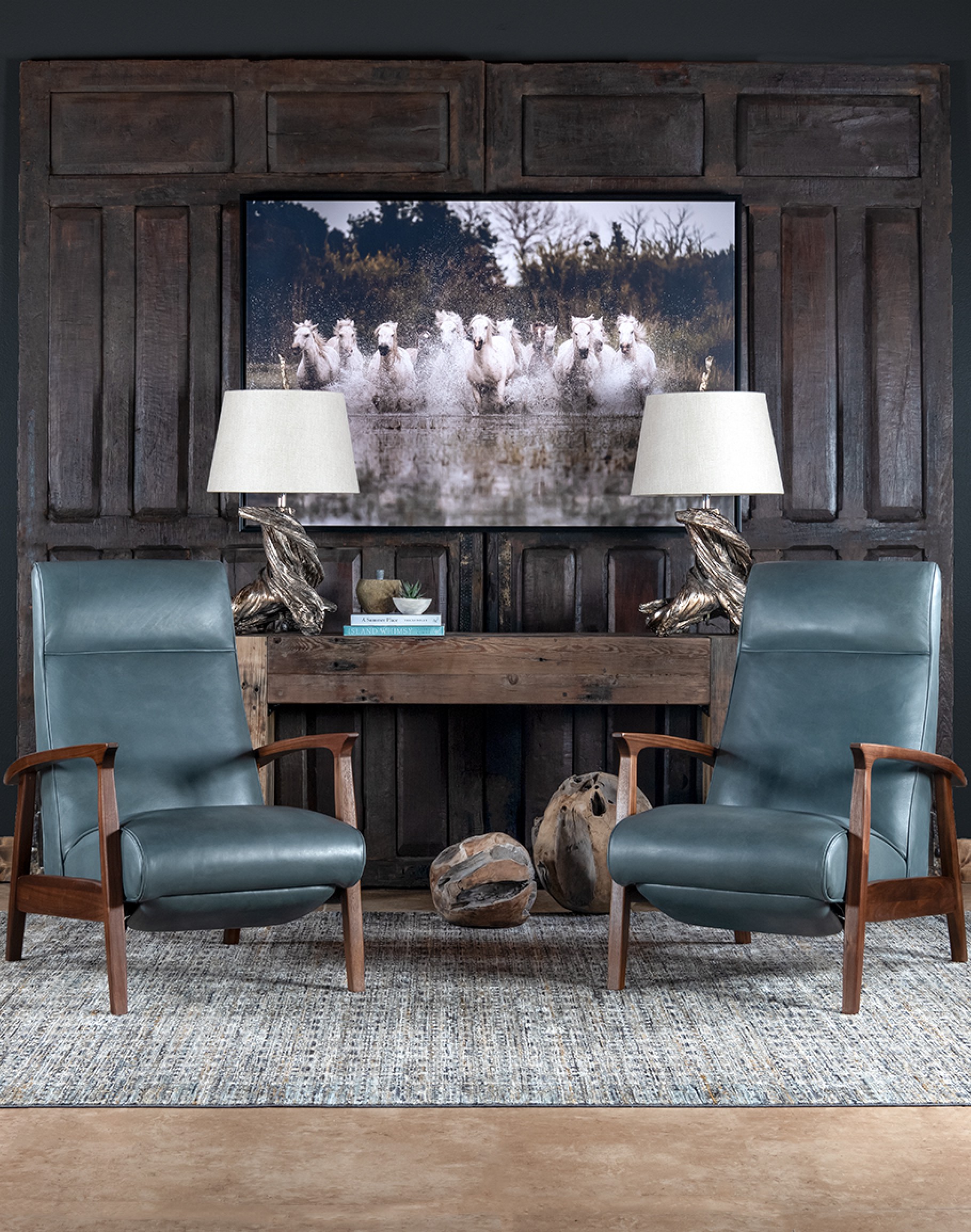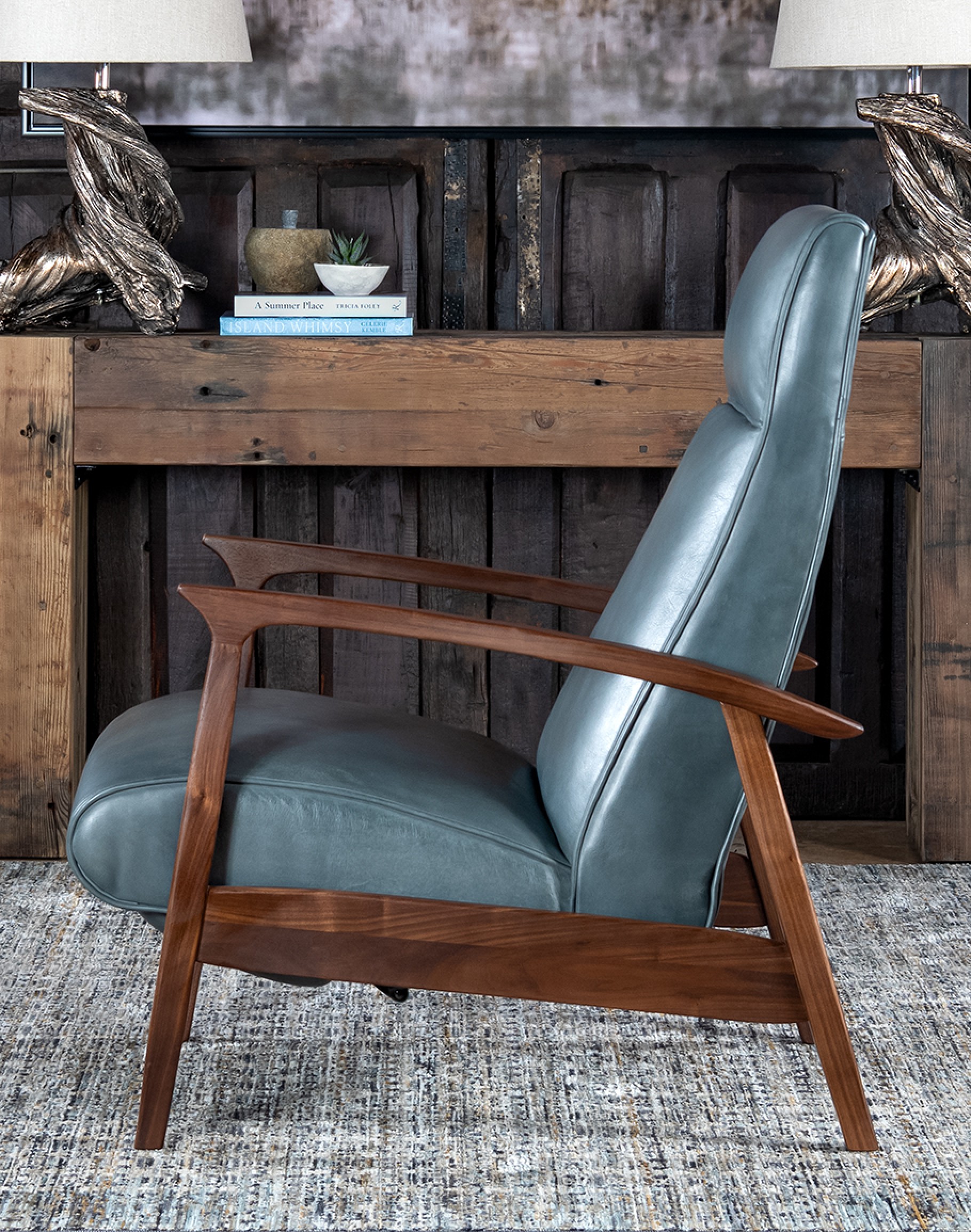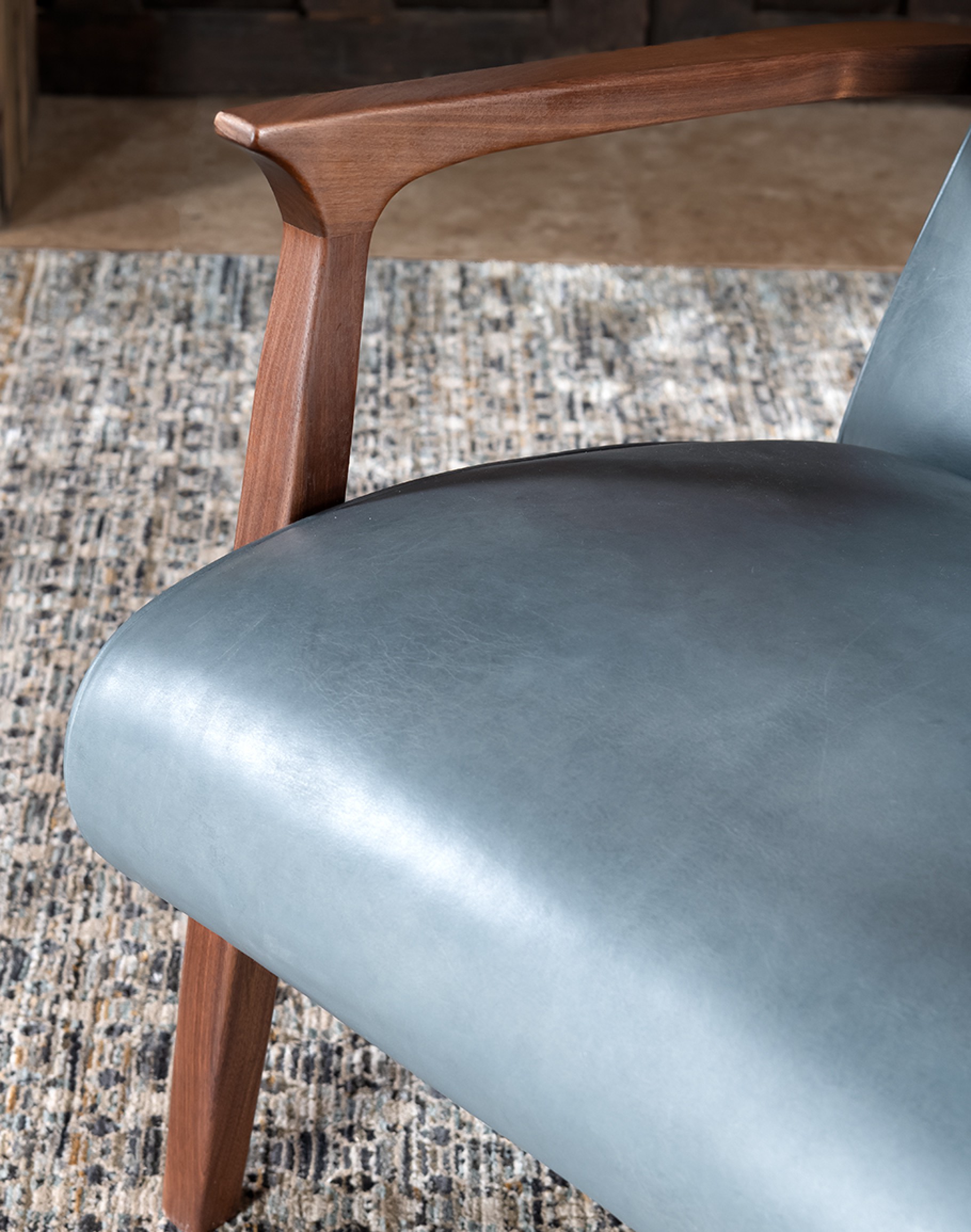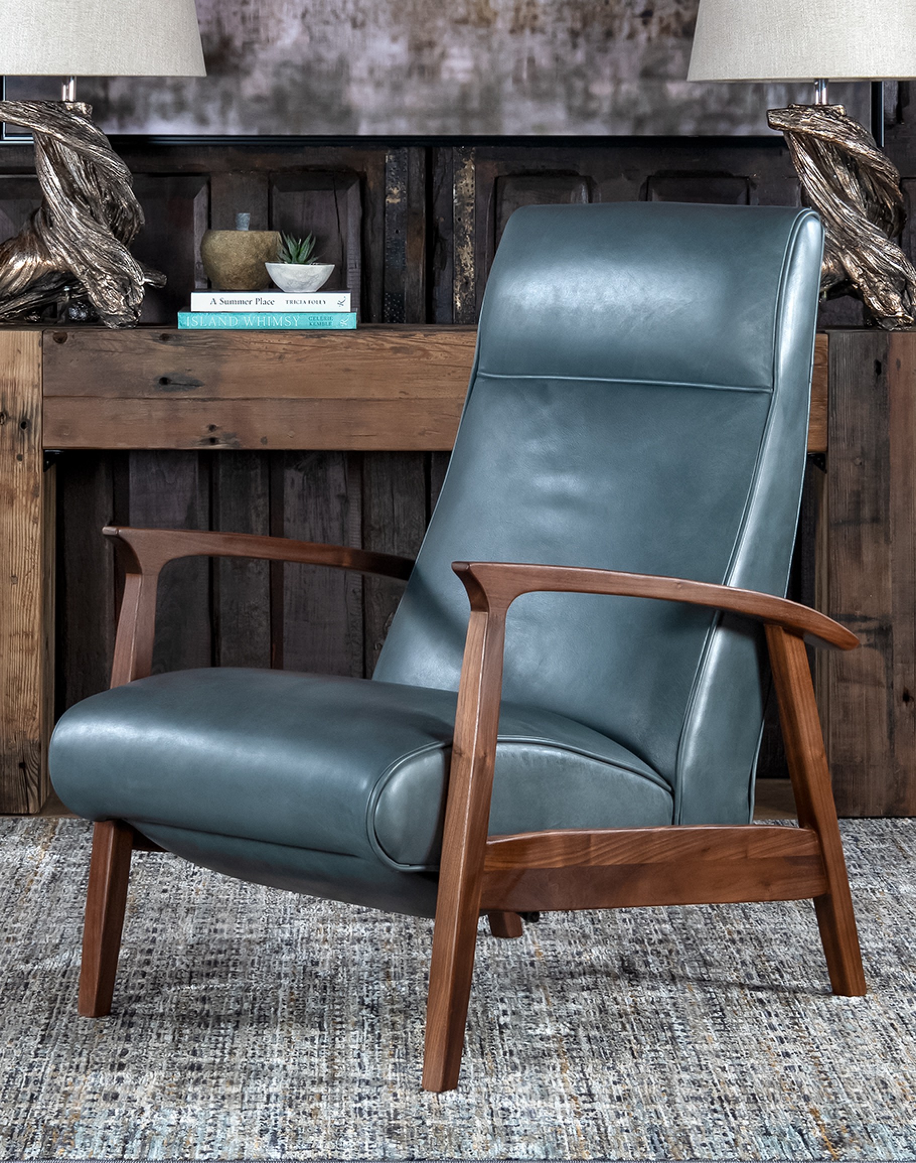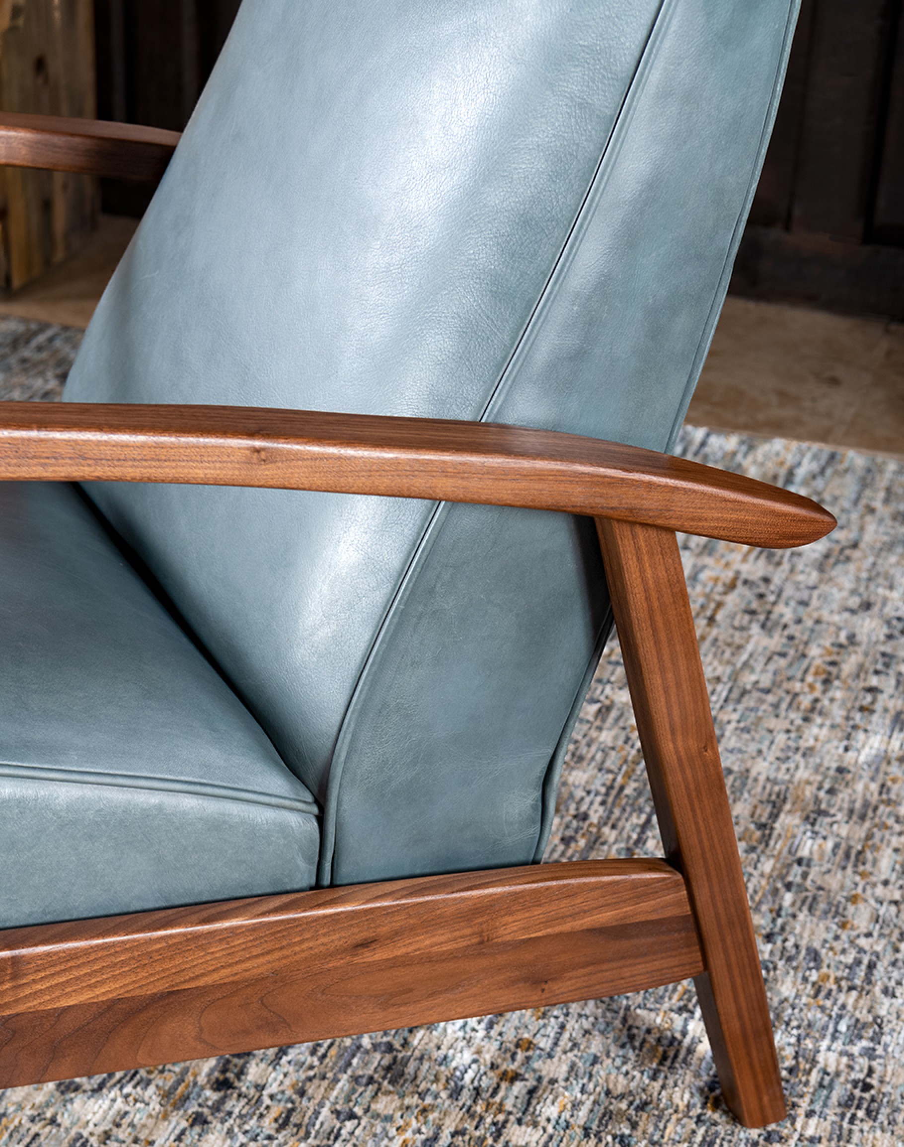 Introducing the Denali Sky Leather Recliner, a masterpiece of American craftsmanship that perfectly balances elegance and comfort. This sleek and compact recliner is meticulously crafted from hand-burnished full-grain leather hides, offering a luxurious feel and unparalleled durability. The solid black walnut wood forms the sturdy base and beautifully sculpted arms, adding a touch of refined rustic charm to your living space. Designed with a bustle back, the Denali Sky Leather Recliner provides optimal head and neck support, ensuring superior comfort. Its compact design makes it an ideal choice for any living area, while its sophisticated style effortlessly complements Coastal Ranch and Refined Ranch interiors. Whether unwinding after a long day or enjoying a quiet moment, this recliner promises to be the perfect addition to your home. Elevate your interior with the Denali Sky Leather Recliner, where exquisite design meets unmatched comfort. At Adobe Interiors, we create the furniture, and you create the memories.