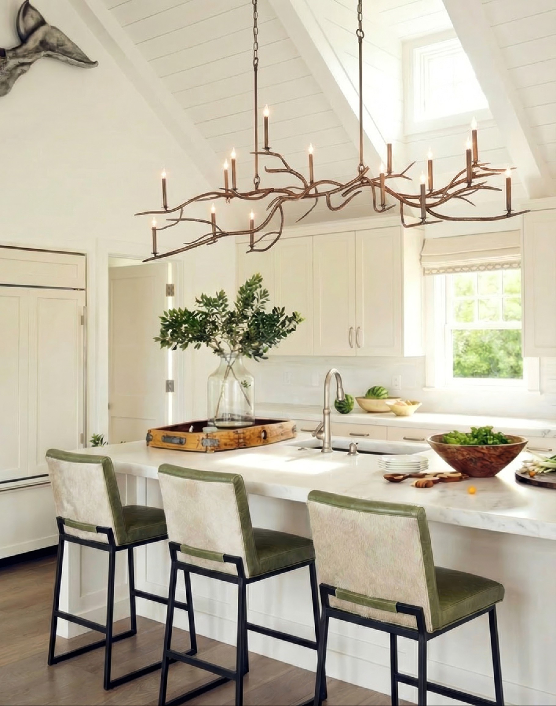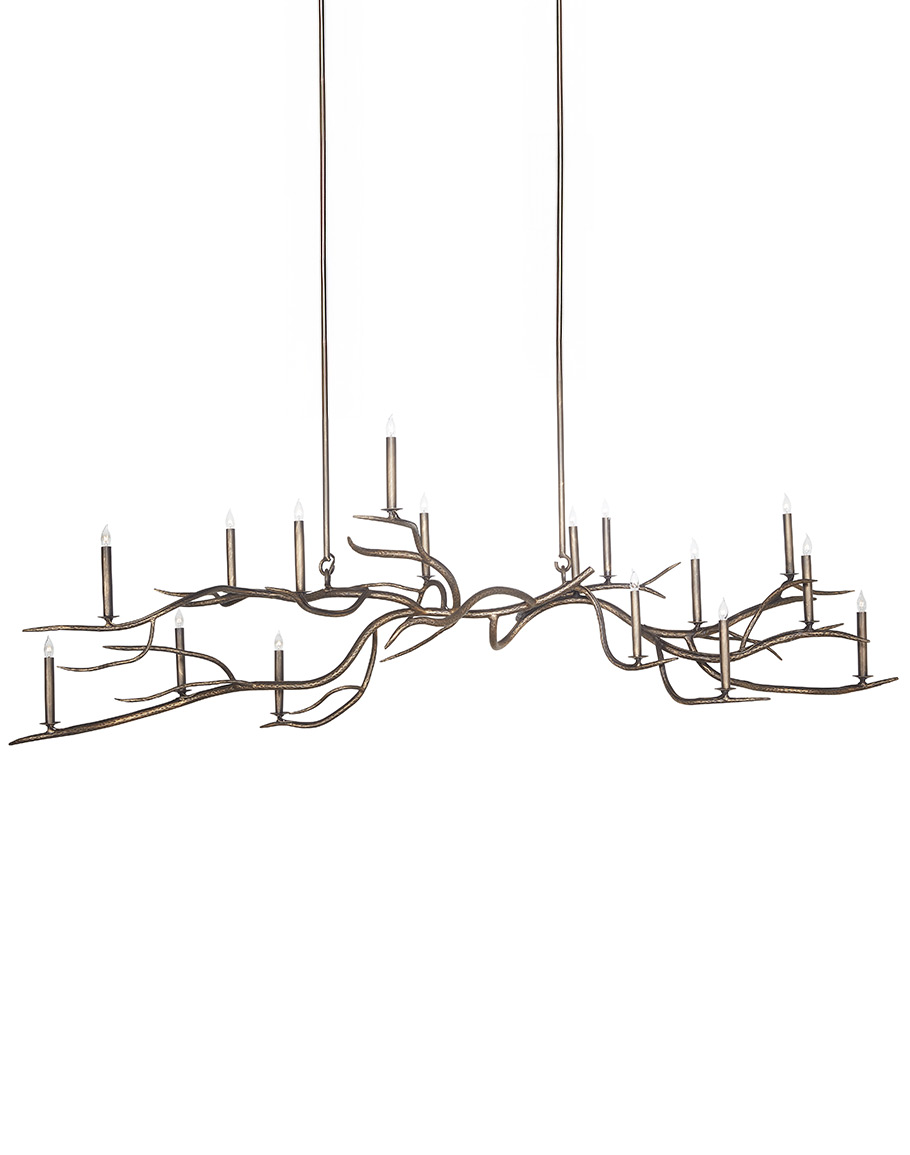 The Desert Branch Chandelier is crafted from solid iron with a warm, hand-applied antique bronze finish. Soft golden highlights catch on the hammered texture of each branch, while deeper bronze tones collect in the curves and folds, giving the fixture rich depth and dimension. From a distance it reads as a sophisticated dark bronze; up close you see the artisanal, hand-forged character that makes every piece unique.