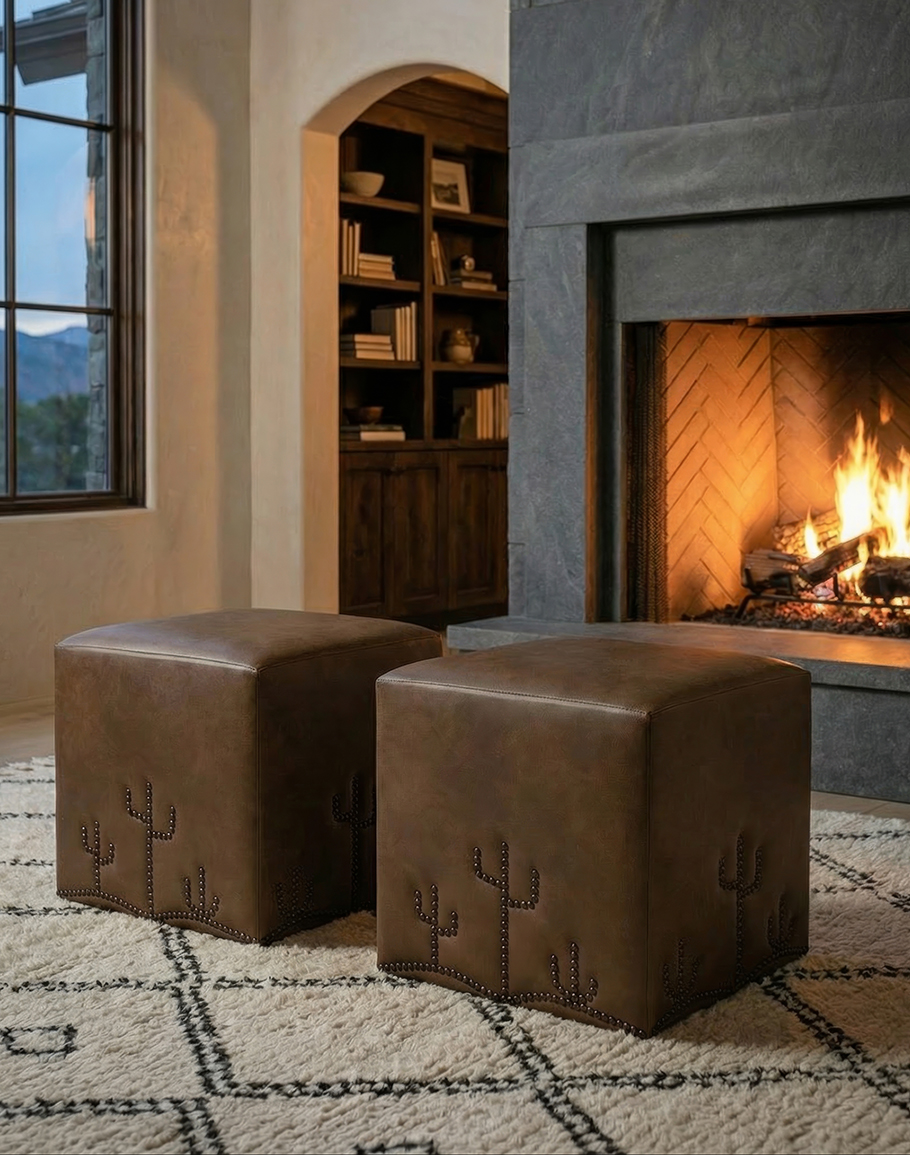 Part of Adobe Interiors’ Desert Ranch Collection, the Desert Cacti Leather Cube brings a subtle Western flair and handcrafted quality to any space.