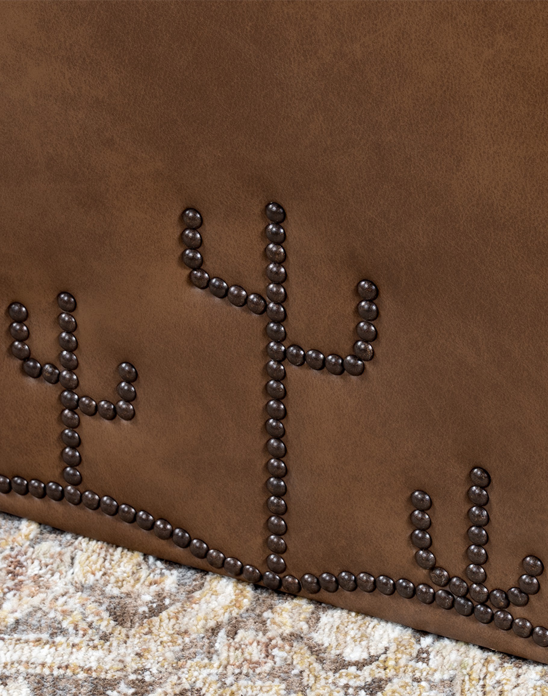 Upholstered in rich, full-grain leather, the cube is accented with hand-applied nailhead trim in a unique cactus motif on all four sides. Its clean lines and tailored silhouette make it a stylish and functional addition to living rooms, bedrooms, or entryways.