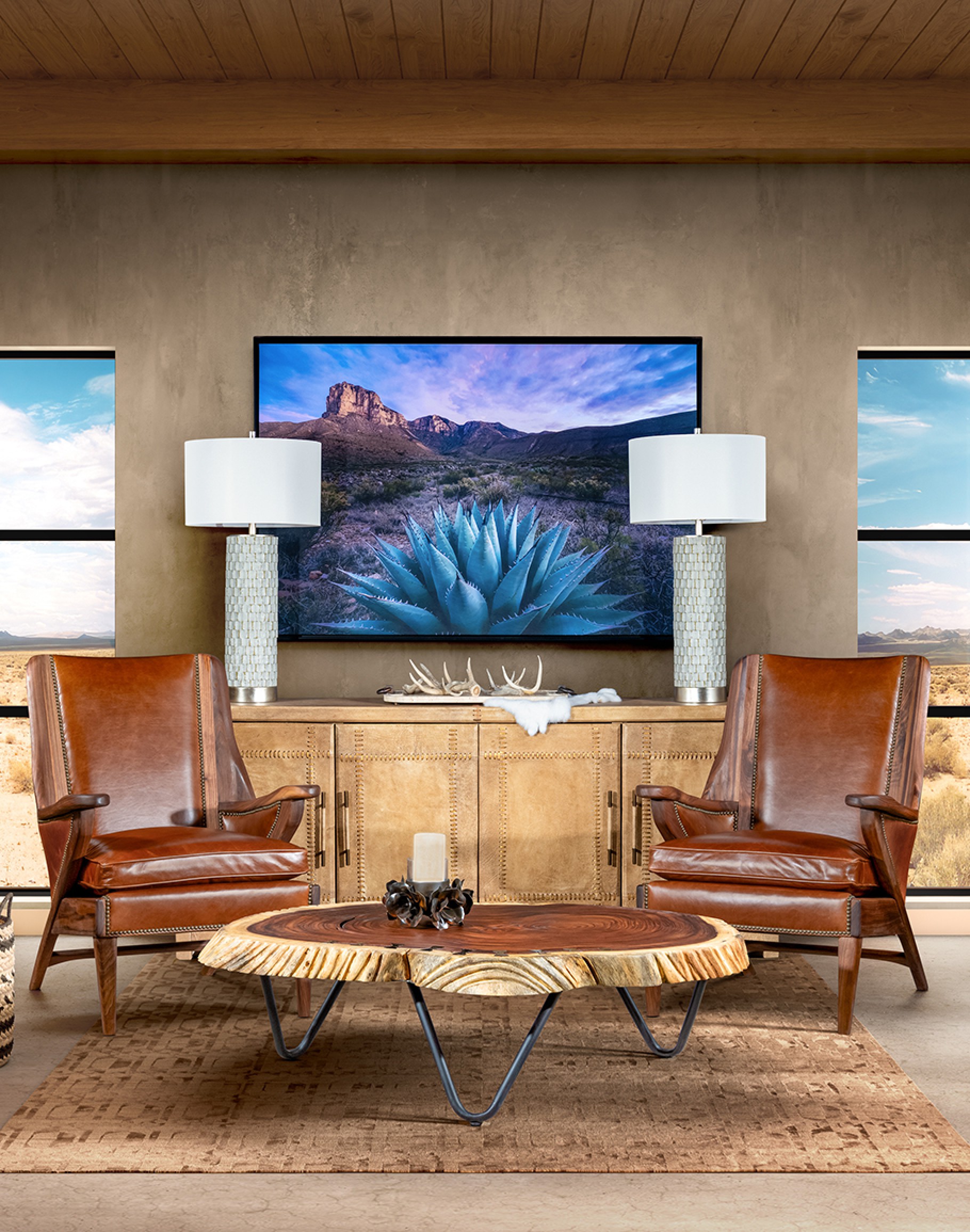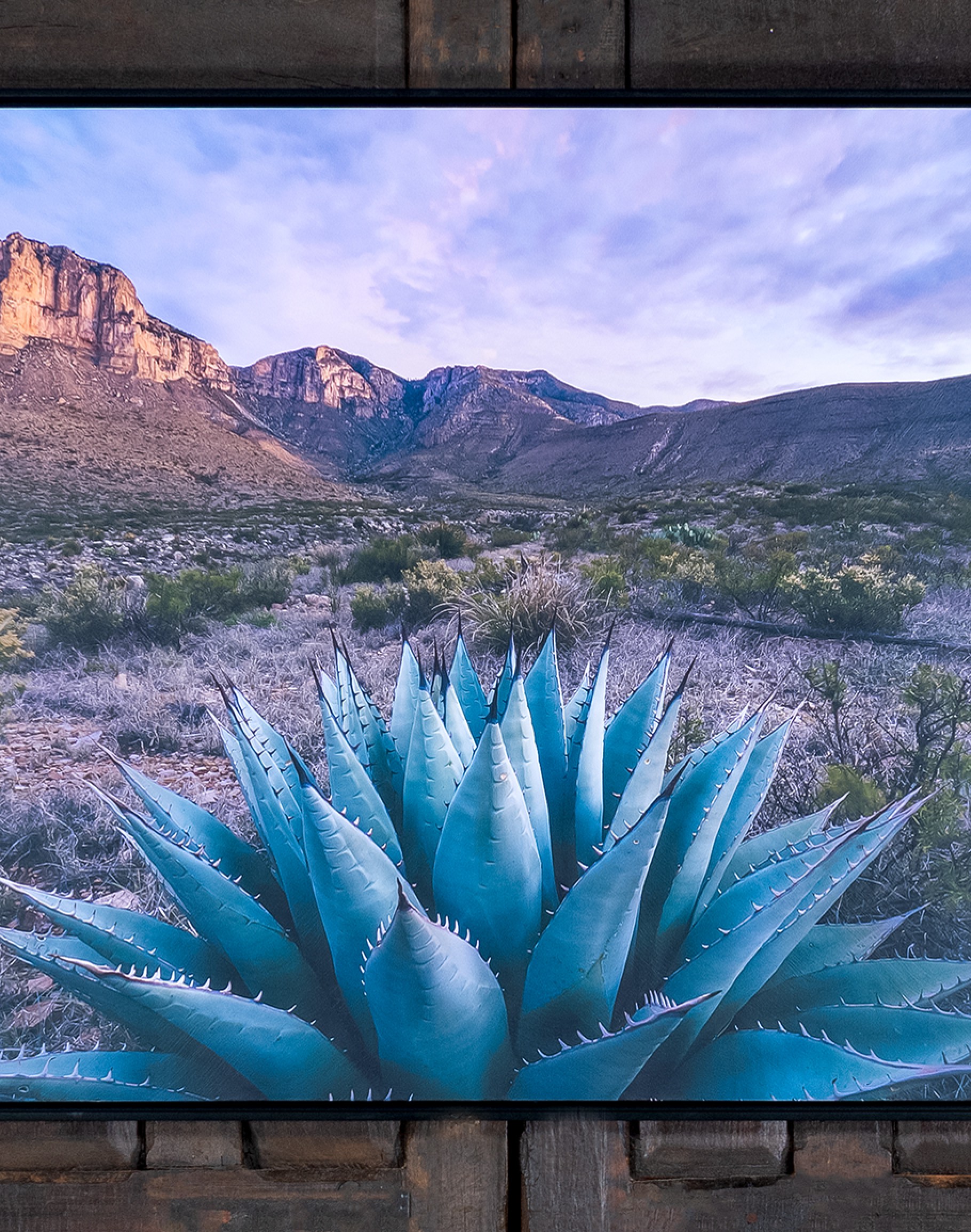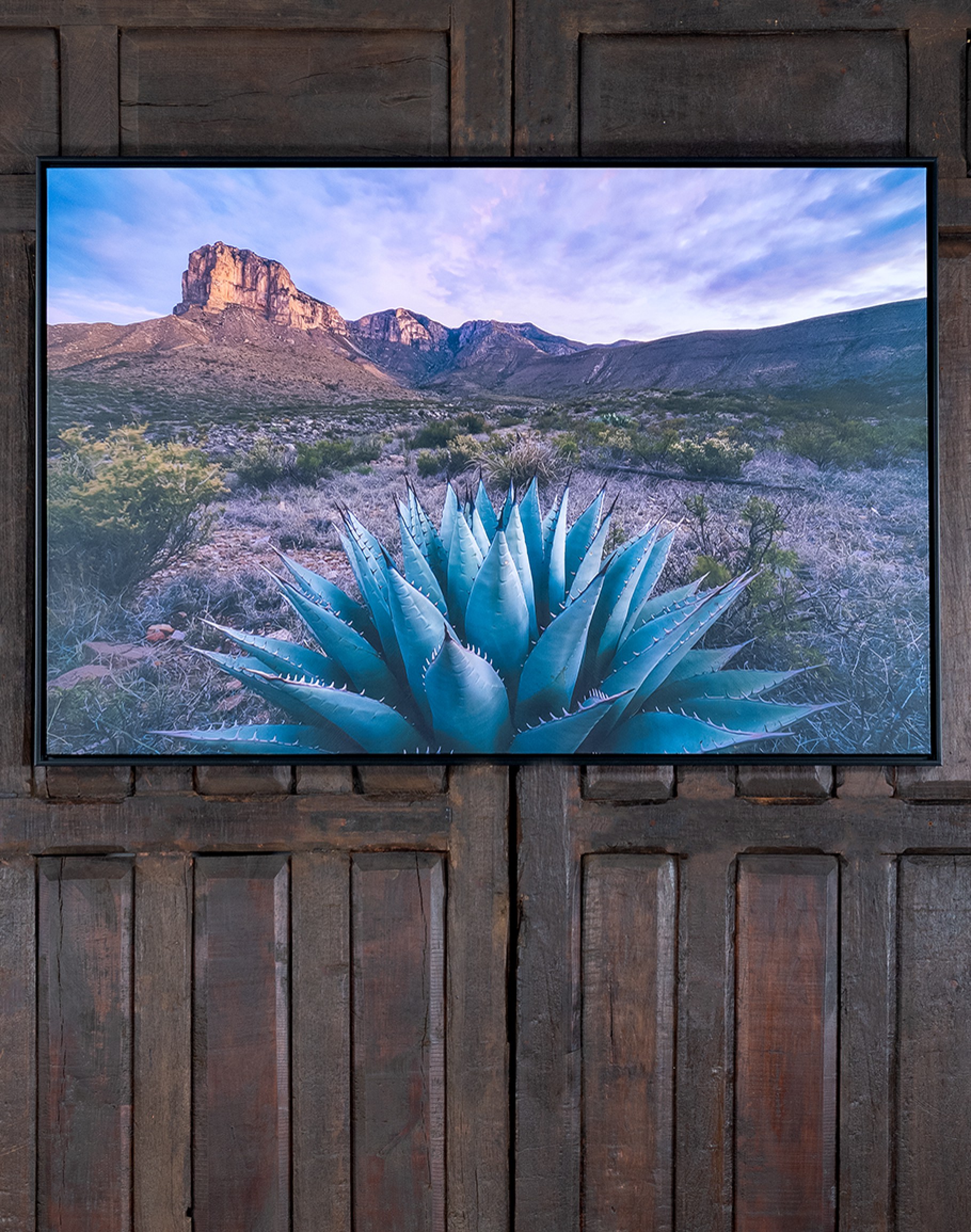 Desert Dreams captures the serene beauty of the southwestern landscape, featuring a majestic agave plant set against a backdrop of rugged mountains and a vivid, purple-hued sky. This horizontal art piece, framed in matte black, is the captivating focal point in a living room, bedroom, or office. As a star in the Desert Ranch collection, Desert Dreams brings a touch of understated sophistication and deep emotional resonance to your interior design. The meticulous detailing and vibrant colors make this piece a stunning visual addition and reflect the timeless elegance and superior craftsmanship that Adobe Interiors is known for.
