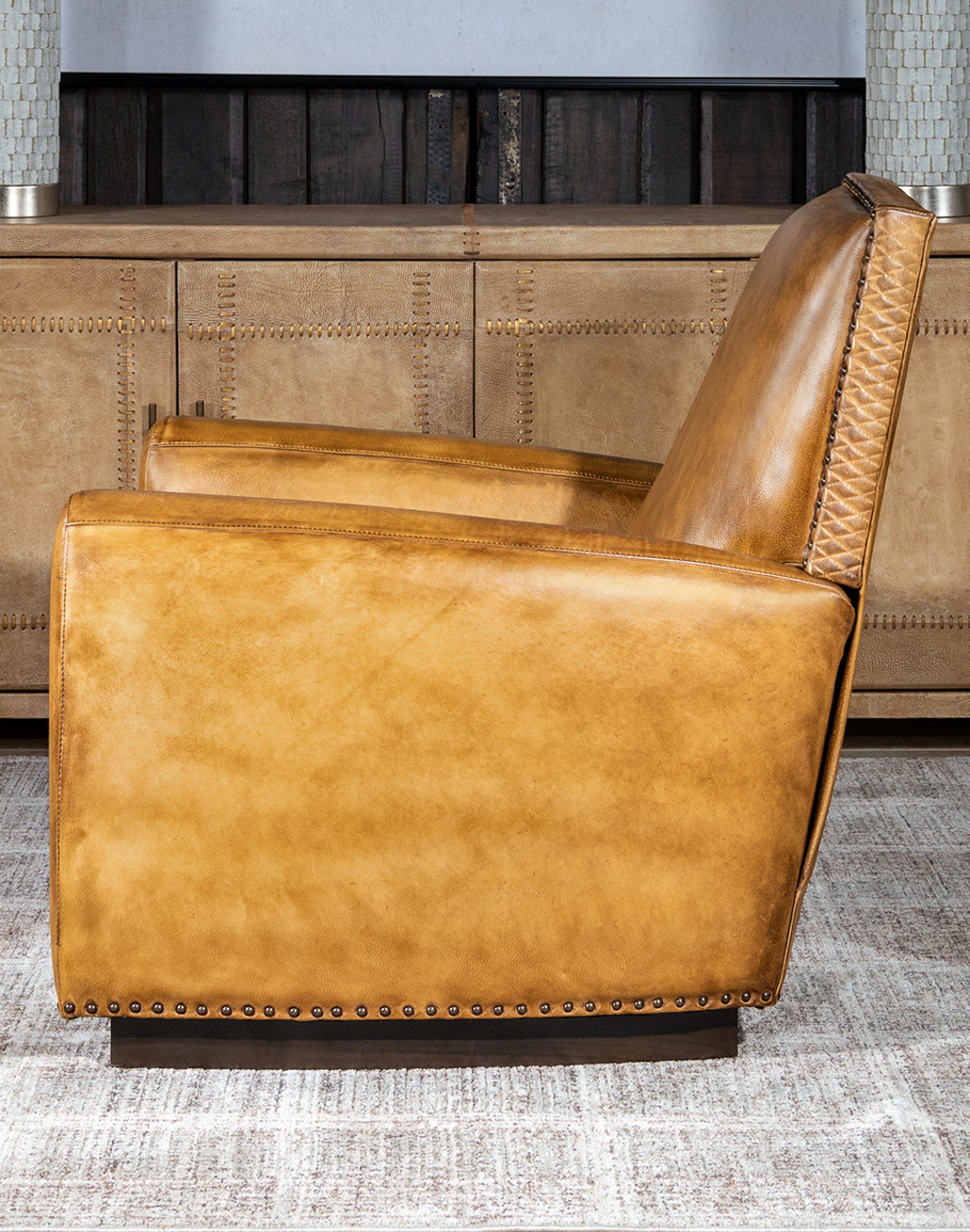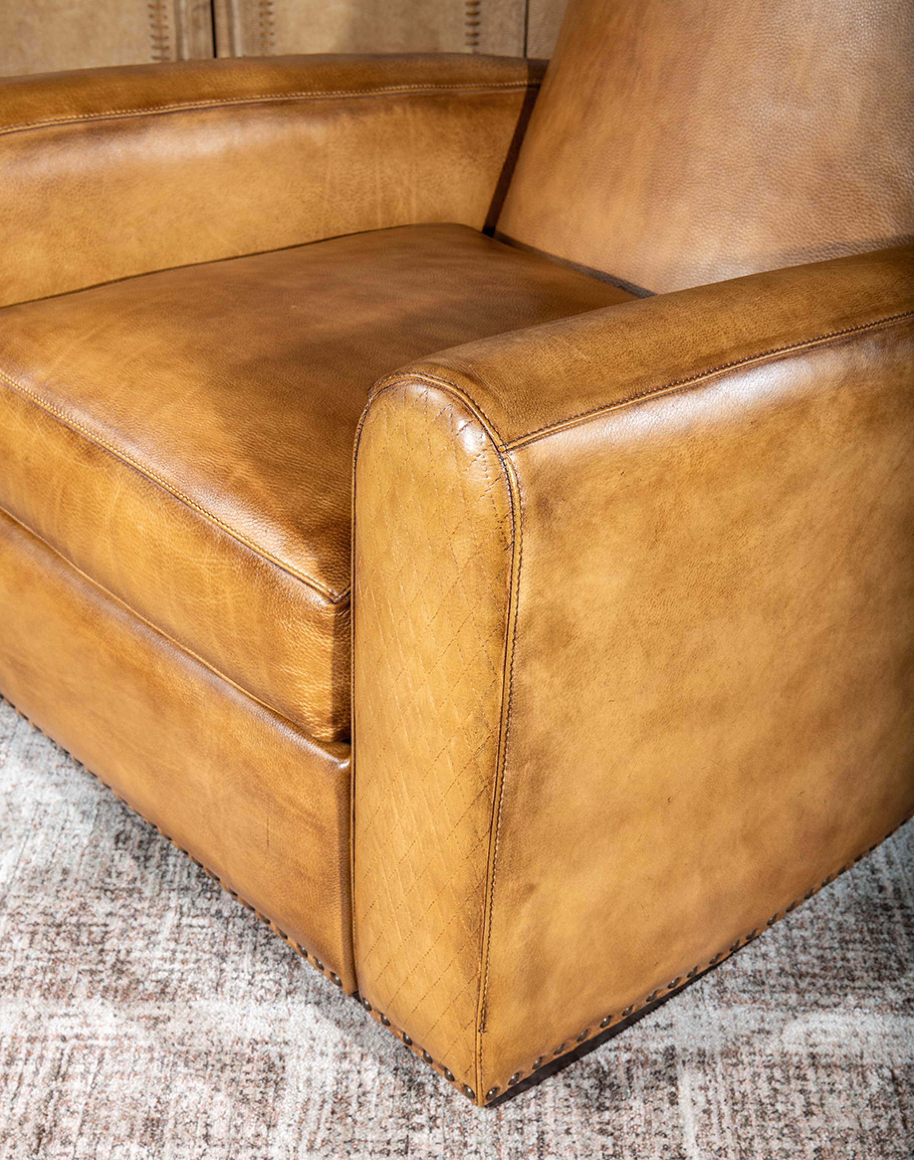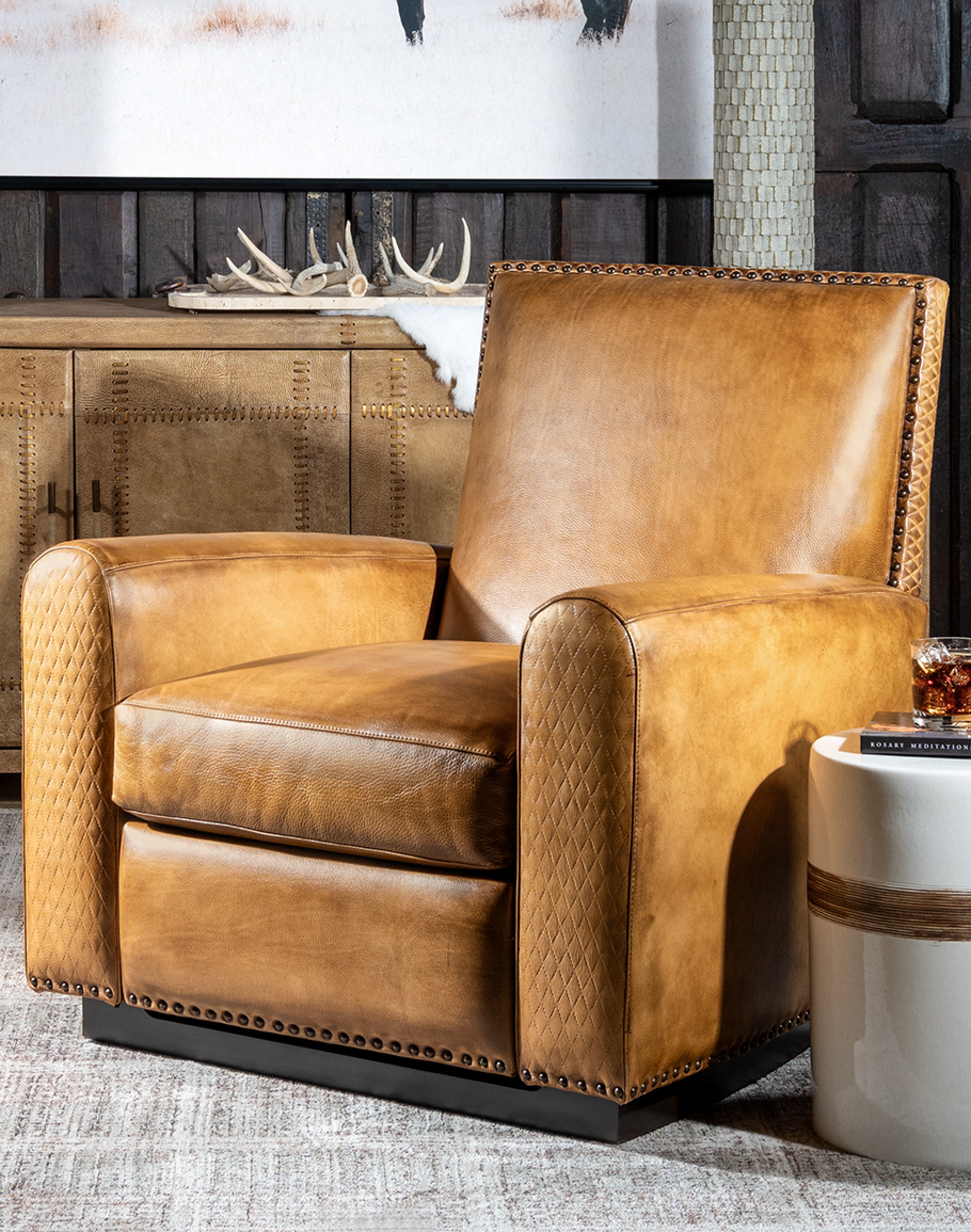 Uniquely blending comfort and style, the Desert Dune Leather Recliner is a testament to robust construction and plush seating, ensuring both durability and relaxation. Its clean lines and refined silhouette, adorned with nail-head trim and precise stitching, add a touch of sophistication. Whether your home is urban, ranch-style, or a sophisticated Southwestern abode, this recliner elevates any decor with its timeless elegance.