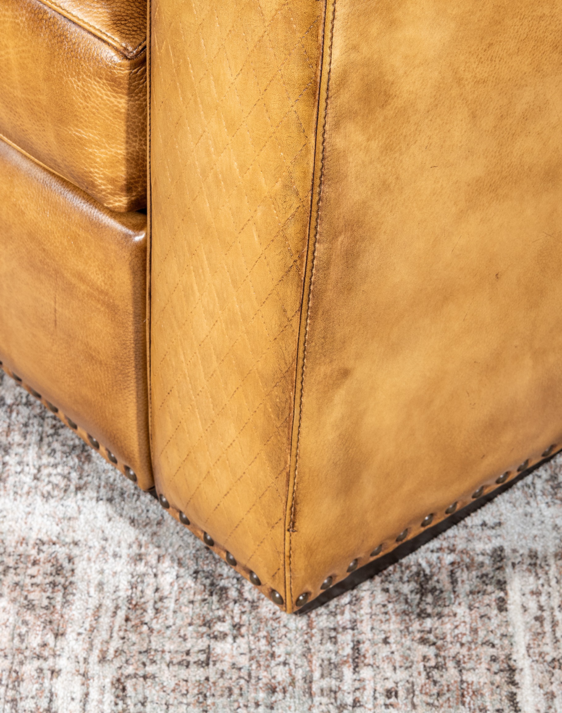 Leather Description: Artisan Leathers beautifully evoke this time worn quality, unique to every individual piece, like the originals. To pure aniline leather crusts, already fully and carefully upholstered to the piece, a base color is created with multiple applications of waxes and oils, hand-worked by the leather Artisan. After drying, this craftsman then carefully builds-up the finish with an expert’s eye, and touch, to achieve an aged patina in just the right places to reflect the aged qualities only time, wear, and frequent care could have accomplished naturally. Every individual piece upholstered with Artisan Leather finishing methods is first beautifully built to the highest standards of quality. The leather is then hand-colored and aged to bespeak the loving touch of time, providing a quality antique appearance to a beautiful new piece of quality leather furniture. Every chair, sofa, or bench has its very own unique identity only these hand-crafted methods can provide, reflecting the presence of a time honored past.