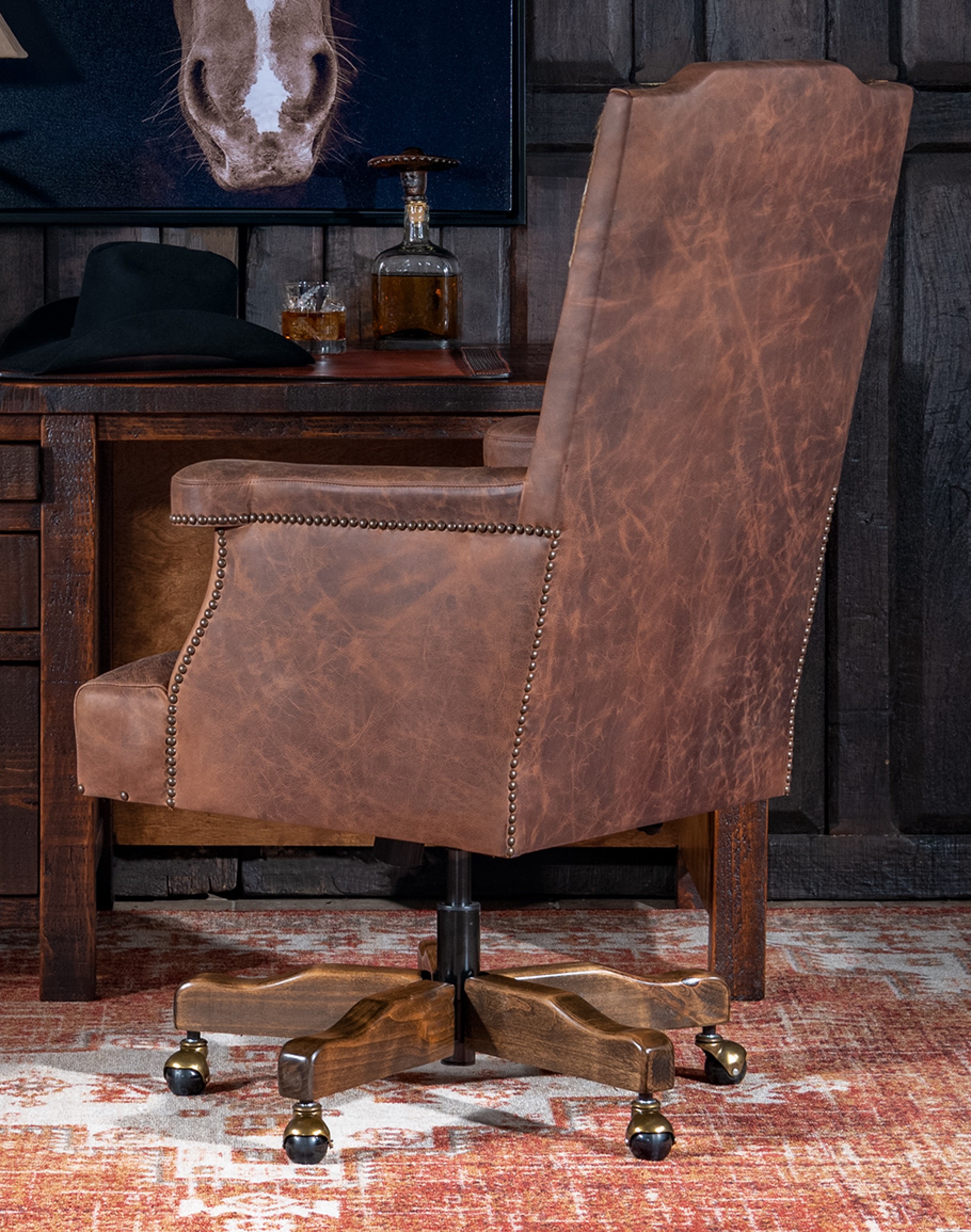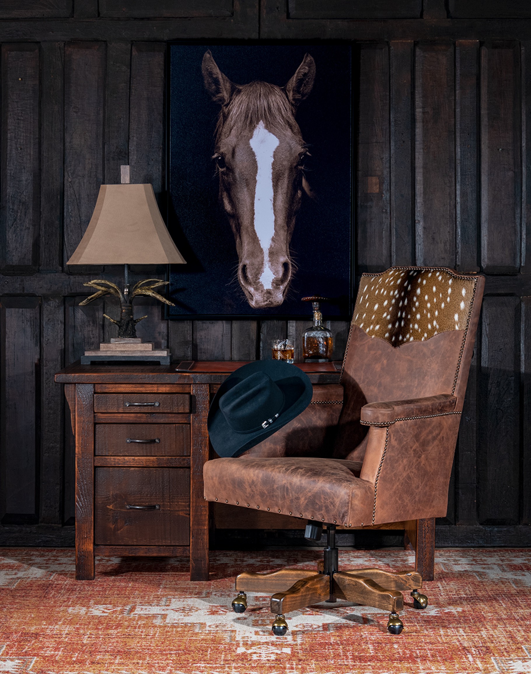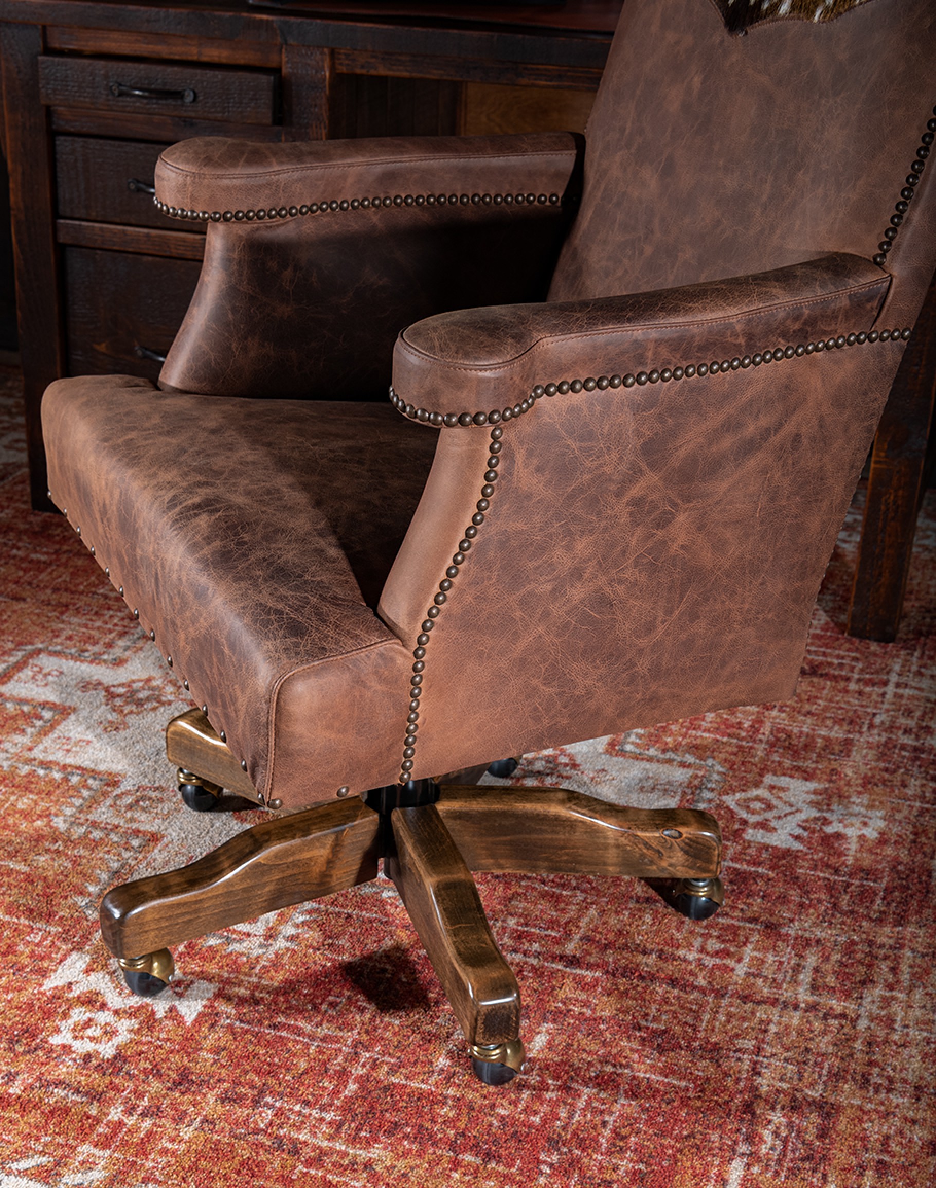 The Desota Desk Chair sports genuine axis deer hide, fine distressed top grain leather, and custom comfort and durability for lasting utility. Handmade in Texas, this high-quality chair is the perfect custom fit for your home office. Earth tones are complimented by natural accenting and the centerpiece of authentic deer hide. The percussion of spots dotting the back of the chair draw the eye in to the radiating line of chocolate brown pulling downward into the comfort and luxuriousness of the Italian leather. You’re sure to sink into this wildly indulgent escape as you begin your workday! Sturdy hardwood accents bring the chair to life in a unique way that is sure to compliment your home’s warm and inviting décor.