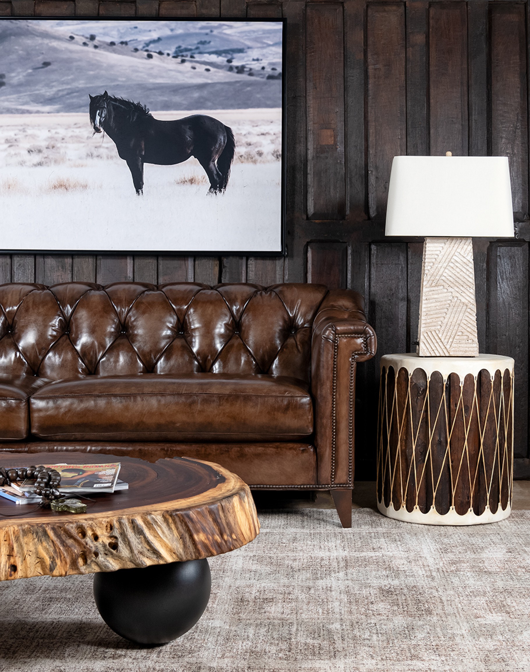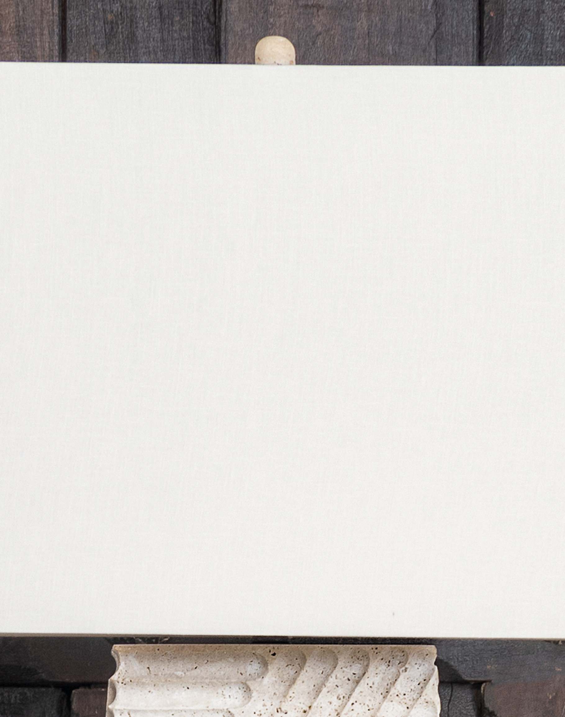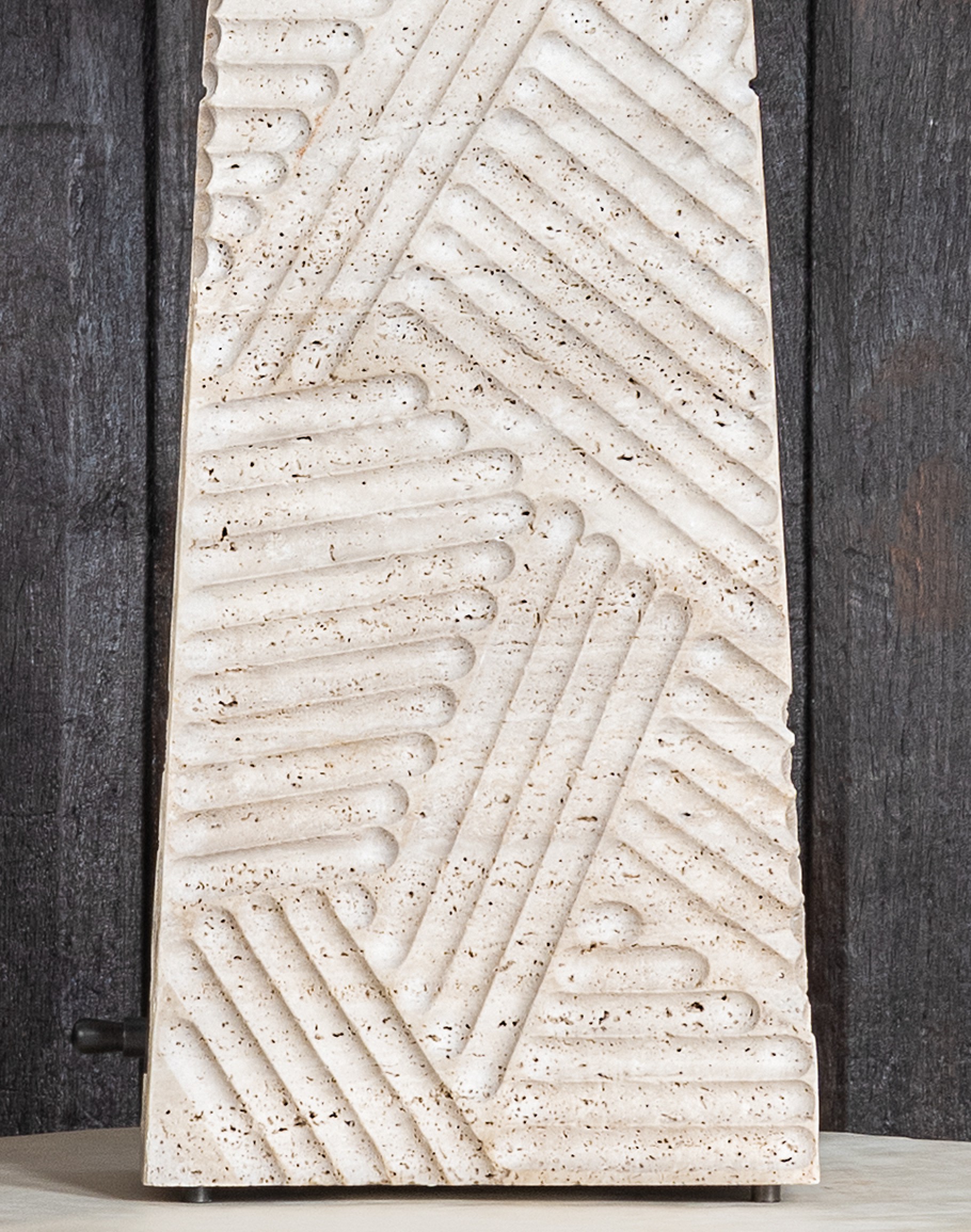 The Diagram Table Lamp features an unfilled beige travertine that is carved on all sides and hand-finished in a loose basket weave texture. A solid brass dimmer switch, conveniently located at the base, highlights the dimensions in the carving and creates a dramatic glow. A rectangular tapered hardback off-white linen shade with rounded corners completes the look.