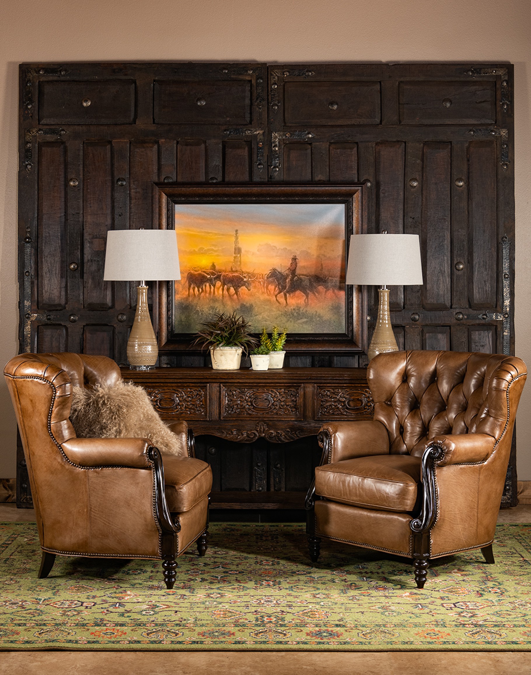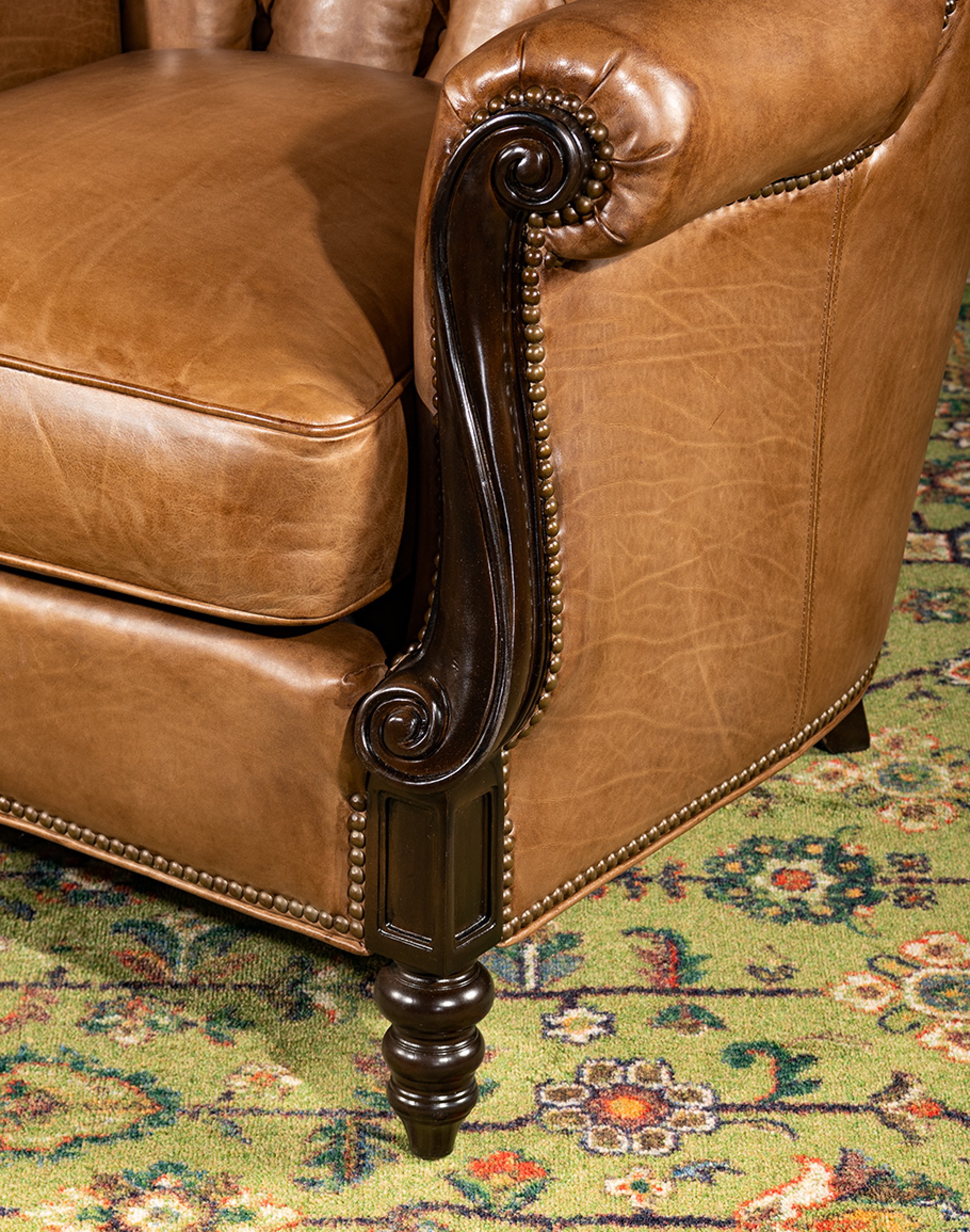 Leather Description: Artisan Leathers beautifully evoke this time worn quality, unique to every individual piece, like the originals. To pure aniline leather crusts, already fully and carefully upholstered to the piece, a base color is created with multiple applications of waxes and oils, hand-worked by the leather Artisan. After drying, this craftsman then carefully builds-up the finish with an expert’s eye, and touch, to achieve an aged patina in just the right places to reflect the aged qualities only time, wear, and frequent care could have accomplished naturally. Every individual piece upholstered with Artisan Leather finishing methods is first beautifully built to the highest standards of quality. The leather is then hand-colored and aged to bespeak the loving touch of time, providing a quality antique appearance to a beautiful new piece of quality leather furniture. Every chair, sofa, or bench has its very own unique identity only these hand-crafted methods can provide, reflecting the presence of a time honored past.