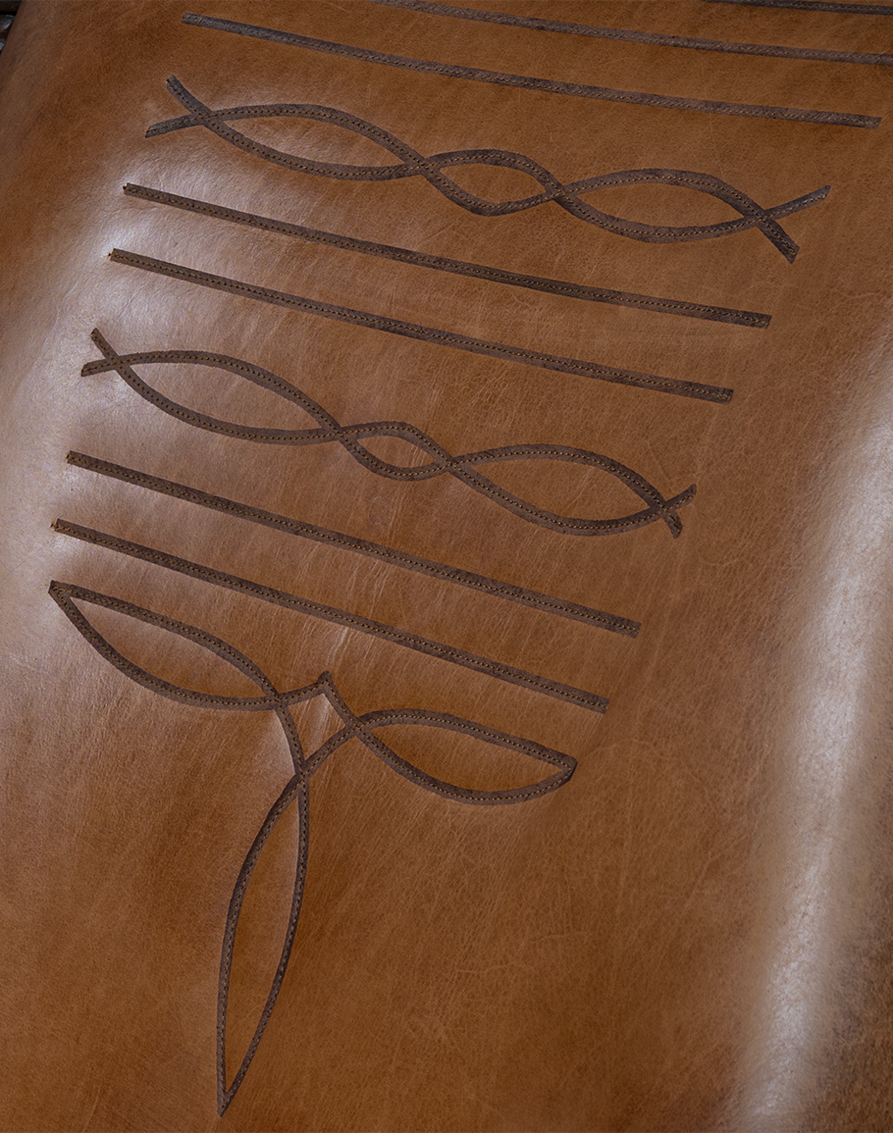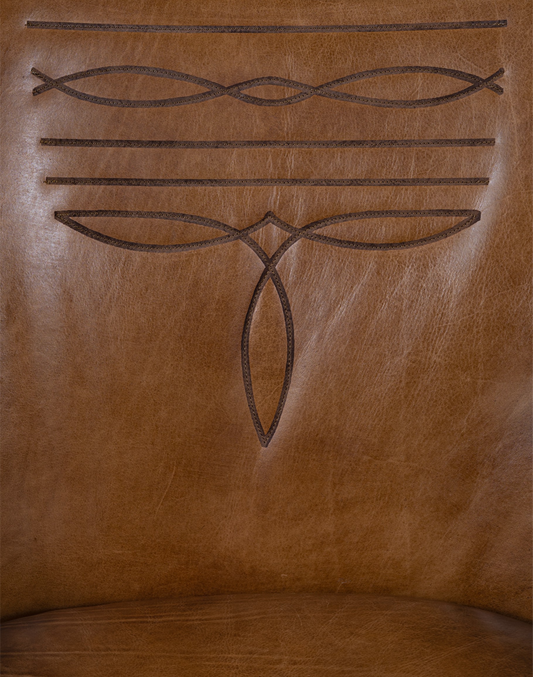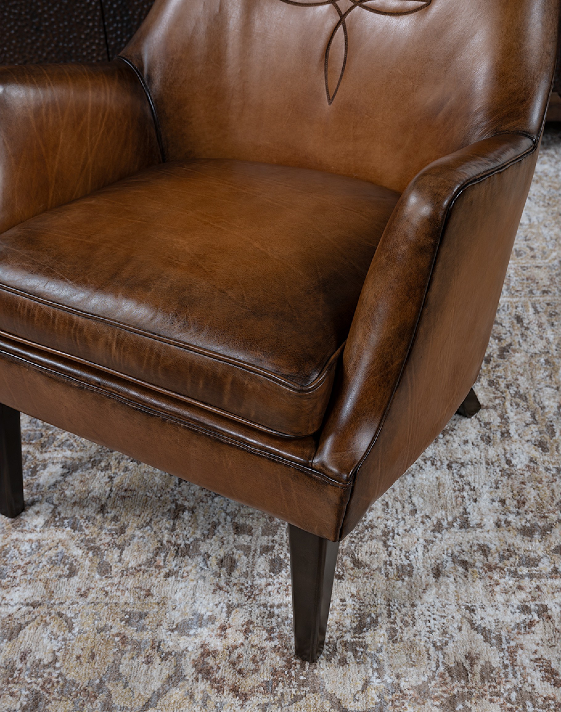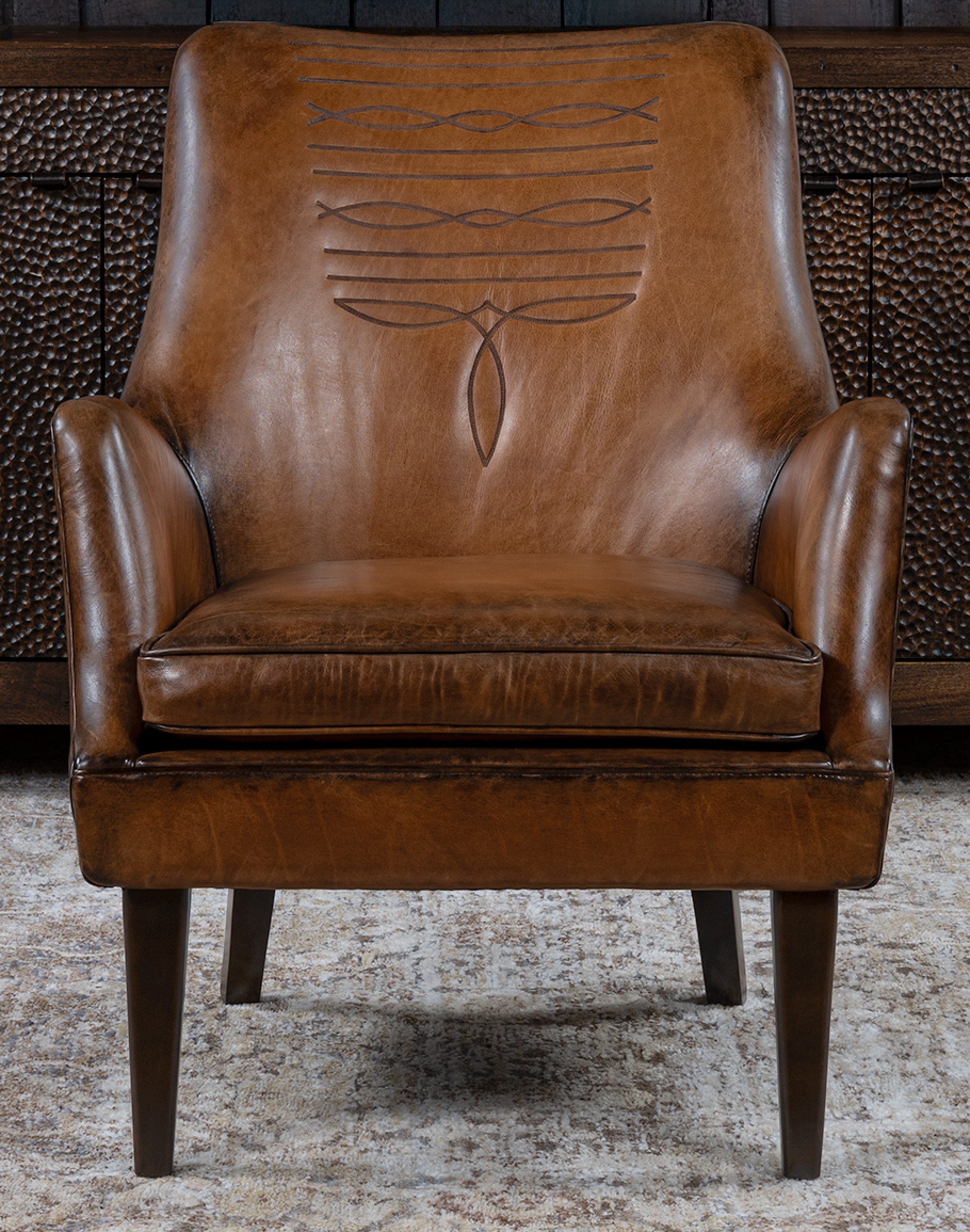 Introducing the Downtown Cowboy Chair—the perfect addition to your home decor! Crafted with expert precision and attention to detail, this 100% American-made leather chair boasts an 8-way hand-tied construction for unparalleled durability and comfort. The Downtown Cowboy Chair is a small-scale accent chair with a retro-style frame that exudes classic elegance. It features a warm brown, hand-burnished leather that will complement any interior design scheme. Adding a touch of Western charm and staring in our Classic Ranch collection, the inside seat back is adorned with a cowboy boot stitch emblem that will catch the eye of all who enter your space.