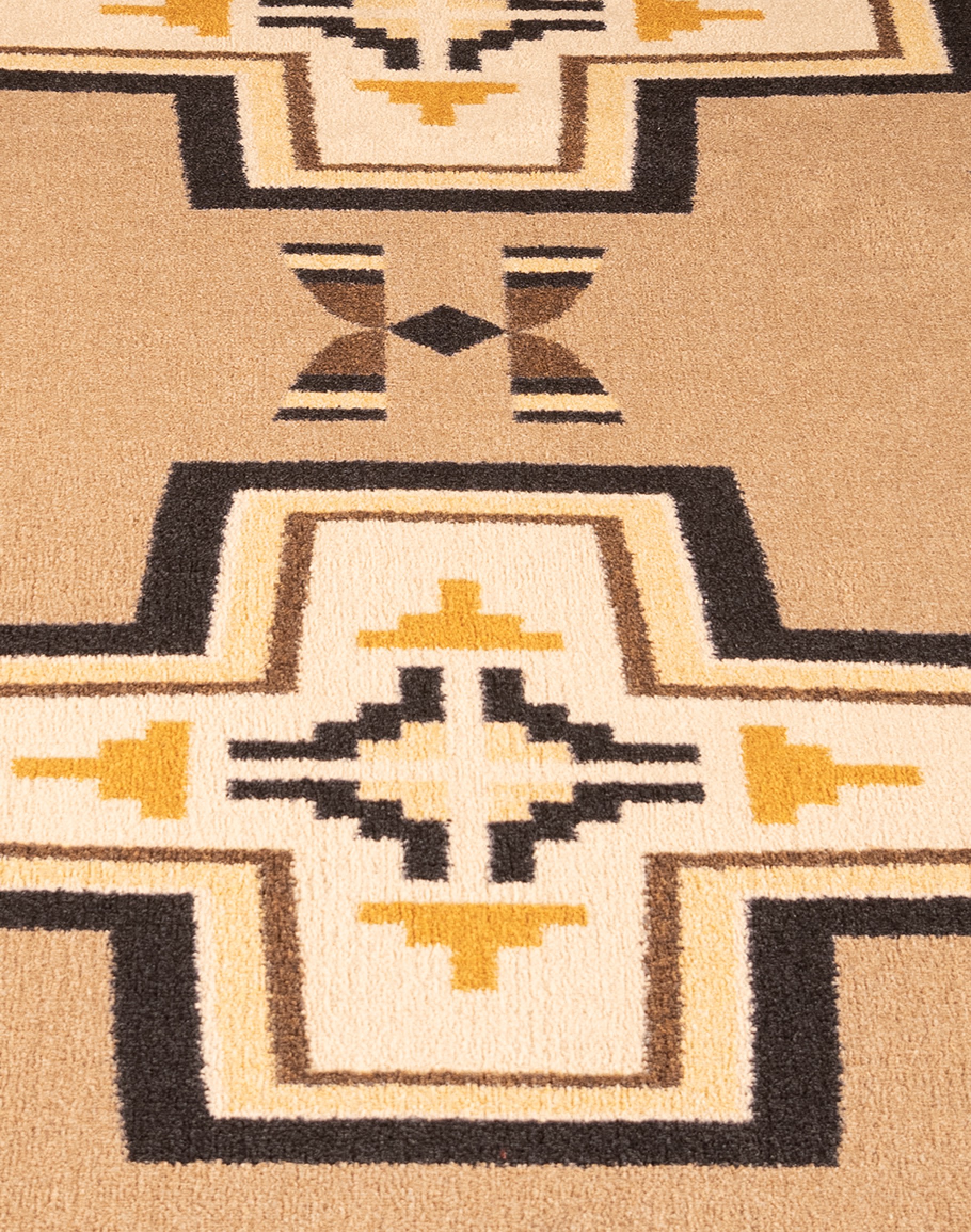 Introducing the Dream Catcher Rug - an exquisite addition to your home decor. Handcrafted in the U.S.A from premium EnduraStran Nylon, this rug boasts a captivating Native American pattern in a versatile color scheme dominated by beige, with accents of charcoal black, cream, and light gold tones. Choose from 6 different sizes made to order, ensuring the perfect fit for your space. Elevate your interior design and make a statement with this top-quality rug. Buy now and experience the luxury of the Dream Catcher Rug. Commercial grade rated and easy clean with water.