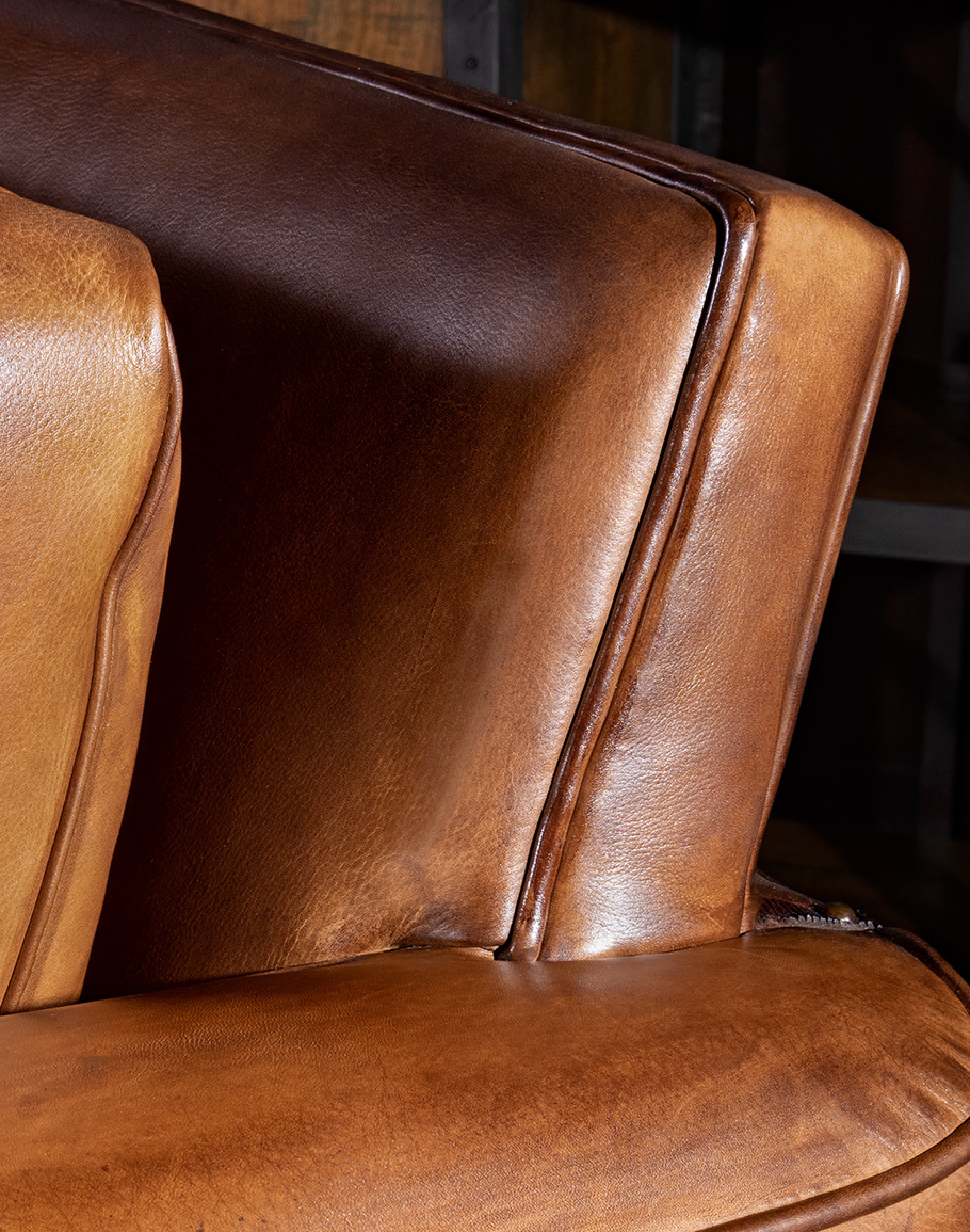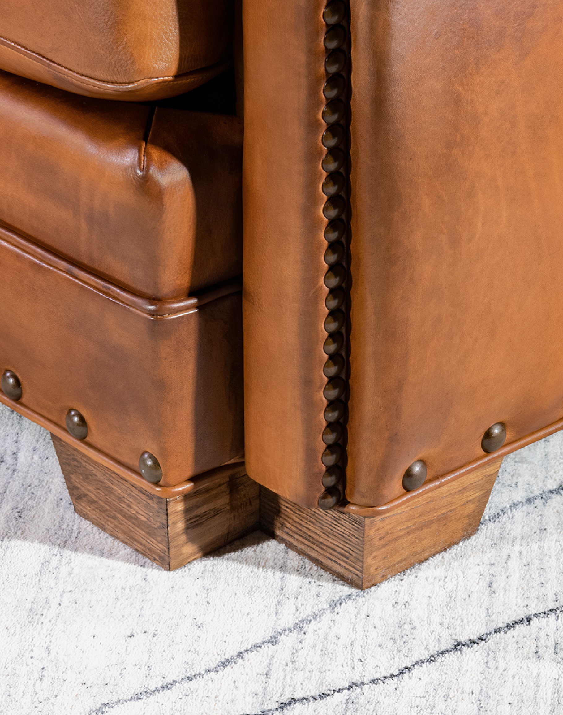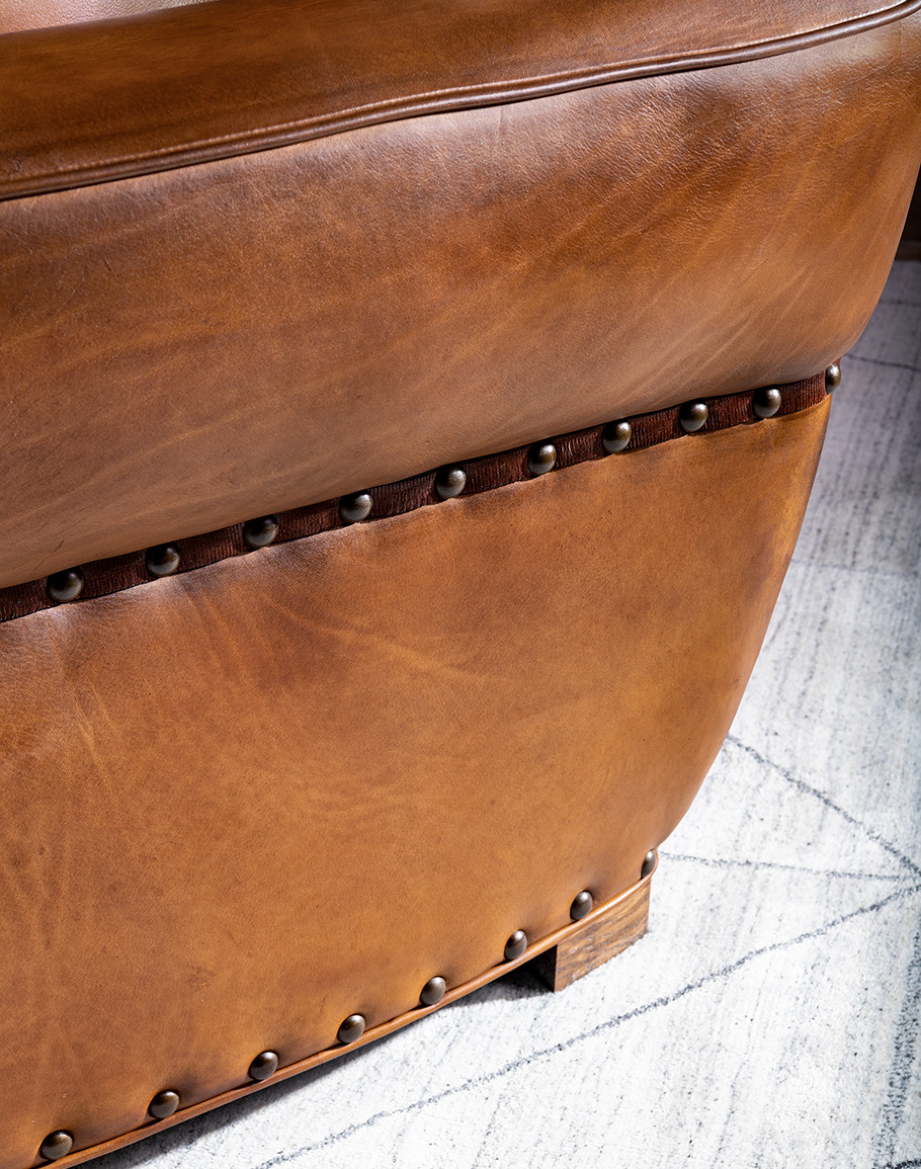 Leather Description: This is a full grain aniline leather tanned in a historic leather producing region of Italy using English hides. The century old tannery prepares this leather article by applying a hot wax, then turning the hides in old wooden tanning drums overnight to soften the natural fibers and impart it with a remarkable suppleness. The leather is then upholstered in its "crust form" on the furniture in North Carolina, After the furniture is made our leather artisans apply a multi step hand rubbed Patina using the same waxes and pigments used in Italy. Performing this process on the actual finished piece allows our artisans to develop a unique Patina, composition, and overall essence that creates a piece of furniture that has uniqueness, character and style that matches the individual who's selecting it. This leather imparts the feeling of a softer, well broken in leather one might find on a decades old chair discovered in a French country estate or the Parisian flea market. The leather is brand new from our Artisans hands... without the aging issues that sometimes come from the hands of time. Truly a unique, hand-made article in an era when only companies committed to the highest standards lavish this sort of attention and time to unique American made furniture.
