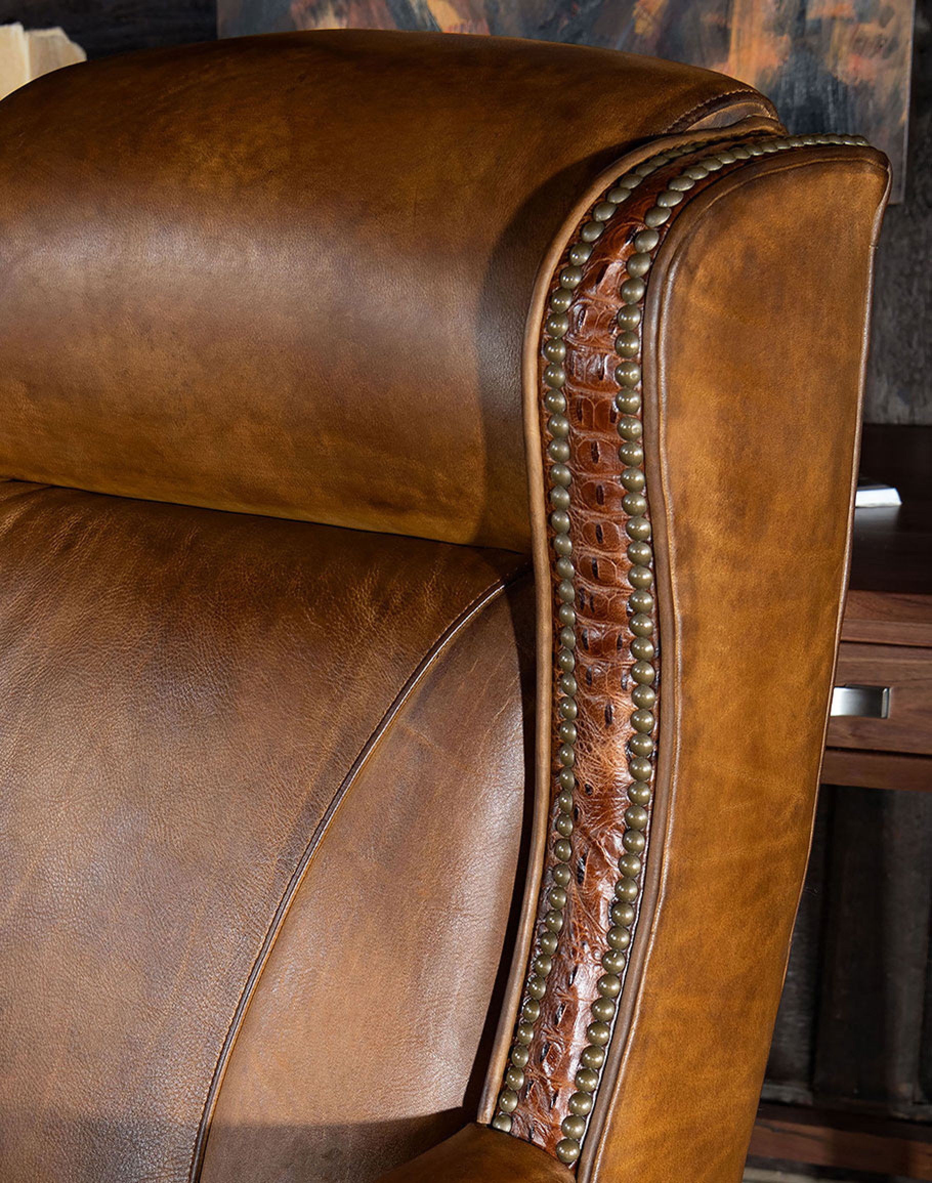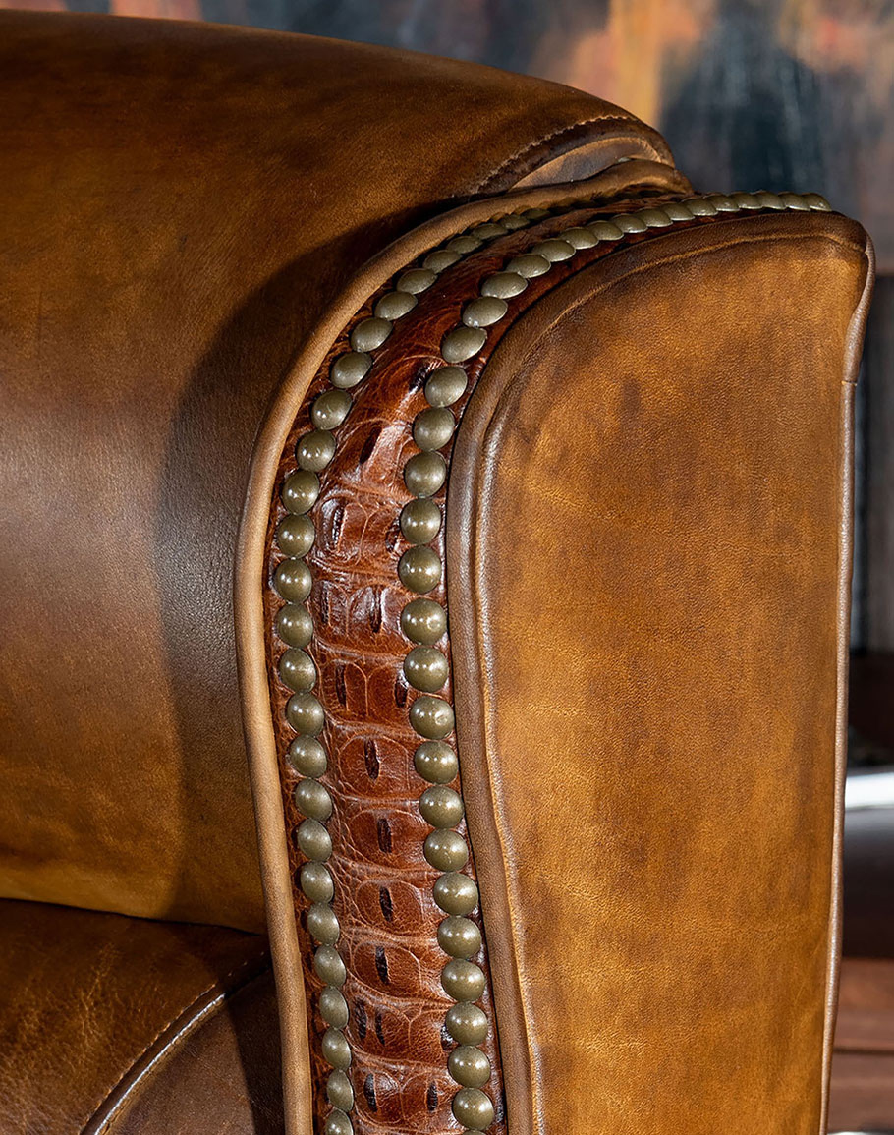 Leather Description: Artisan Leathers beautifully evoke this time worn quality, unique to every individual piece, like the originals. To pure aniline leather crusts, already fully and carefully upholstered to the piece, a base color is created with multiple applications of waxes and oils, hand-worked by the leather Artisan. After drying, this craftsman then carefully builds-up the finish with an expert’s eye, and touch, to achieve an aged patina in just the right places to reflect the aged qualities only time, wear, and frequent care could have accomplished naturally. Every individual piece upholstered with Artisan Leather finishing methods is first beautifully built to the highest standards of quality. The leather is then hand-colored and aged to bespeak the loving touch of time, providing a quality antique appearance to a beautiful new piece of quality leather furniture. Every chair, sofa, or bench has its very own unique identity only these hand-crafted methods can provide, reflecting the presence of a time honored past.