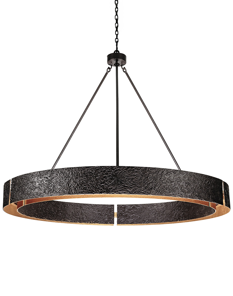 The Drover’s Circle Hand Forged Iron Ring Chandelier is a sculptural statement piece designed to ground expansive spaces with quiet drama and refined rustic character. A substantial circular band of hand-forged iron forms the outer ring, showcasing an artisanal, heavily worked texture that feels both organic and tailored. The inner surface of the ring is smoothly finished and set back slightly, creating depth and a subtle sense of layering around the concealed light source.