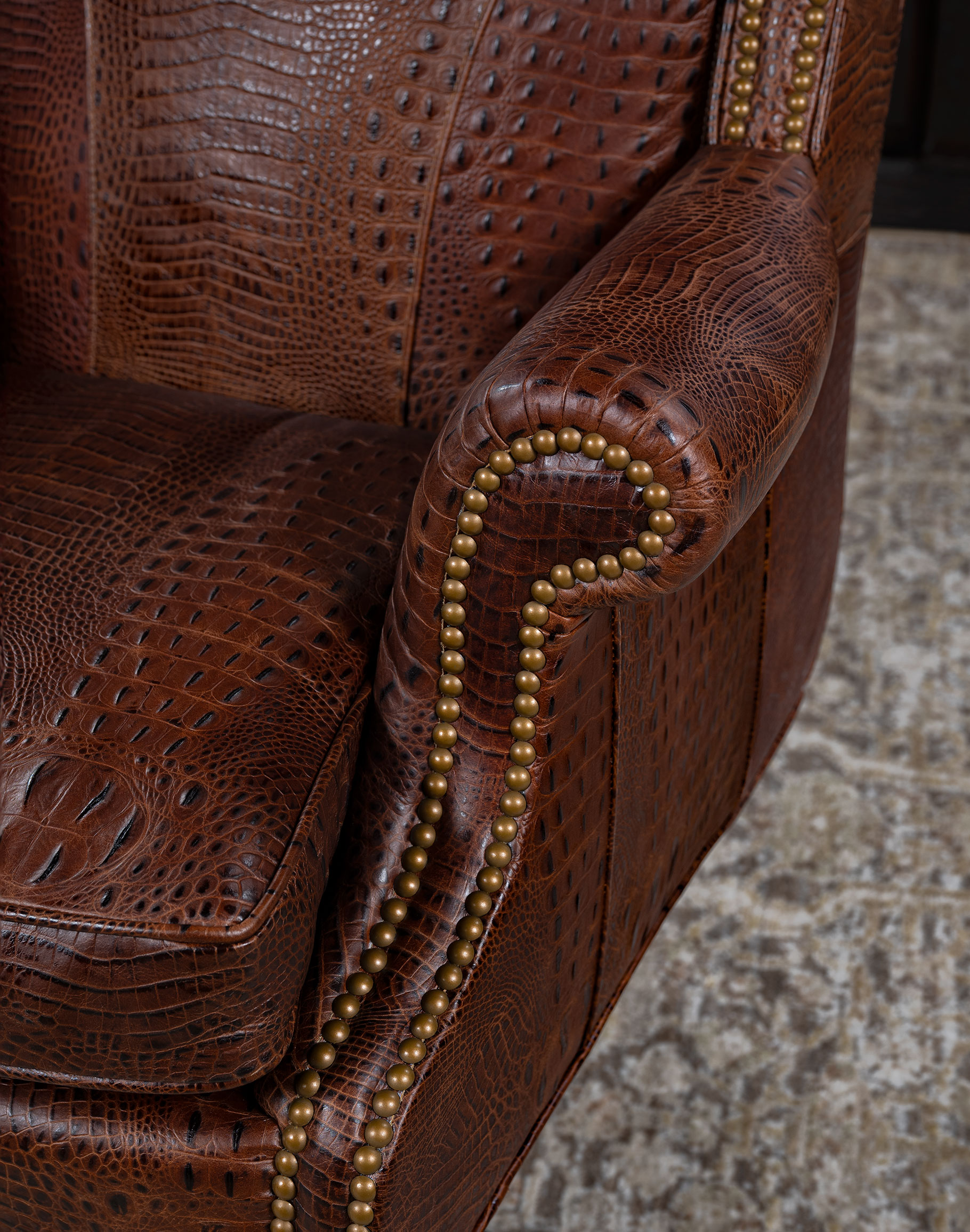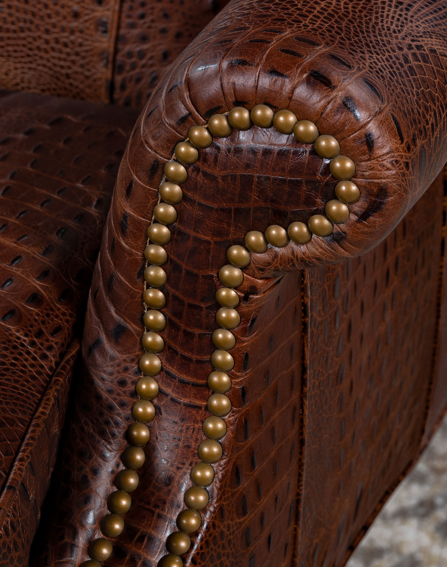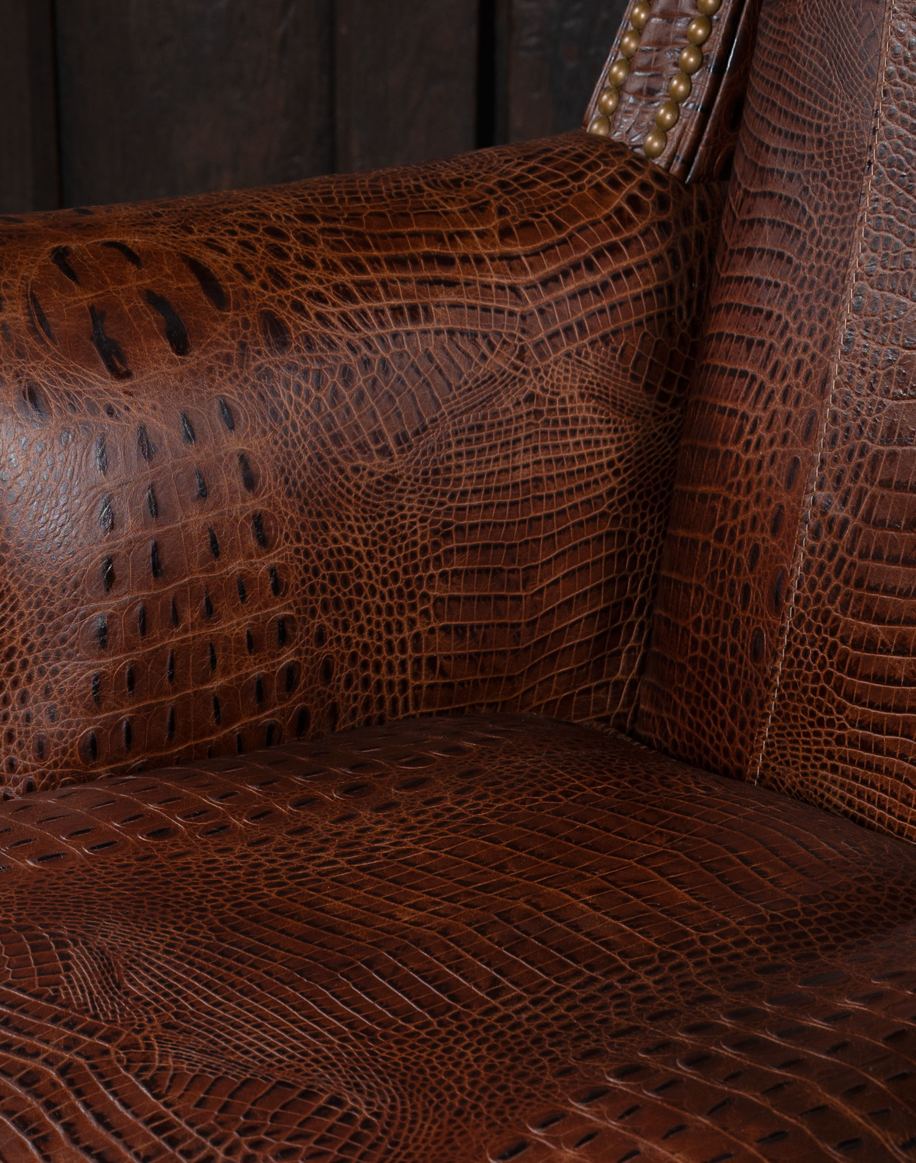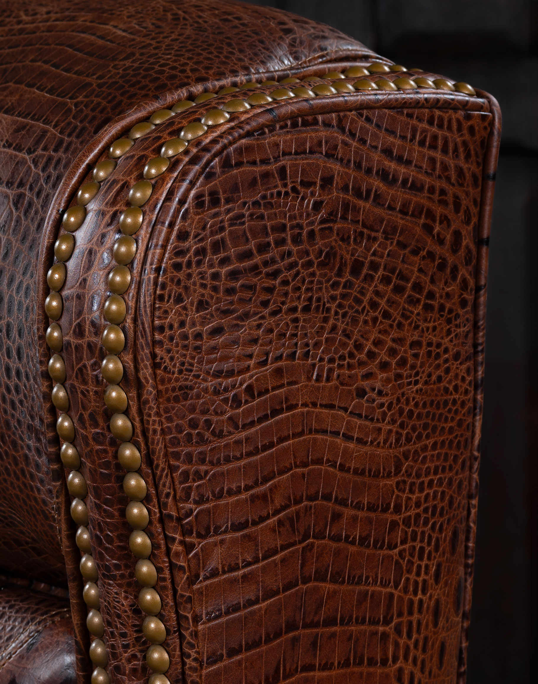Embossed Leather Description: A leather used to accent many of today's home interiors. The leather hide is first embossed with a large crocodile grain and then colored by applying two base color coats of micro pigments. The leather is then wiped-off to give it a contrast of colors utilizing the base color combination. This color contrast is further accented by two additional top coat colors that are wiped-on by hand to give the leather a beautiful antique look.