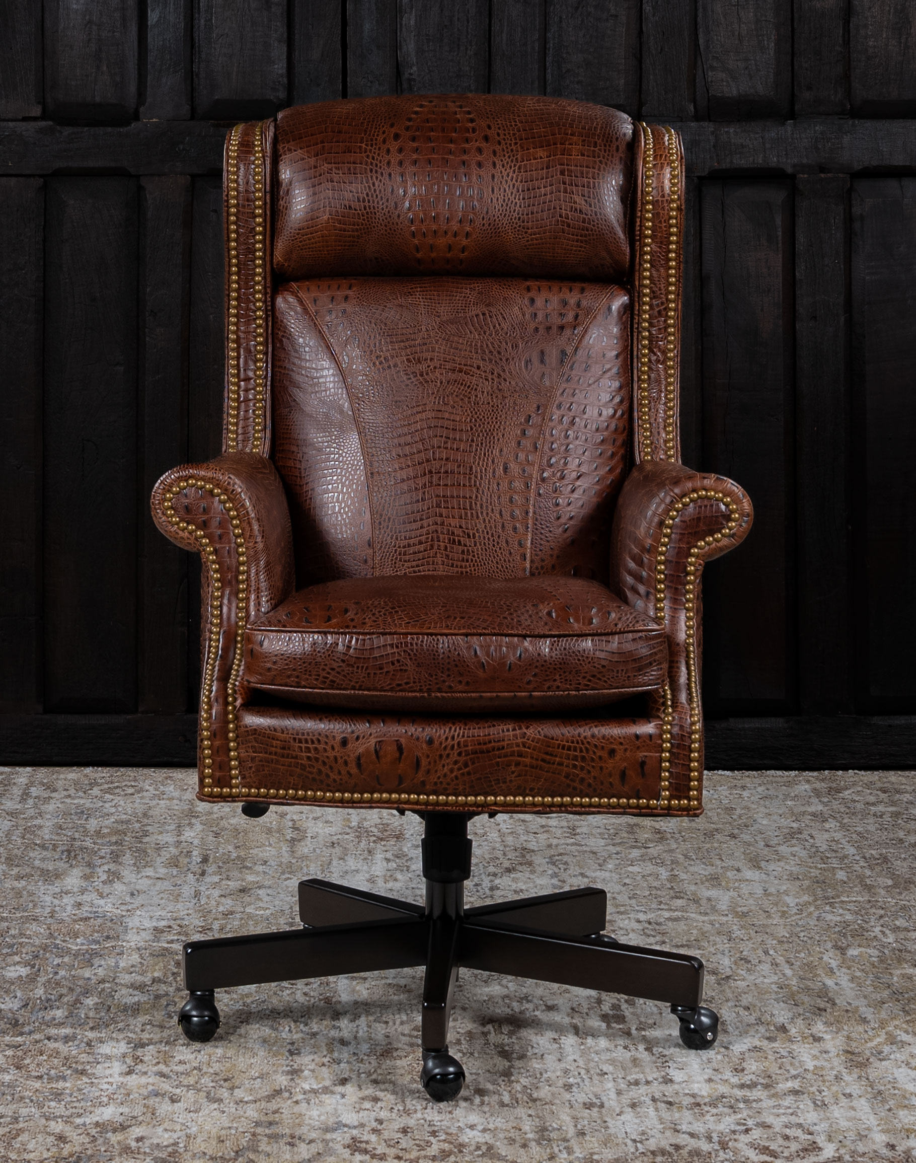 The quality Western Durango Executive Desk Chair features stamped rustic croc leather in the finest fashion. Handmade in the United States, this Classic Ranch and Refined Ranch Western-style executive desk chair is inspired by a classic Judges Chair with natural accents, making it the perfect accompaniment to a heritage home office. Making space to accomplish work without compromising style and comfort is the goal of this piece of furniture, and its beauty and utility are immutable. Handmade with soft embossed croc leather and a dependably sturdy base, this custom executive desk chair flourishes with motifs steeped in timeless tradition. Functional and time-tested, the chair will be yours for years, undoubtedly an heirloom piece! At Adobe Interiors, we create the furniture, and you create the memories.