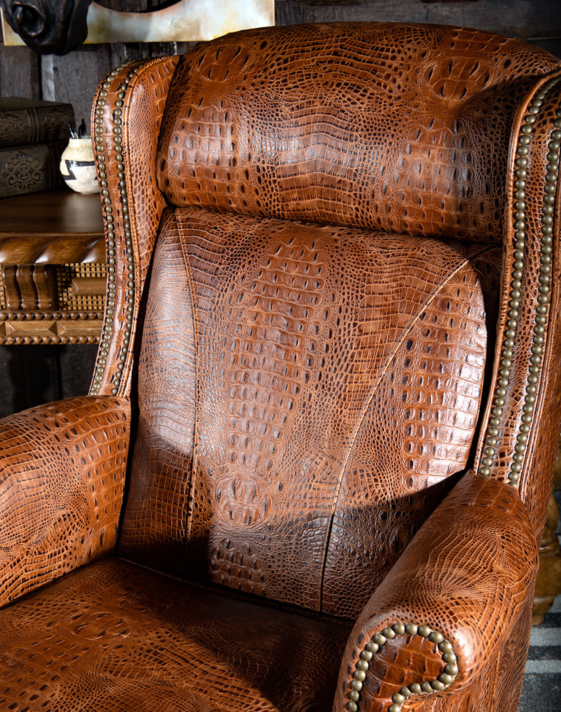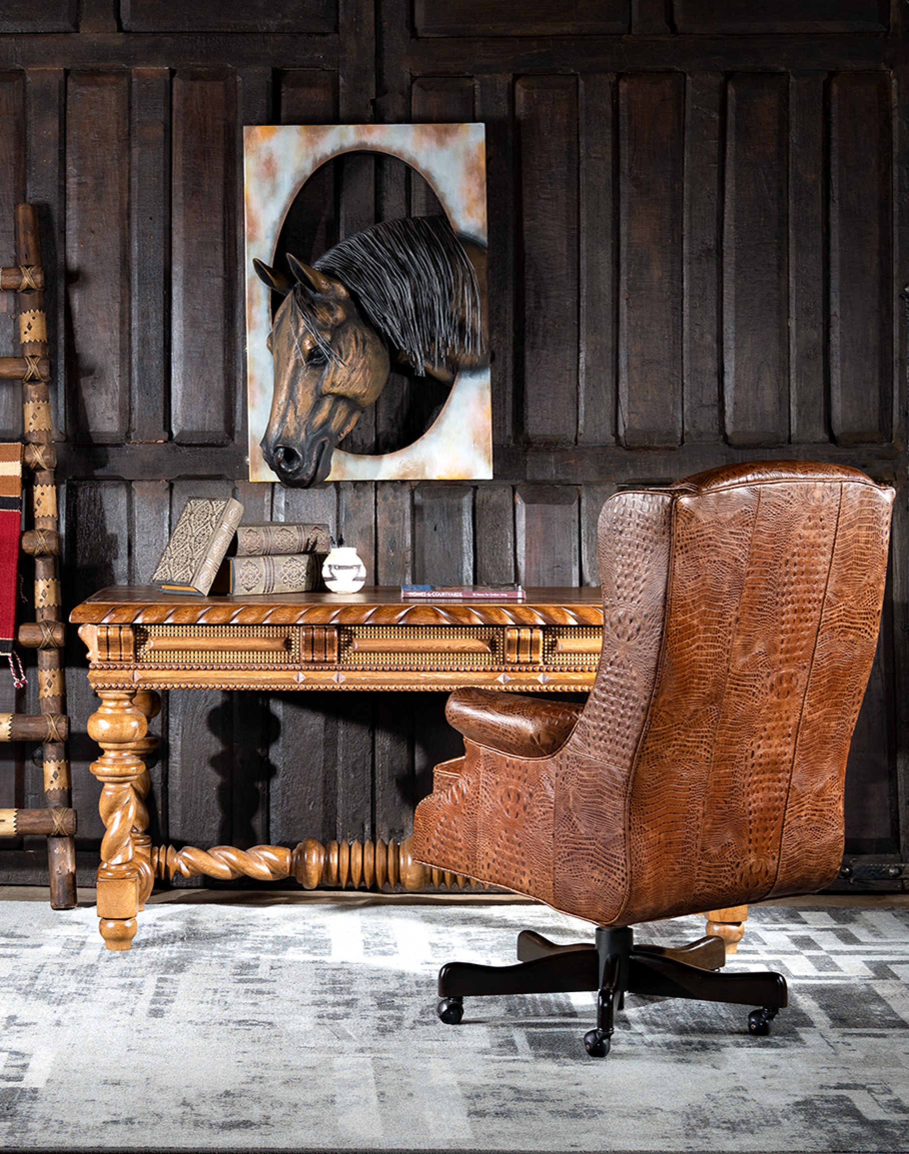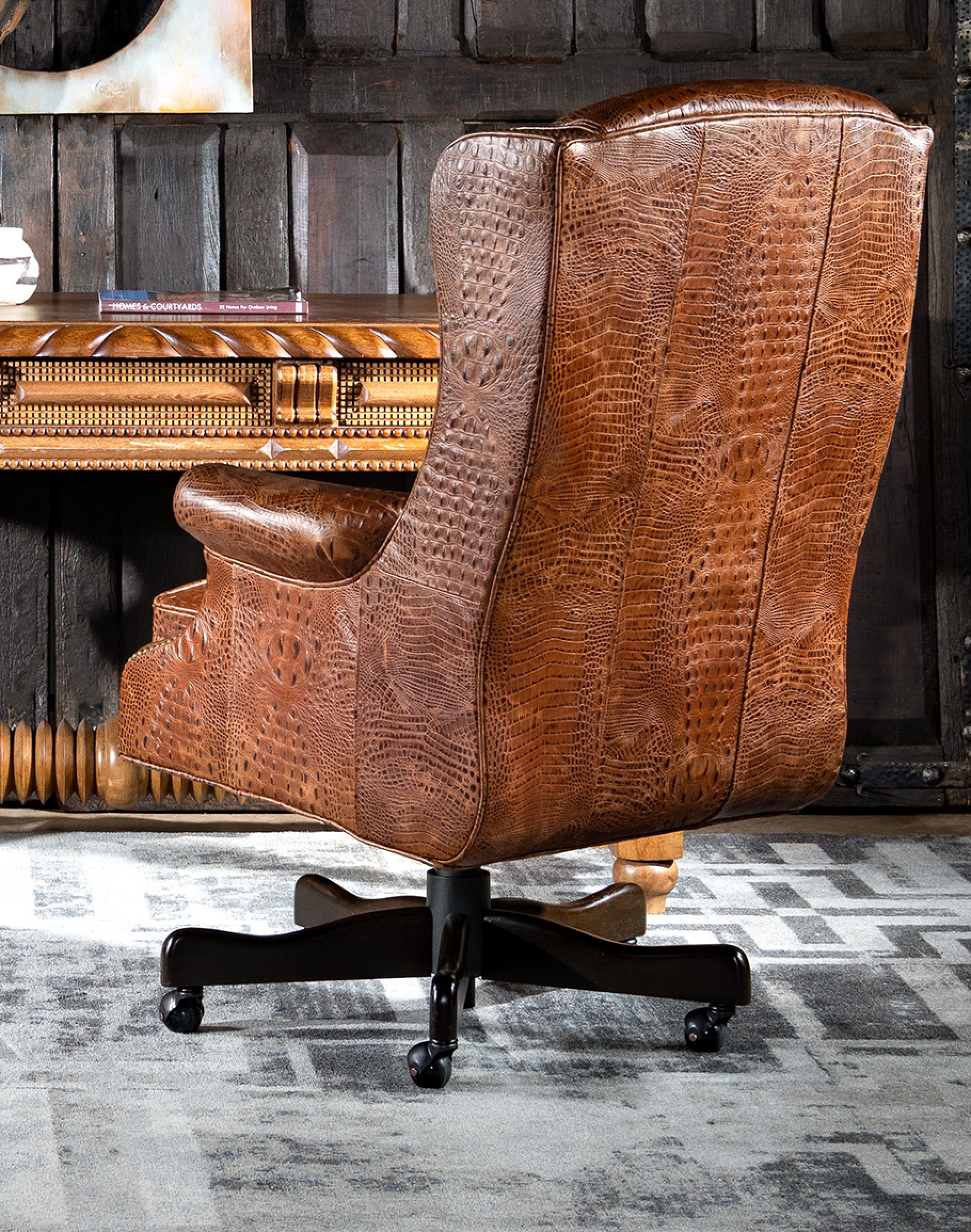 The quality Western Durango Executive Desk Chair features stamped rustic croc leather in the finest fashion. Handmade in the United States, this Classic Ranch and Refined Ranch Western-style executive desk chair is inspired by a classic Judges Chair with natural accents, making it the perfect accompaniment to a heritage home office. Making space to accomplish work without compromising style and comfort is the goal of this piece of furniture, and its beauty and utility are immutable. Handmade with soft embossed croc leather and a dependably sturdy base, this custom executive desk chair flourishes with motifs steeped in timeless tradition. Functional and time-tested, the chair will be yours for years, undoubtedly an heirloom piece! At Adobe Interiors, we create the furniture, and you create the memories.