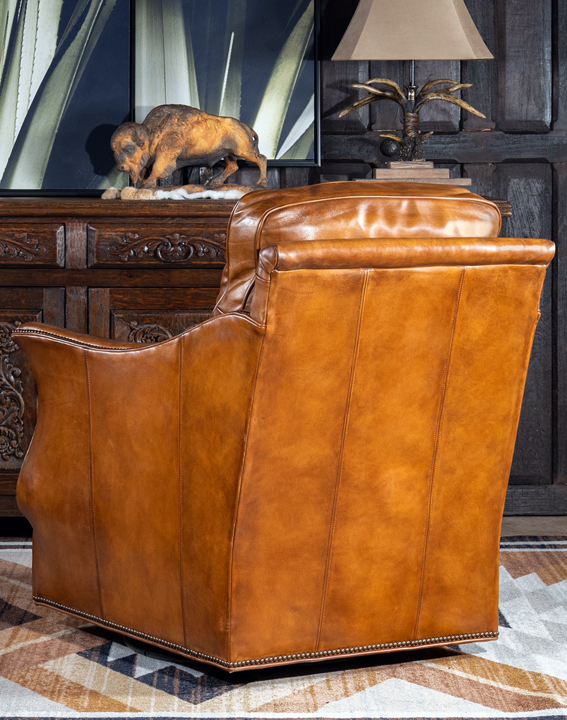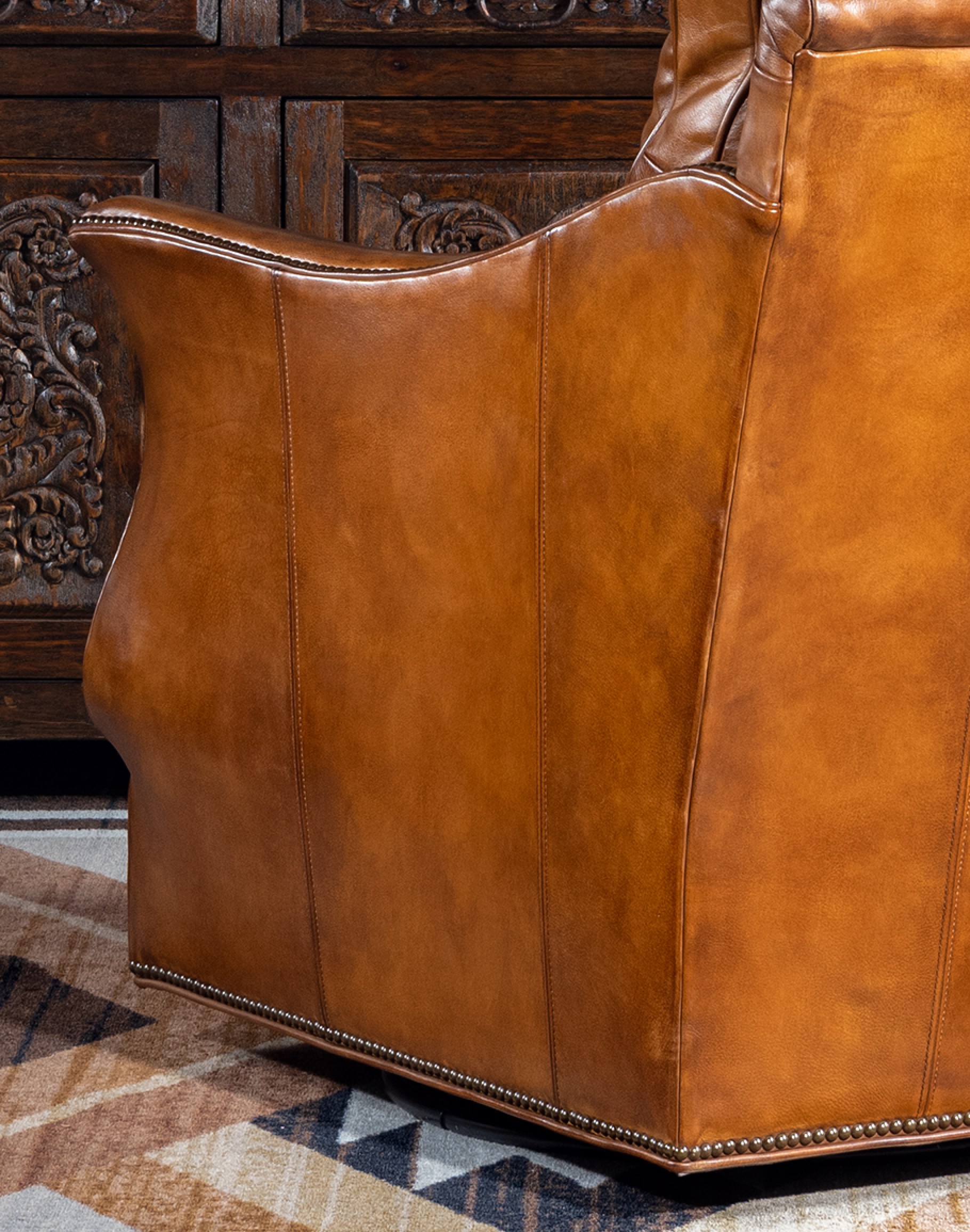 Experience the epitome of comfort and luxury with the Durango Swivel Glider. Crafted with pride in the USA, this chair showcases impeccable standards of quality and craftsmanship. Embrace the allure of genuine full grain leather, skillfully hand-burnished for a timeless touch of elegance.