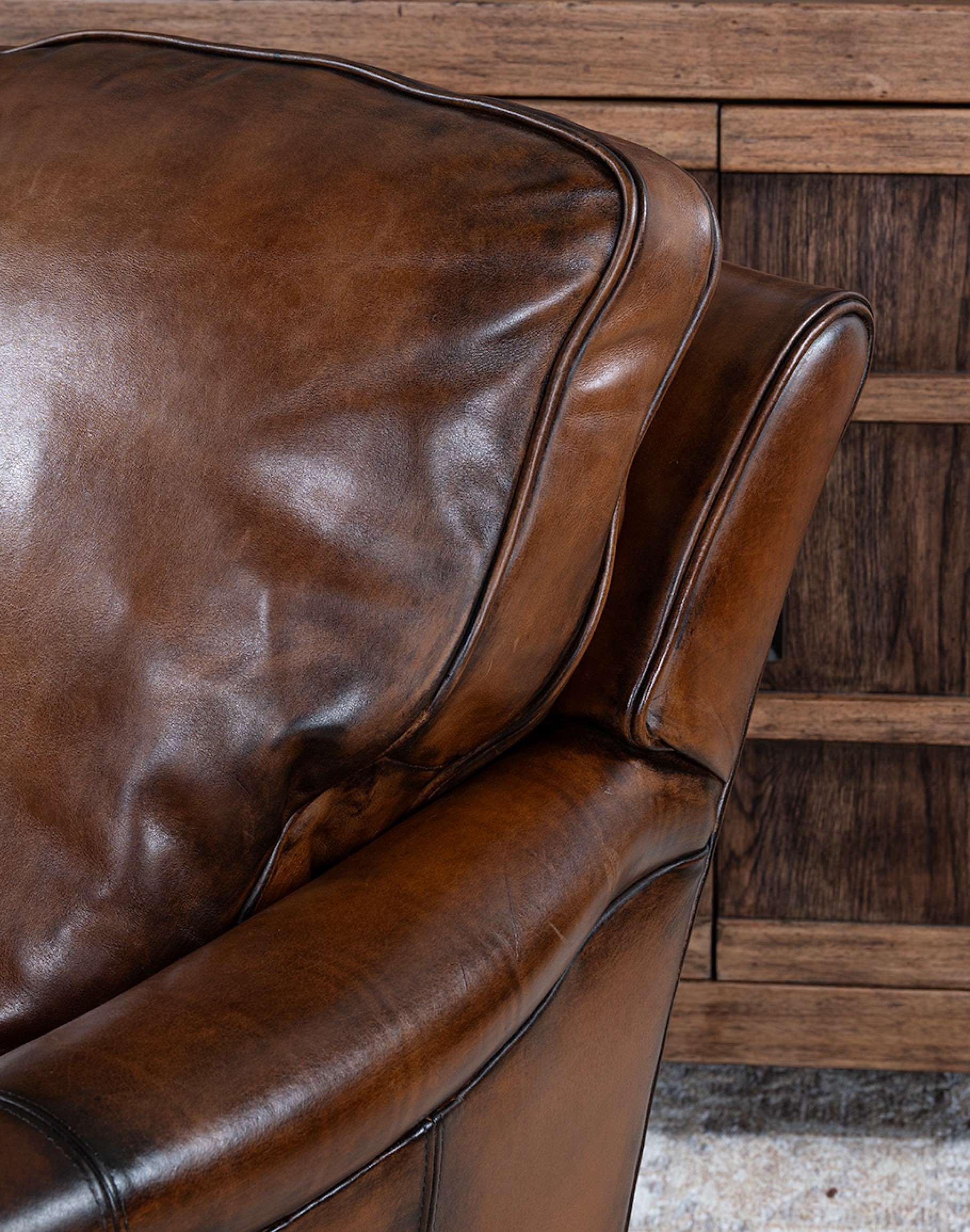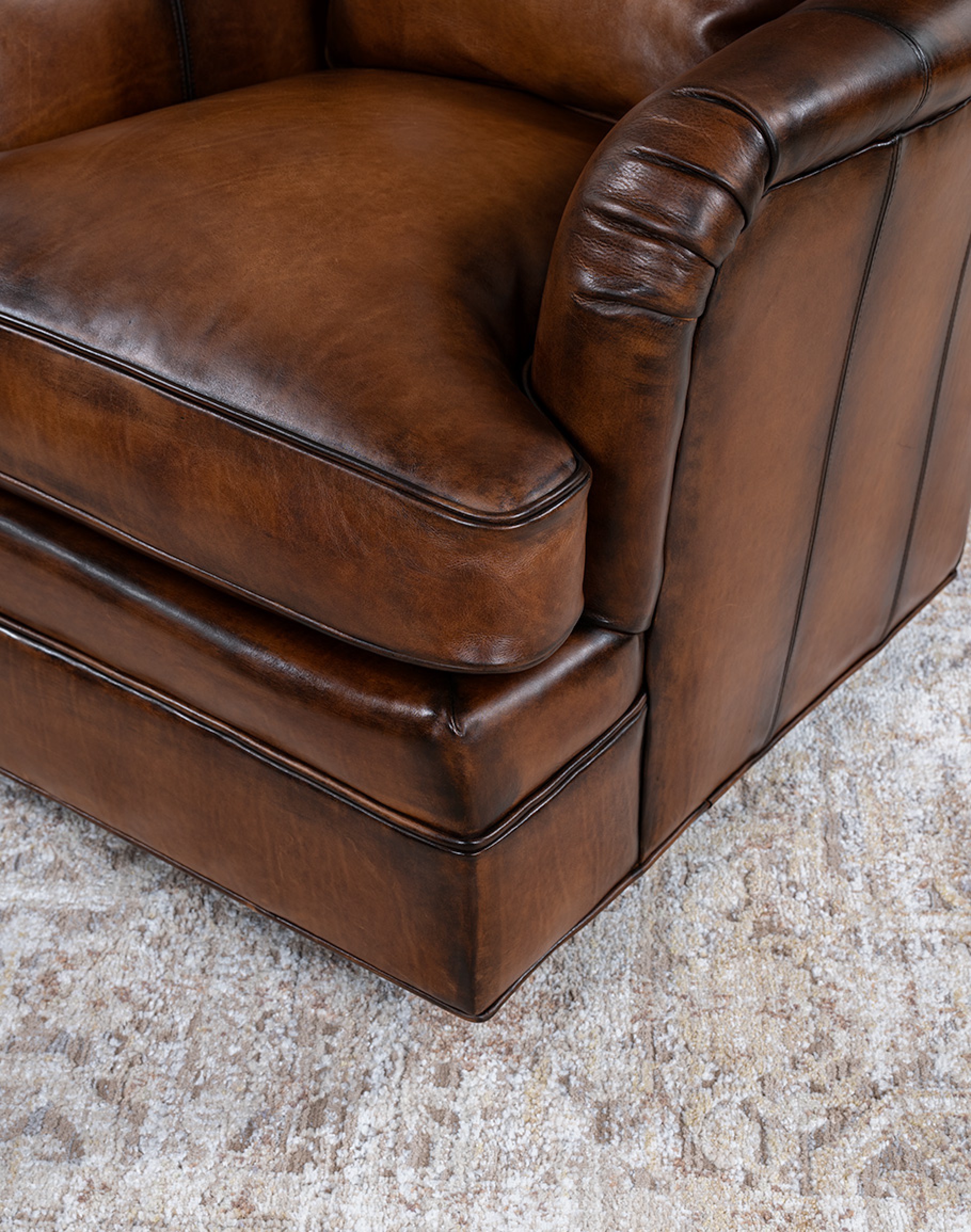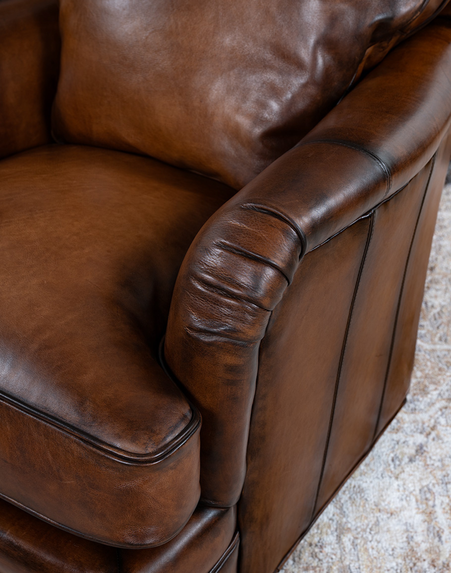 Leather Description:This is a full grain aniline leather tanned in a historic leather producing region of Italy using English hides. The century old tannery prepares this leather article by applying a hot wax, then turning the hides in old wooden tanning drums overnight to soften the natural fibers and impart it with a remarkable suppleness. The leather is then upholstered in its "crust form" on the furniture in North Carolina, After the furniture is made our leather artisans apply a multi step hand rubbed Patina using the same waxes and pigments used in Italy. Performing this process on the actual finished piece allows our artisans to develop a unique Patina, composition, and overall essence that creates a piece of furniture that has uniqueness, character and style that matches the individual who's selecting it. This leather imparts the feeling of a softer, well broken in leather one might find on a decades old chair discovered in a French country estate or the Parisian flea market. The leather is brand new from our Artisans hands... without the aging issues that sometimes come from the hands of time. Truly a unique, hand-made article in an era when only companies committed to the highest standards lavish this sort of attention and time to unique American made furniture.