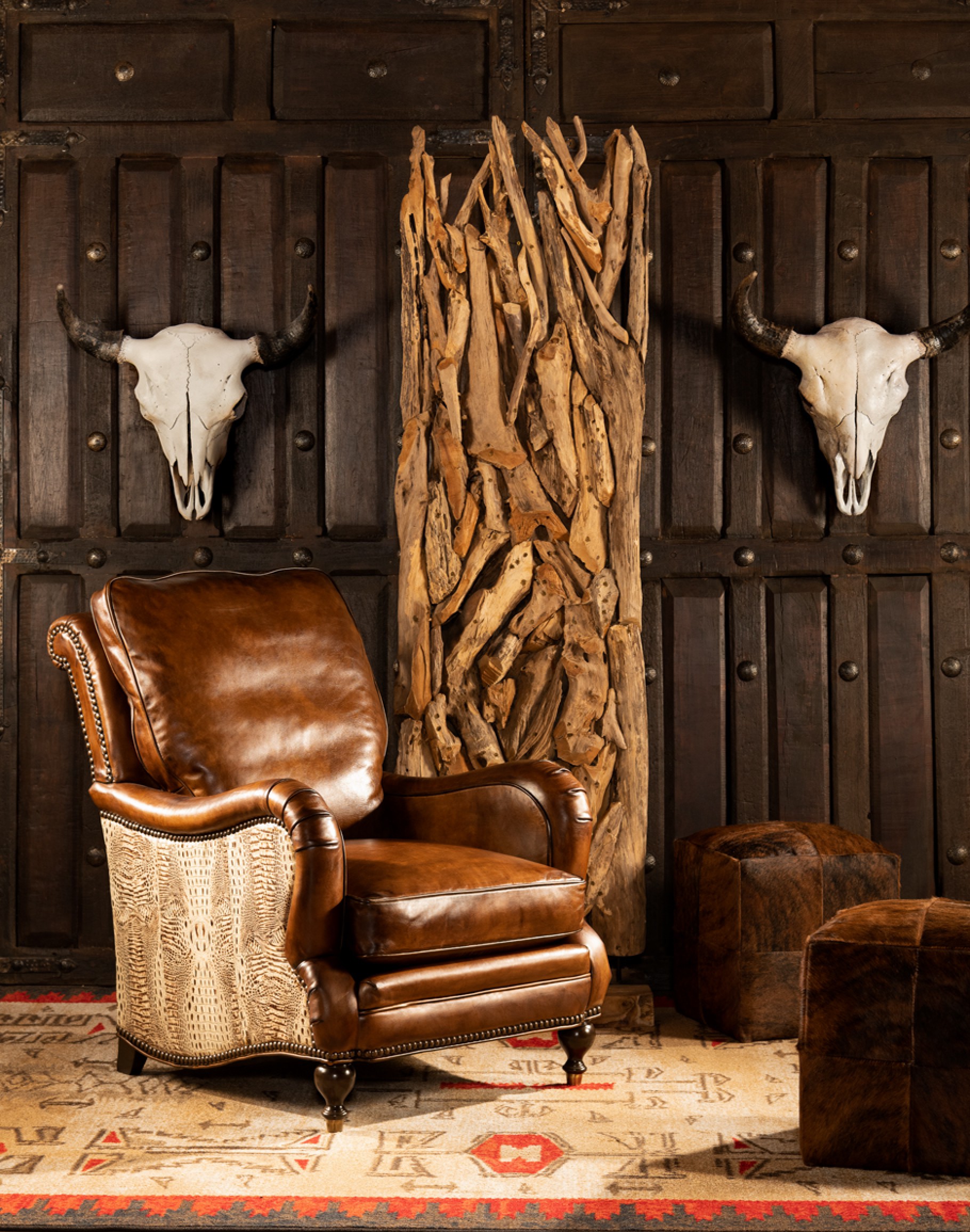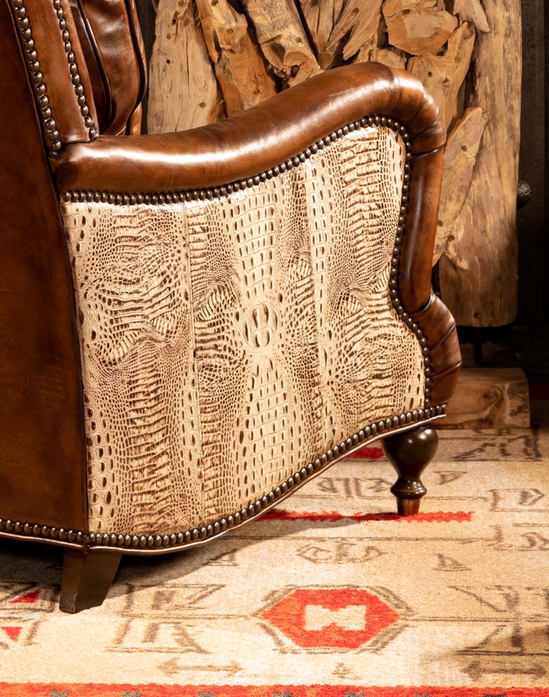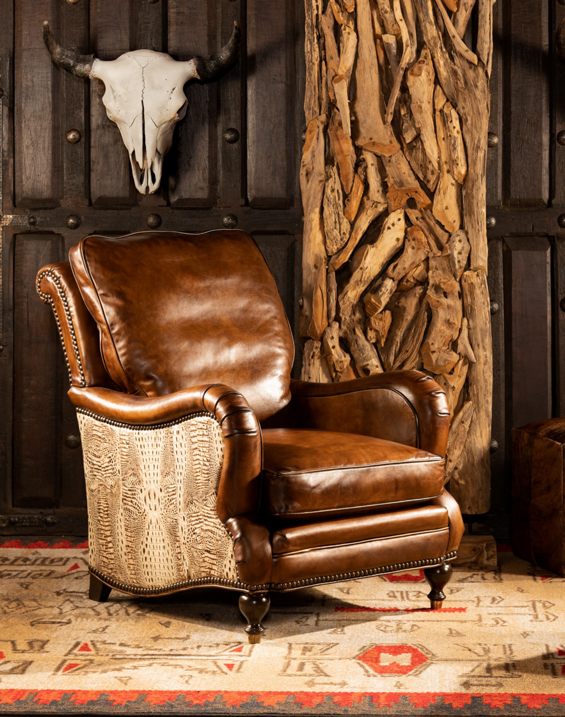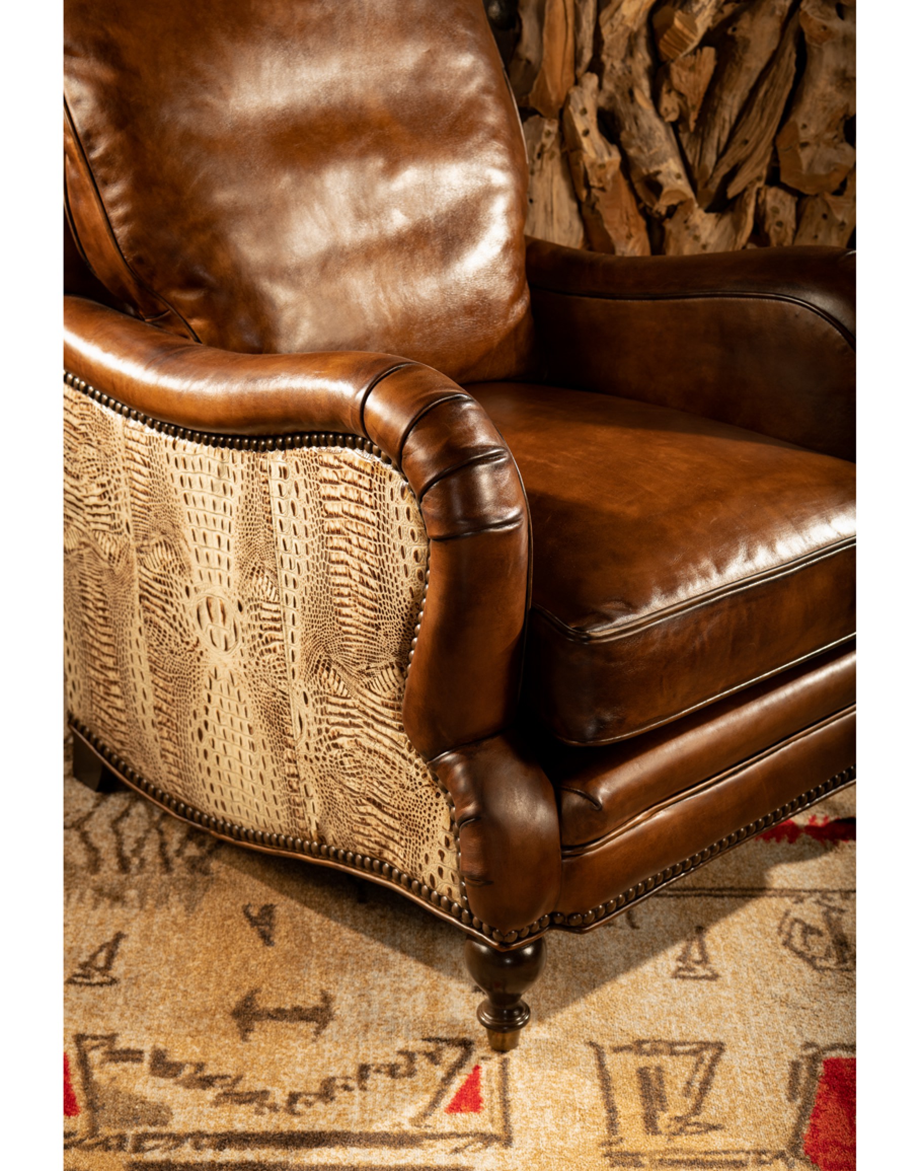 You'll love relaxing in our Dutton Sauvage Leather Chair . Its supple hand burnished leather makes you want to keep coming back. The Dutton Sauvage Leather Chair features an exceptional artisan leather tanned to the highest standards of quality with a rich embossed ivory croc accents. Artisan craftsmanship and comfort, appealing materials blend together to create a centerpiece of any fine décor scheme. The Dutton Sauvage Leather Chair is one of the most eye-catching pieces of living room furniture you will find! 100% American Made to the highest standards of quality and craftsmanship!