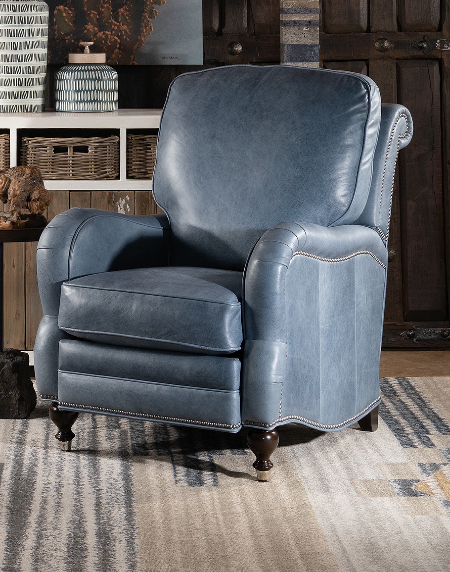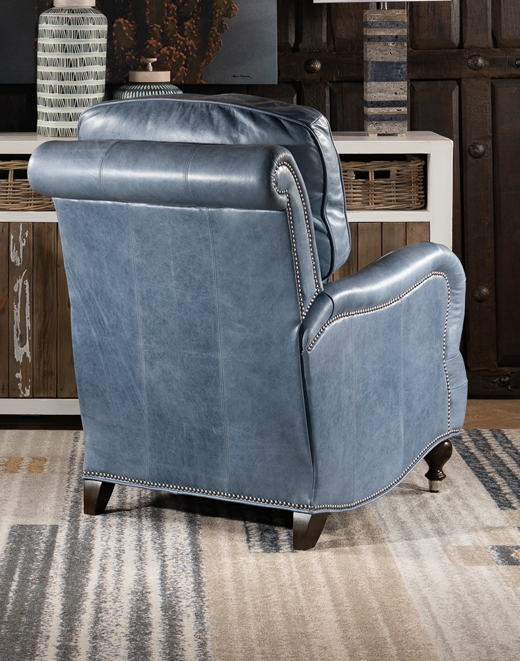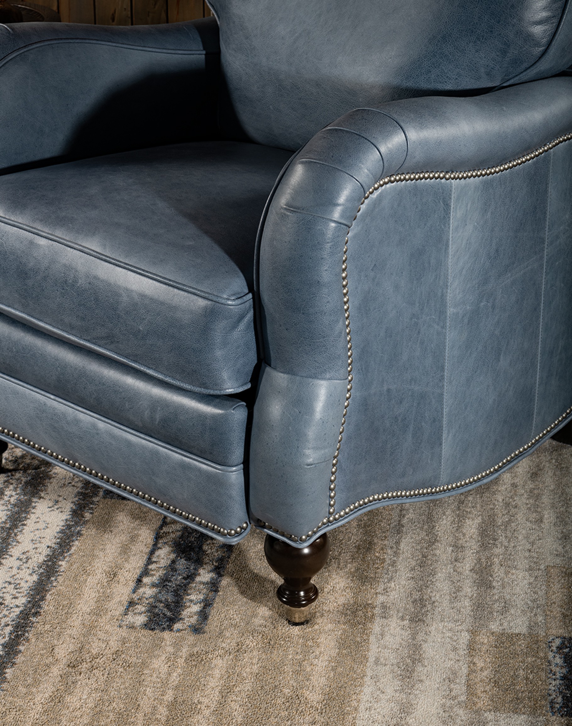 The sophisticated look of the Dutton Slate Leather Recliner with bring elegance to any room. Artisan craftsmanship and comfort, appealing materials blend together to create a centerpiece of any fine décor scheme. 100% American Made to the Highest Standards of Quality and Comfort.