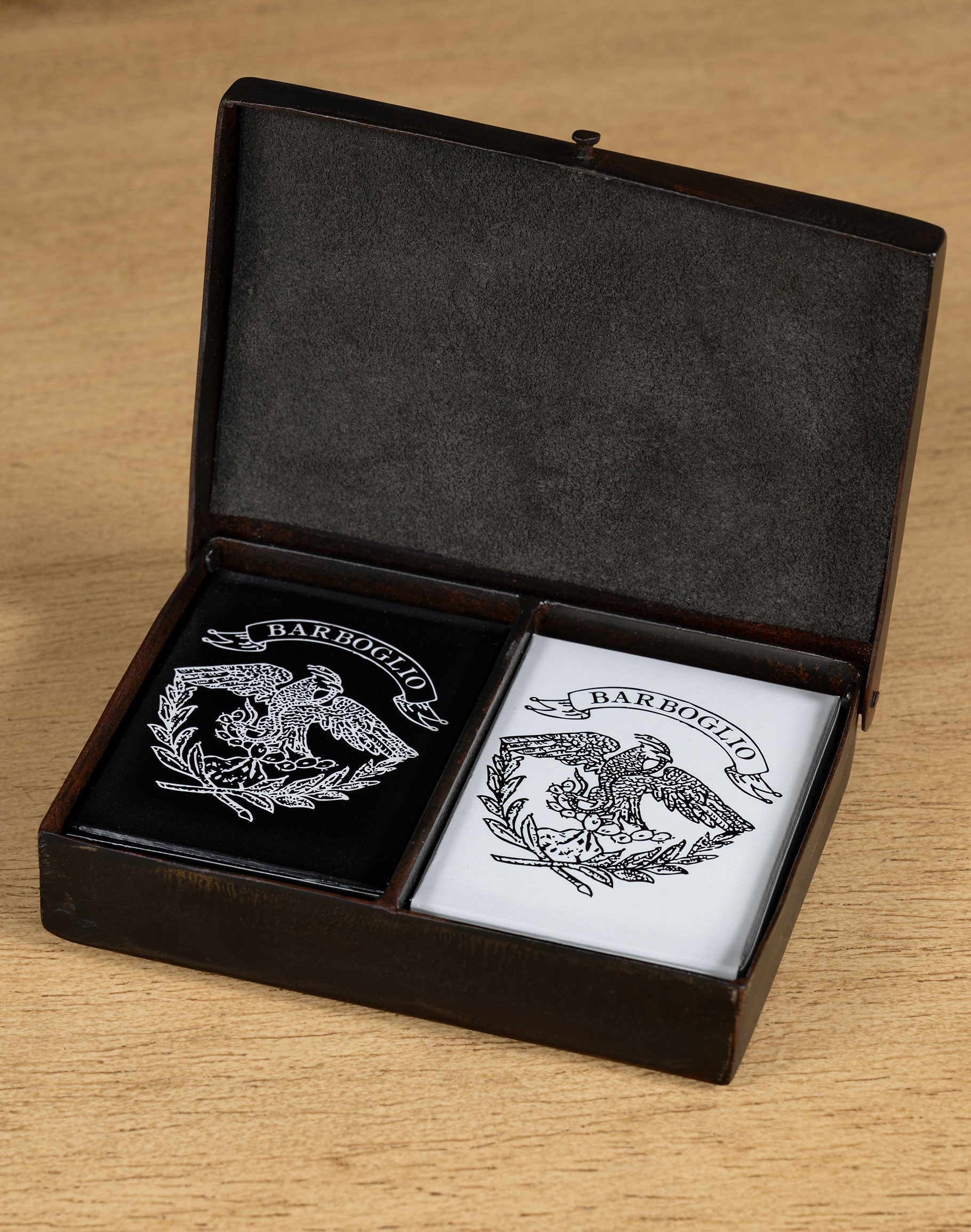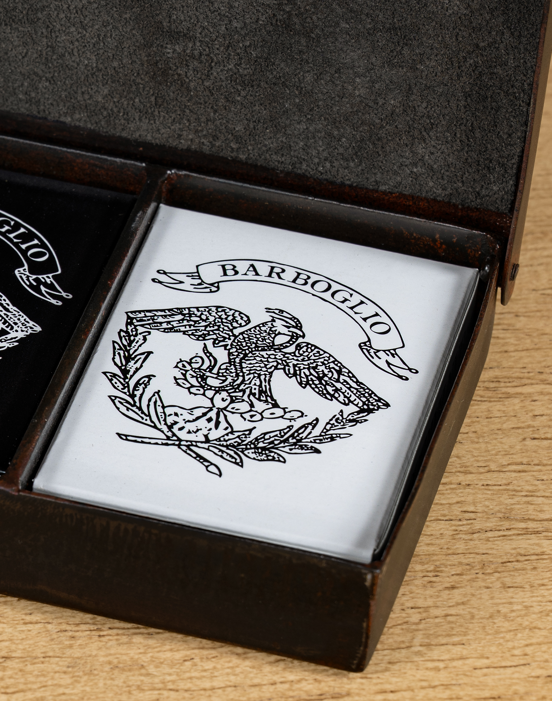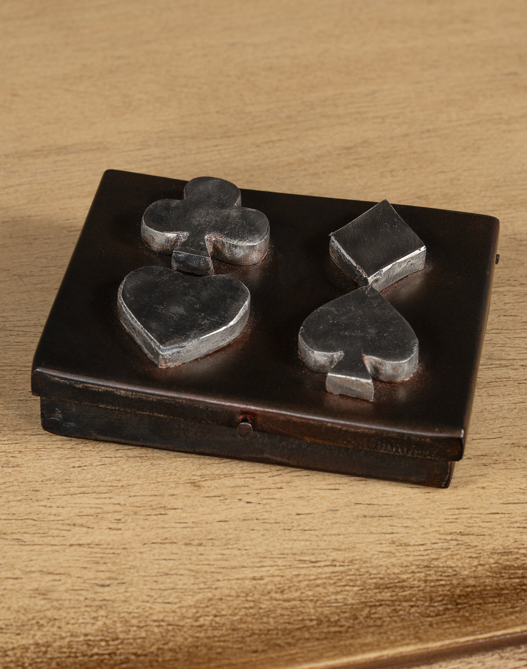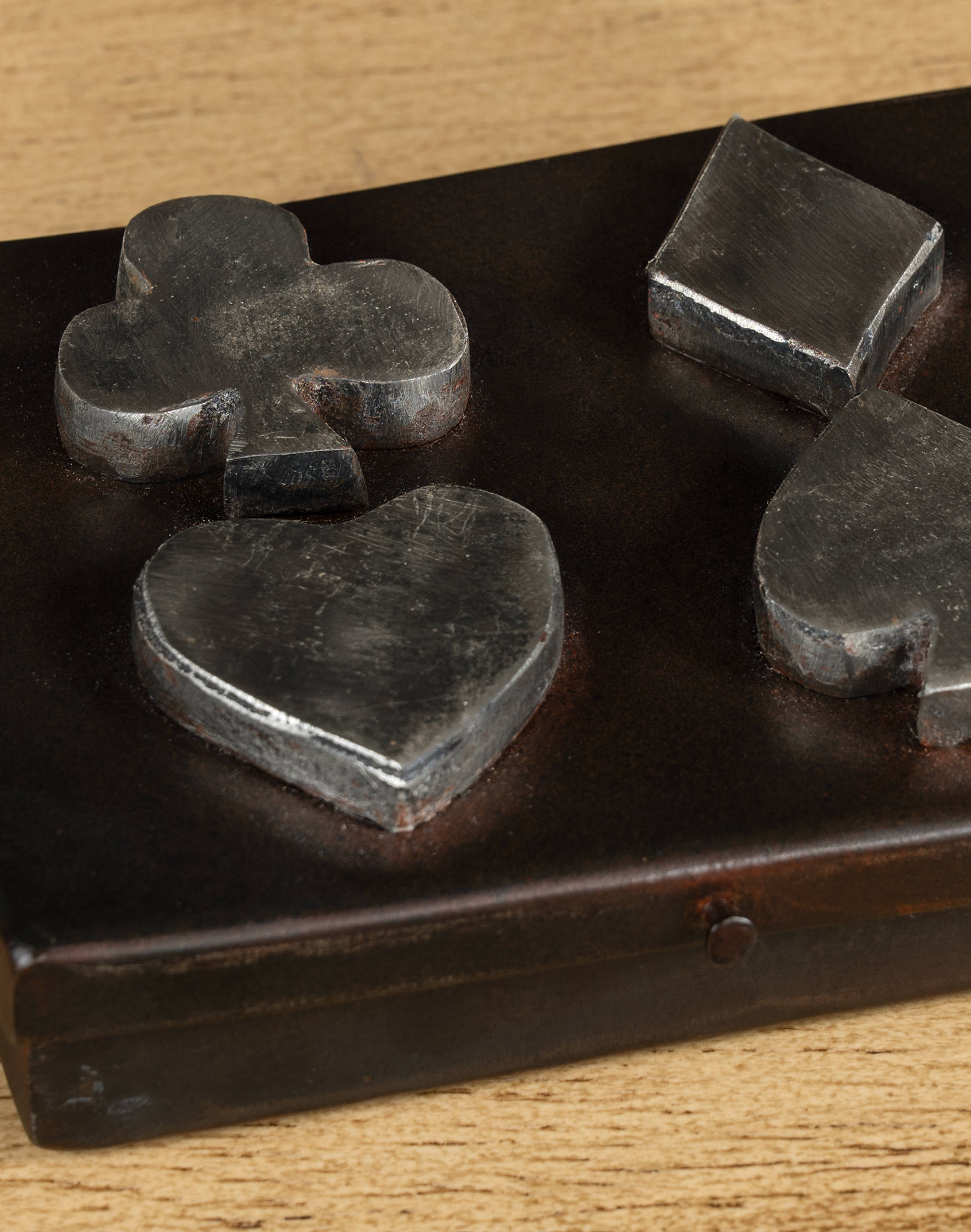 Hand forged iron playing cards box with nickel plated cast iron diamond, spade, club and heart. Contains two sets of Jan Barboglio playing cards inside.