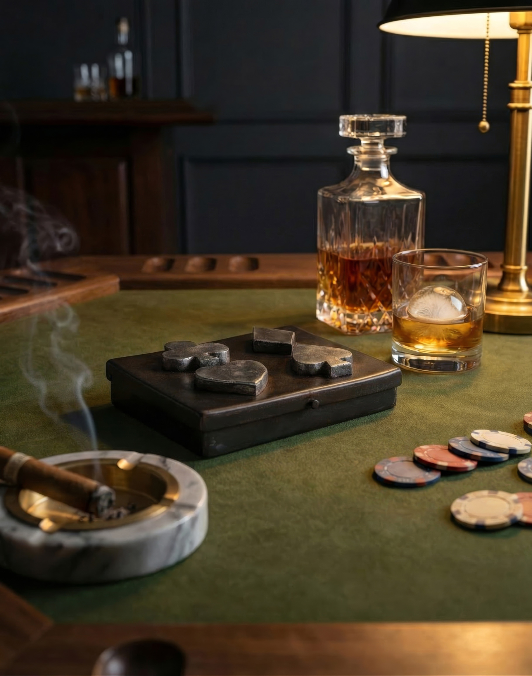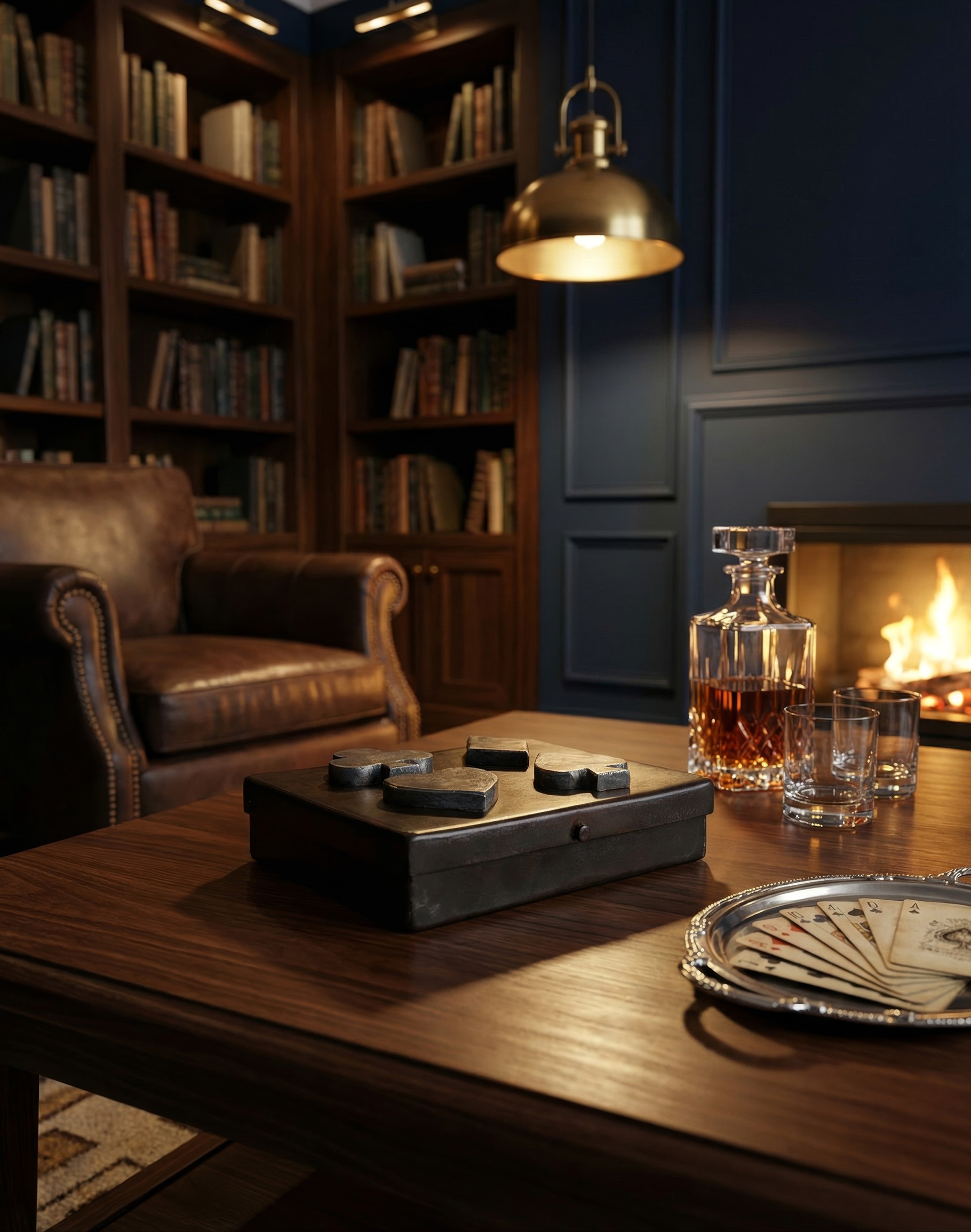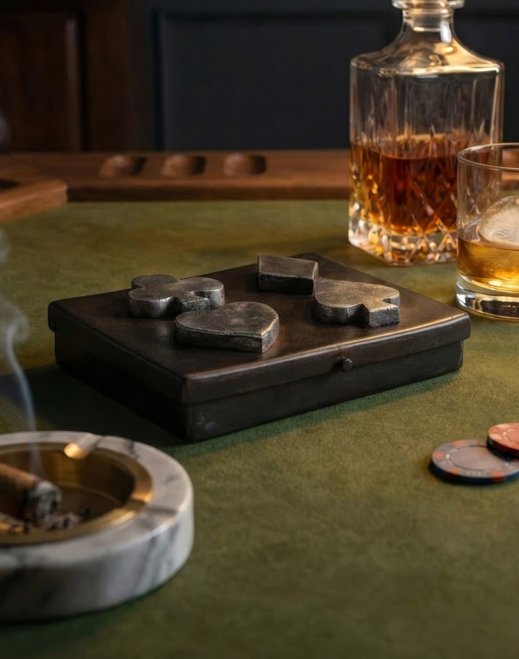 Hand forged iron playing cards box with nickel plated cast iron diamond, spade, club and heart. Contains two sets of Jan Barboglio playing cards inside.