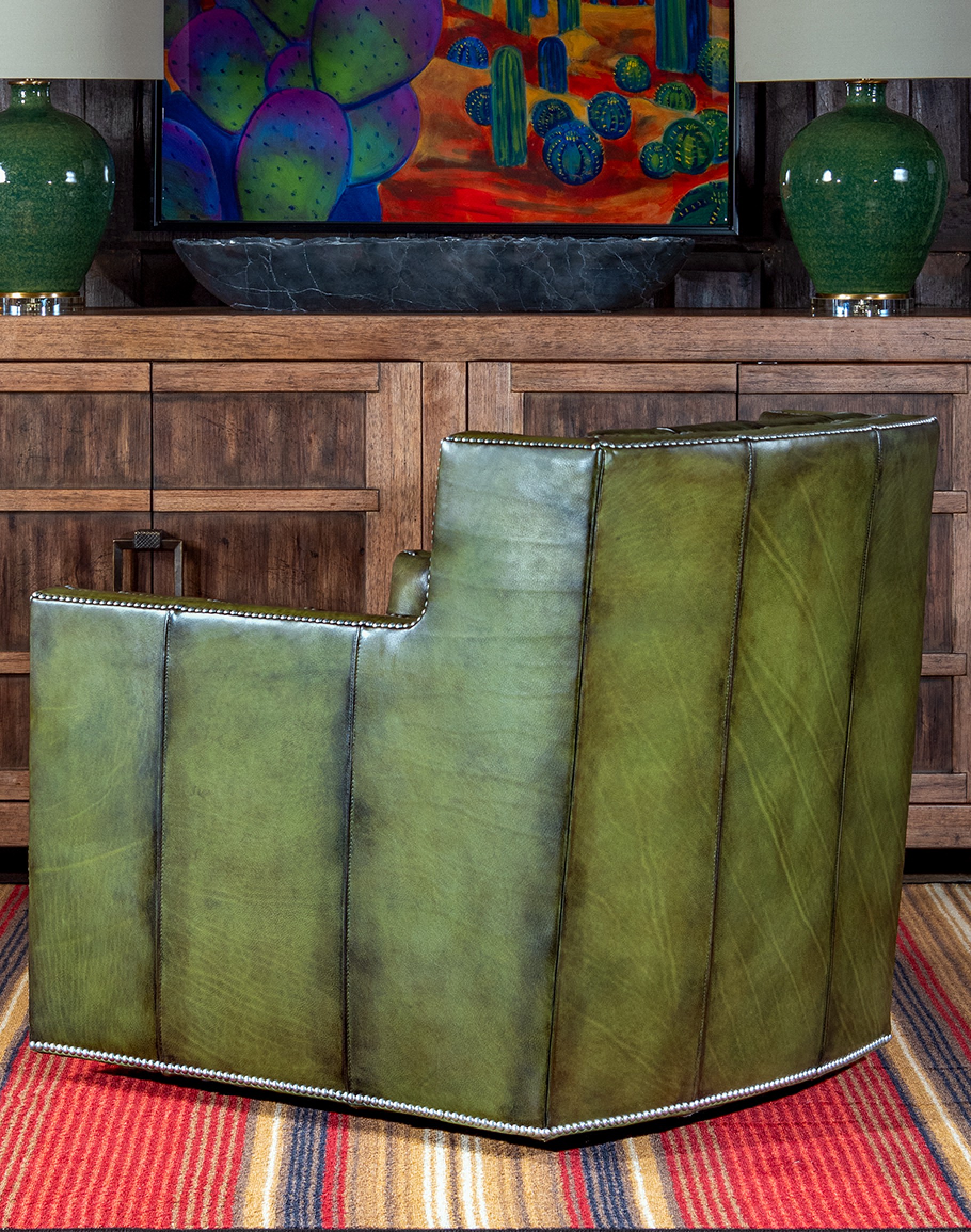 The chair is enveloped in a luxurious full-grain leather hide, chosen for its superior quality and durability. The olive-green leather is a color and a statement of style, enriched with hand-burnished details highlighting its natural beauty and texture. Adorned with nickel nail heads, the Ellis Swivel Chair boasts a refined look, with trimmings that outline the arm rails and upper back, lending a classic yet contemporary charm to its boxy silhouette. Function meets form with the chair's 360-degree swivel feature, offering convenience and flexibility. Every detail, from the full-grain leather to the robust construction methods, is chosen for longevity. It was designed for its aesthetic appeal and unparalleled comfort and functionality. Elevate your home with the Ellis Swivel Chair, where luxury meets durability. Perfect for those who appreciate the finer things in life, this chair promises to be a beloved addition to any room. At Adobe Interiors, we create the furniture, and you create the memories.