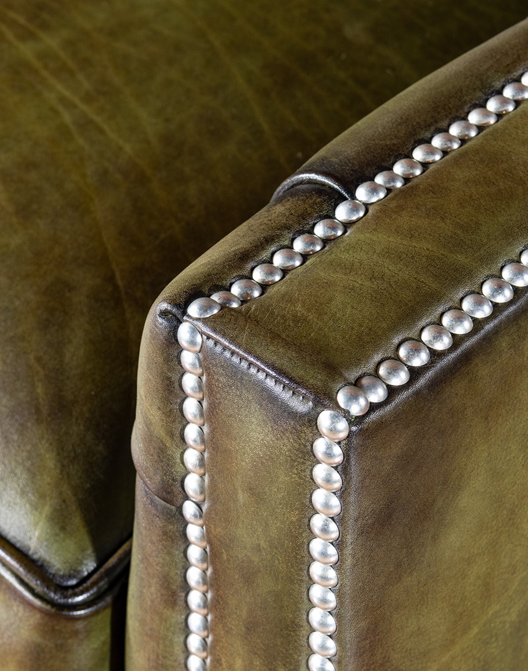 Premium Full Grain Leather: The chair is enveloped in a luxurious full-grain leather hide, chosen for its superior quality and durability. The olive green leather is not just a color but a statement of style, enriched with hand burnished details that highlight its natural beauty and texture. This exquisite material ensures that each chair is unique, with its own set of rich characteristics.