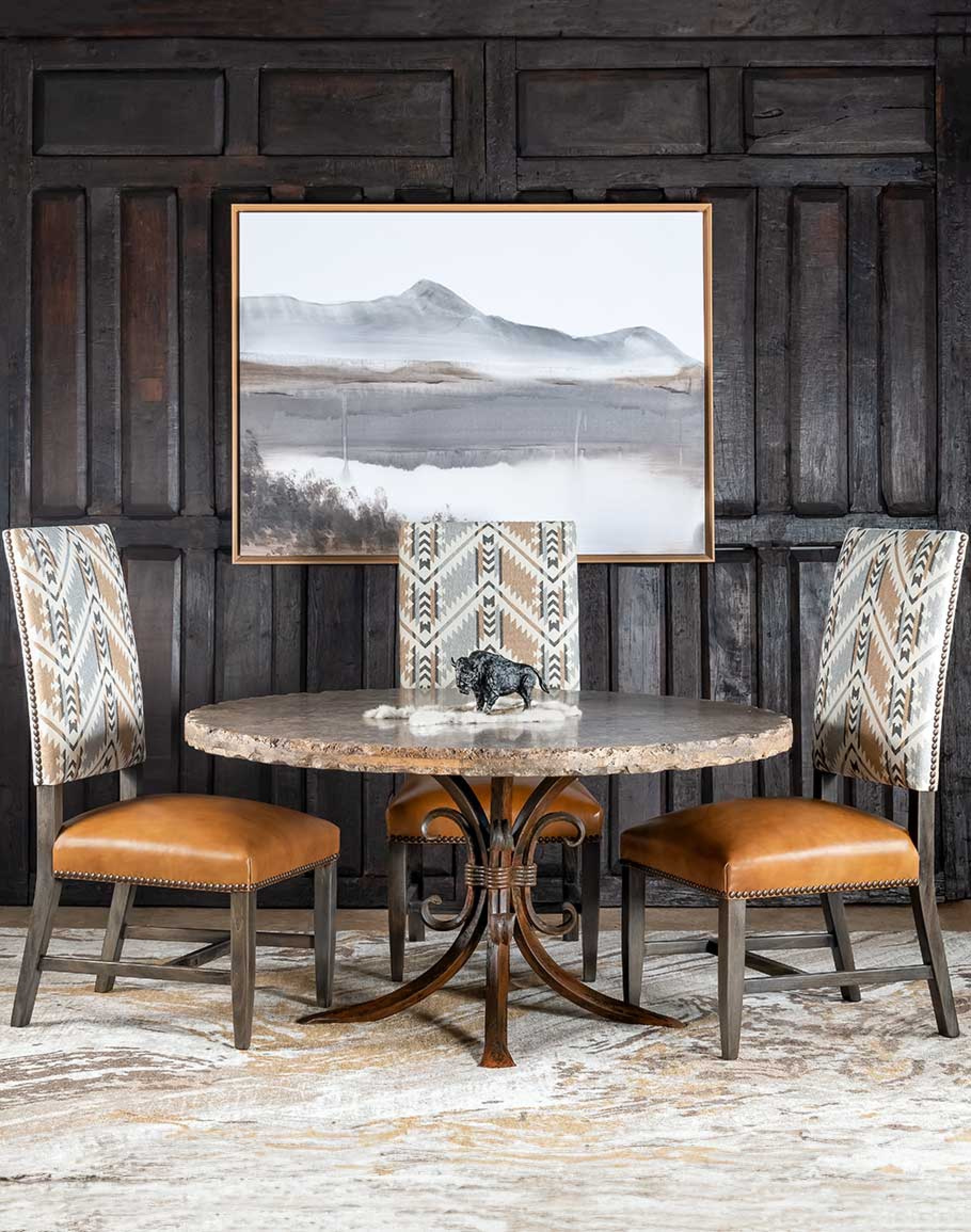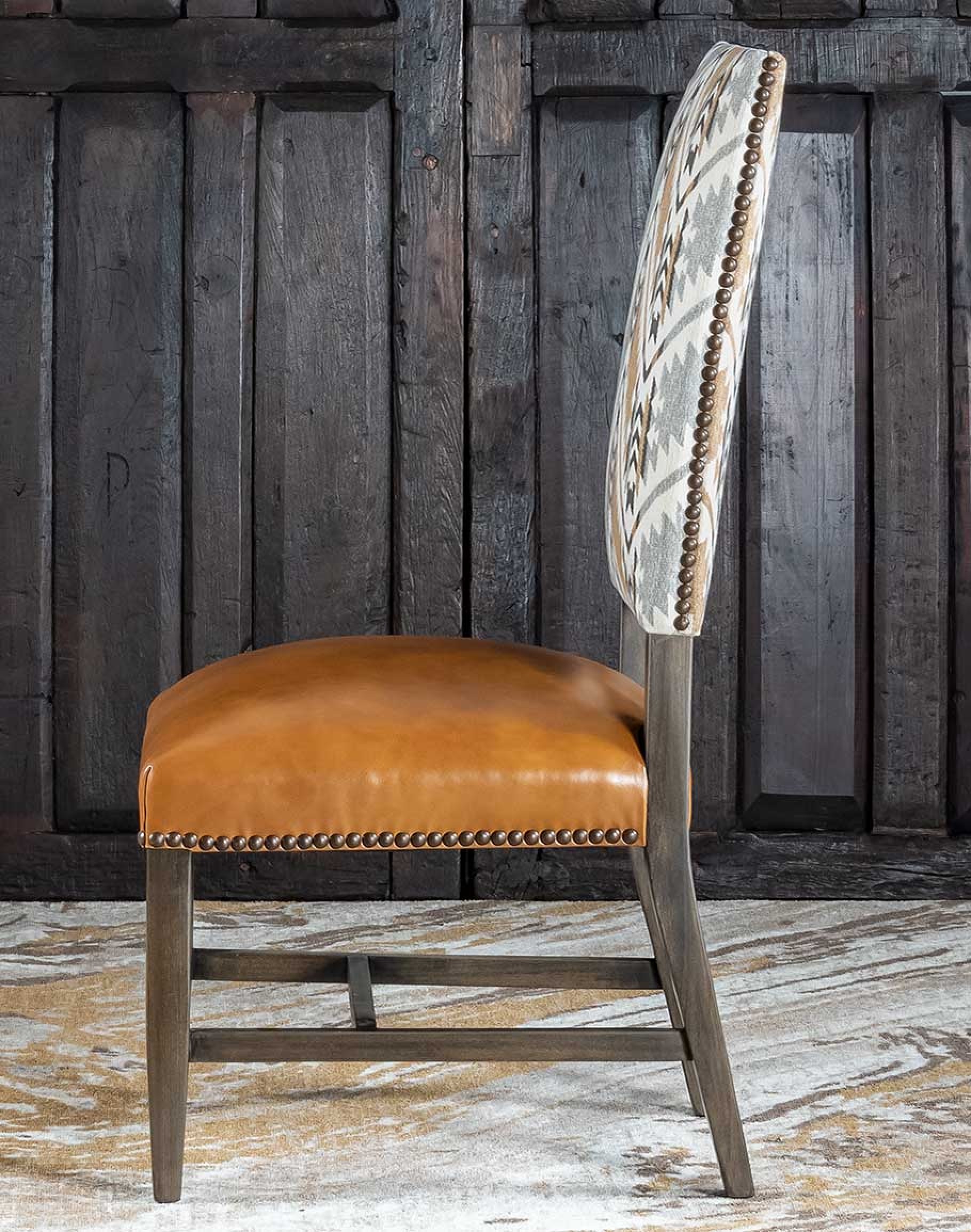 Introducing the Flint Dining Chair—a true testament to American craftsmanship and high-end design. This striking chair, part of Adobe Interiors' Mountain Ranch and Eclectic Ranch collections, embodies a unique fusion of rustic charm and contemporary elegance. The frame is crafted from Appalachian poplar wood, known for its durability, ensuring a solid foundation that will stand the test of time. The chair’s bold geometric back pattern adds a touch of eclectic style, while the rich saddle tan leather seat provides comfort and sophistication.