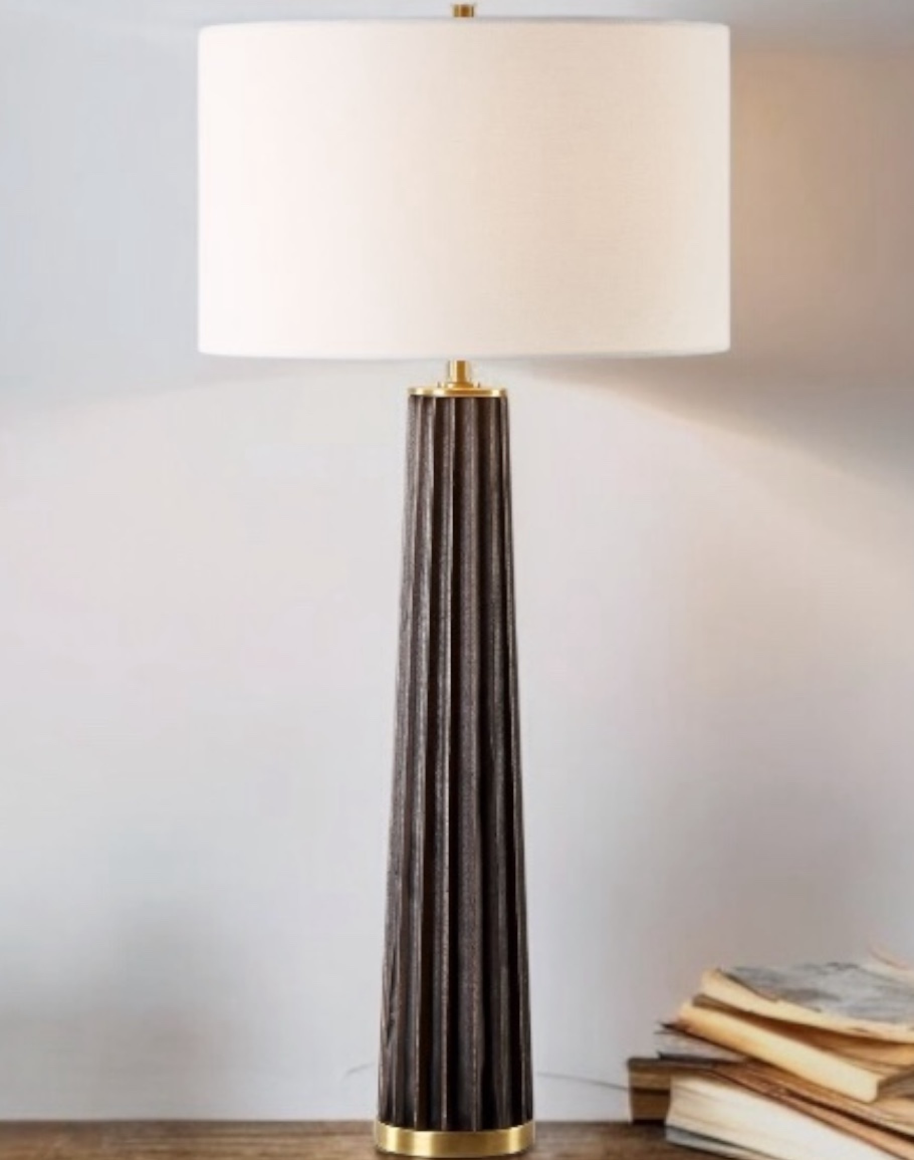 Bringing the warmth of nature indoors with its dark stain oak wood base, elegantly adorned with scalloped edges. Accented with plated antique brass finishes, this lamp infuses any space with a touch of rustic charm and a dash of sophistication. The round hardback drum shade is a white linen fabric.