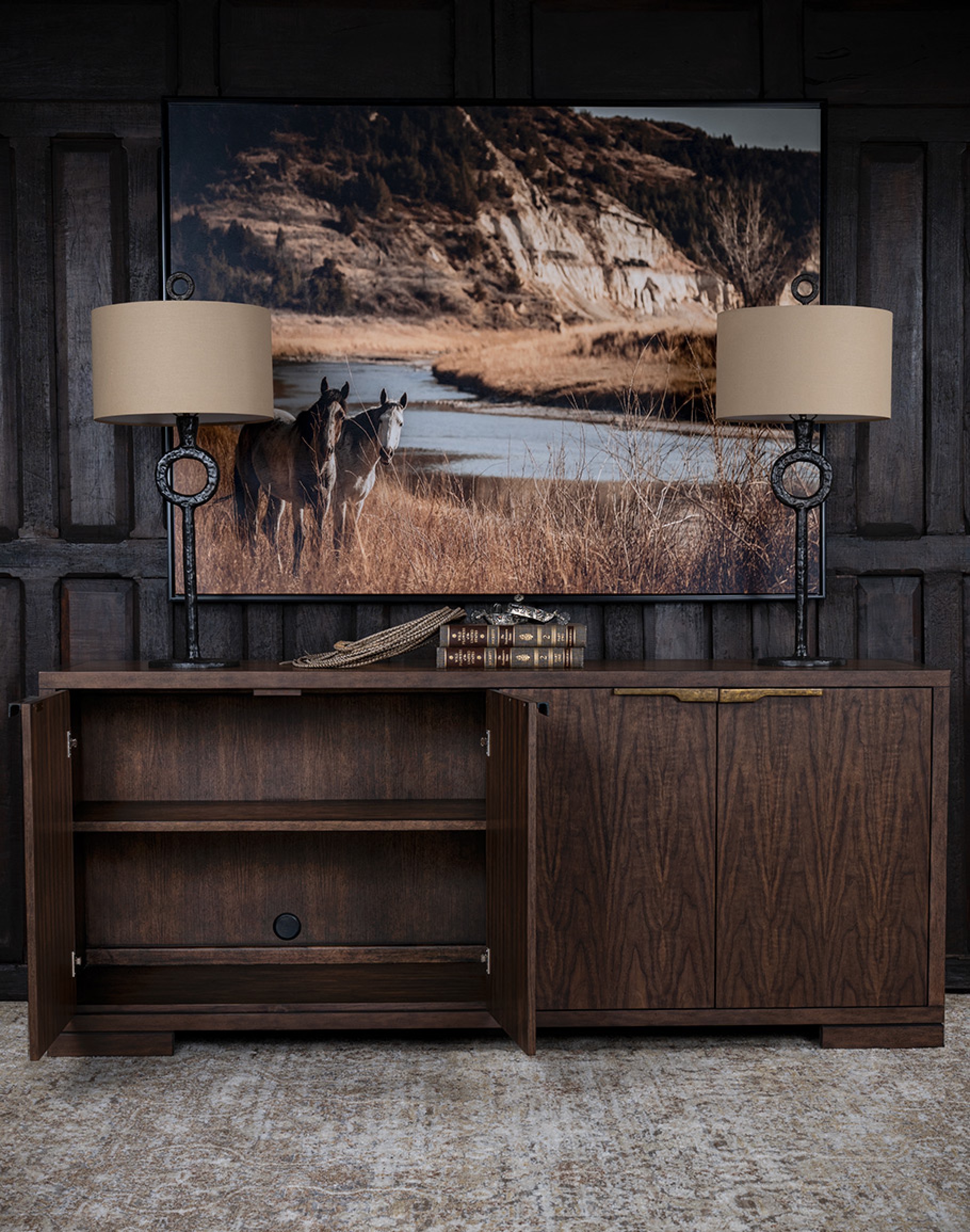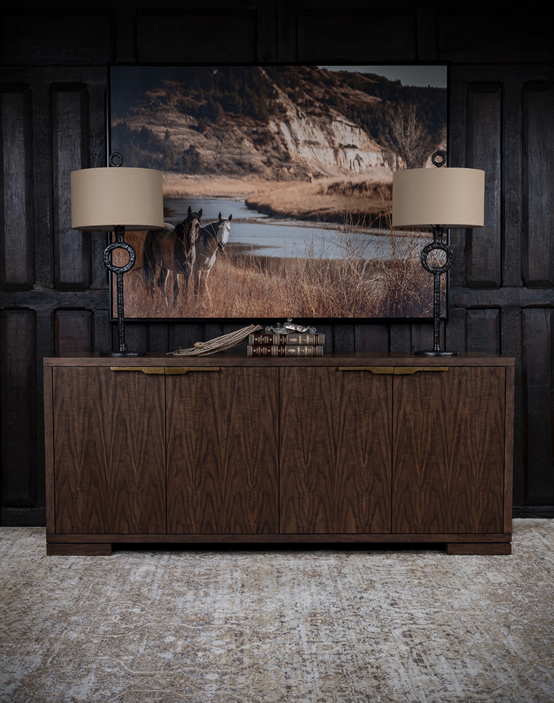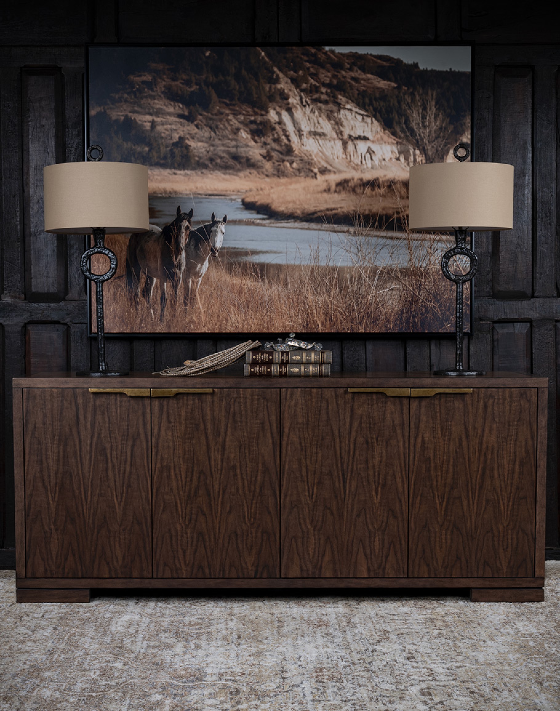 Bring refined Western style to your dining room or living space with the Fort Davis Walnut Buffet—a statement piece that balances clean, modern lines with authentic ranch-inspired warmth. Crafted from hardwood solids and walnut veneer in a deep walnut brown finish, it showcases a bold, flowing wood grain that reads rich and tailored, while brass-toned hardware adds a subtle hit of vintage saddle-metal character. The long, low profile makes it ideal as a dining buffet, entry console, or living room credenza, delivering a grounded look that plays beautifully with leather, iron, linen, and natural textures.