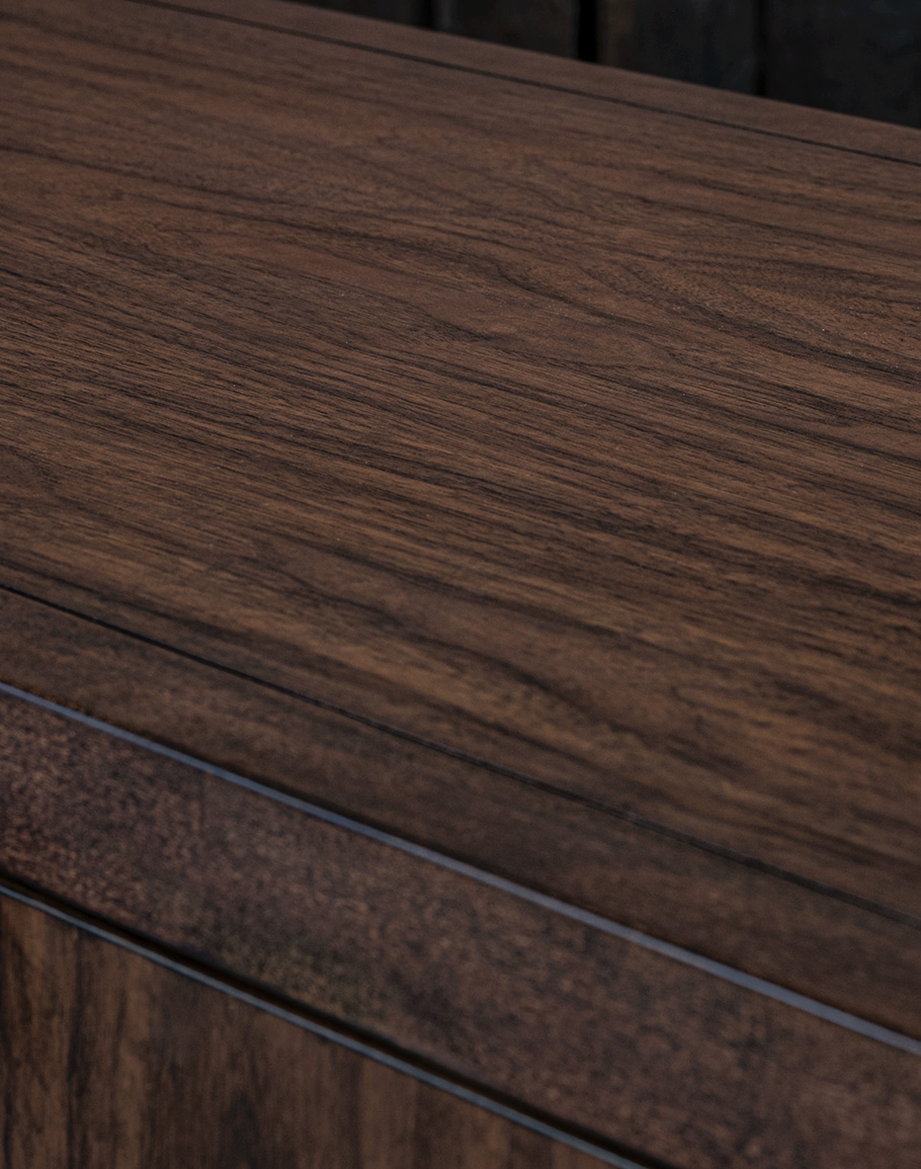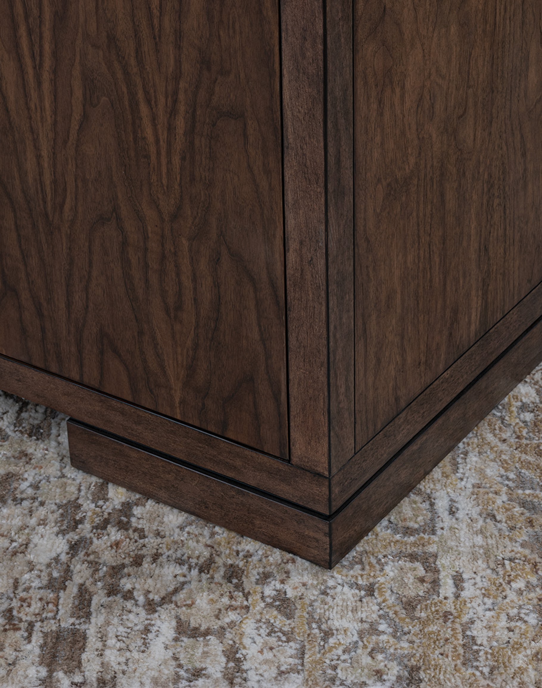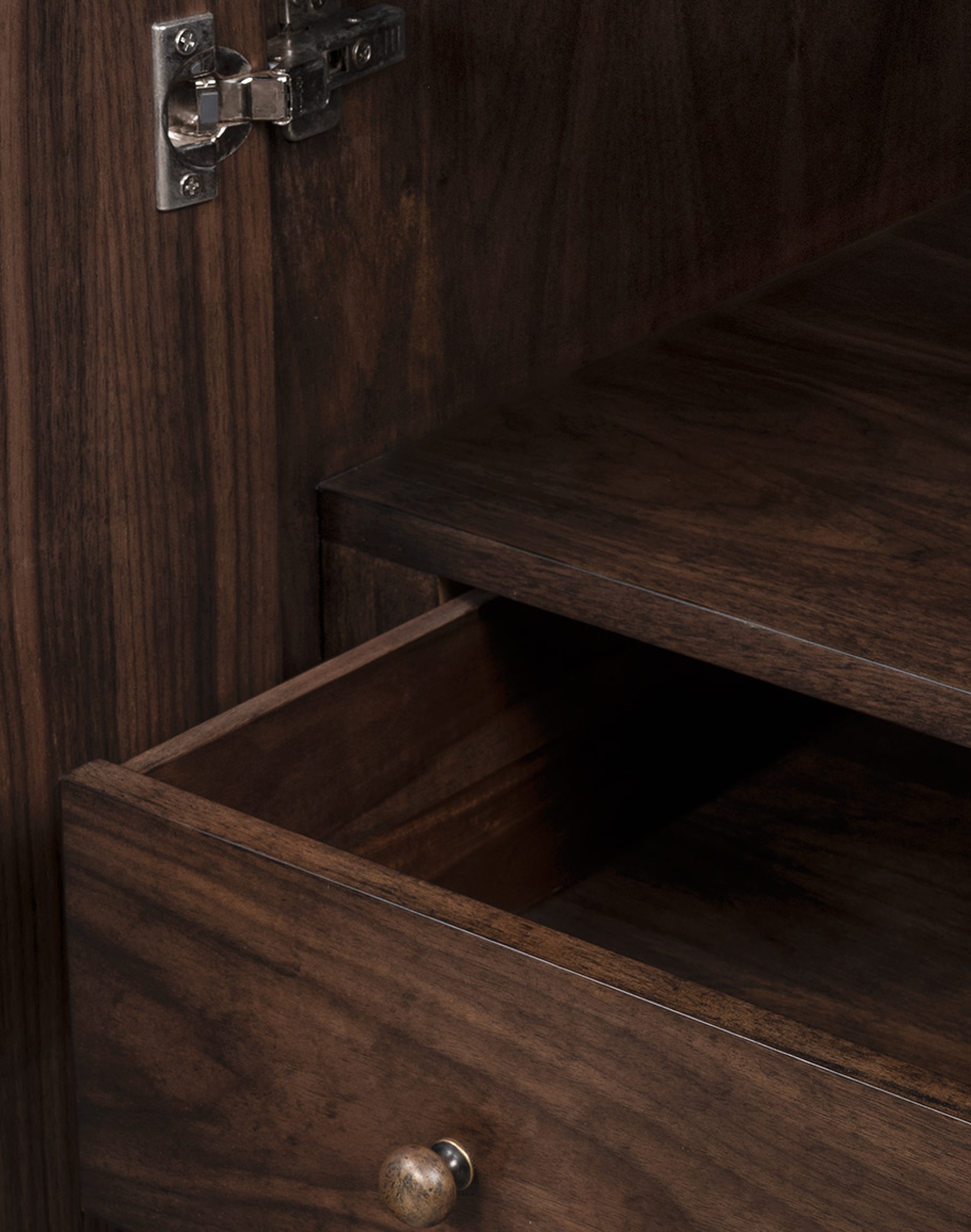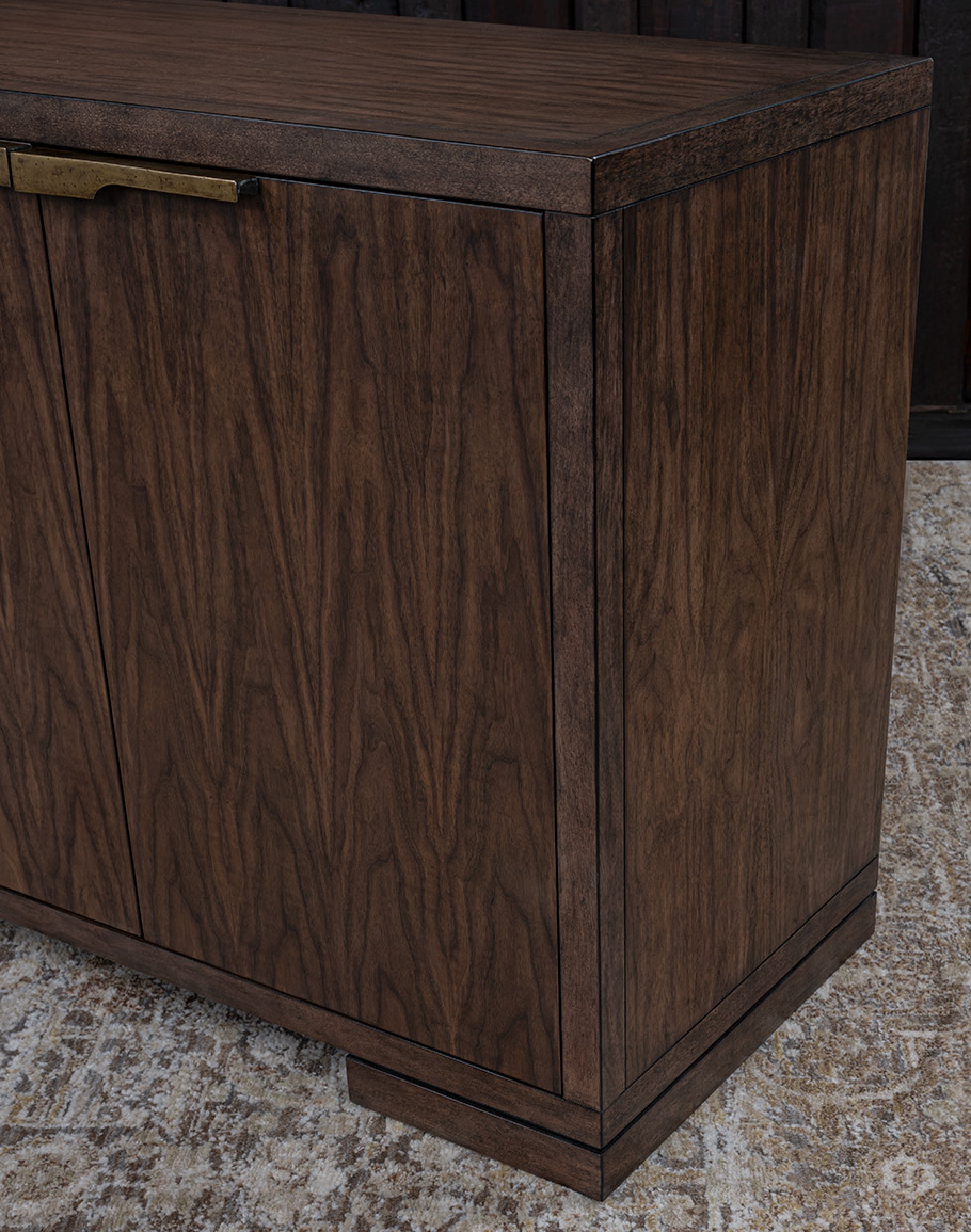 Behind four cabinet doors,you’ll find generous concealed storage designed for real-life function—perfect for stowing serveware, bar essentials, board games, or extra linens. Inside, a center drawer keeps smaller items organized and within reach, while open interior compartments provide versatile space for larger pieces. A discreet cord-management cutout makes it a smart choice for a media-ready setup, a stylish home bar, or a charging station that stays hidden and tidy. Finished with a sturdy plinth base and crisp case detailing, the Fort Davis Walnut Buffet brings upscale Western practicality to any room—handsome, organized, and built to stand out without feeling heavy.