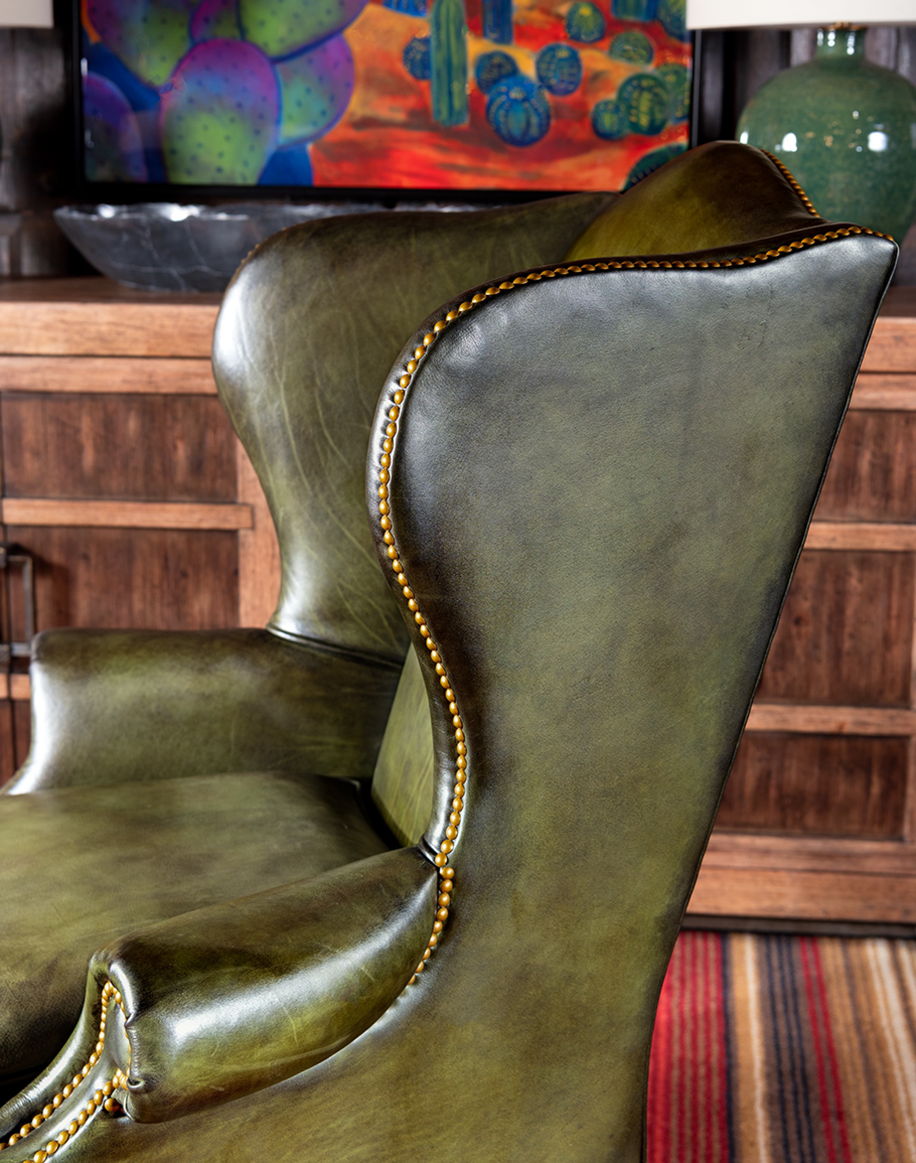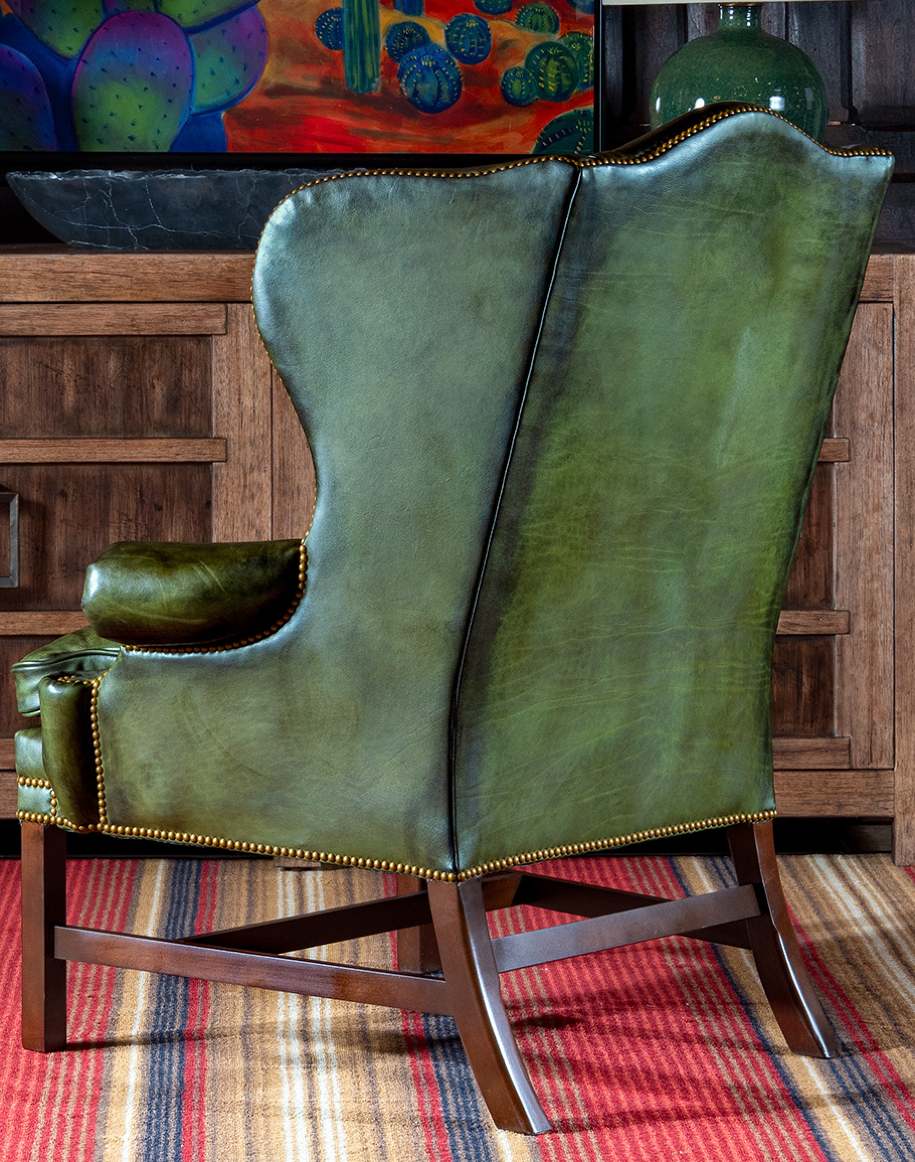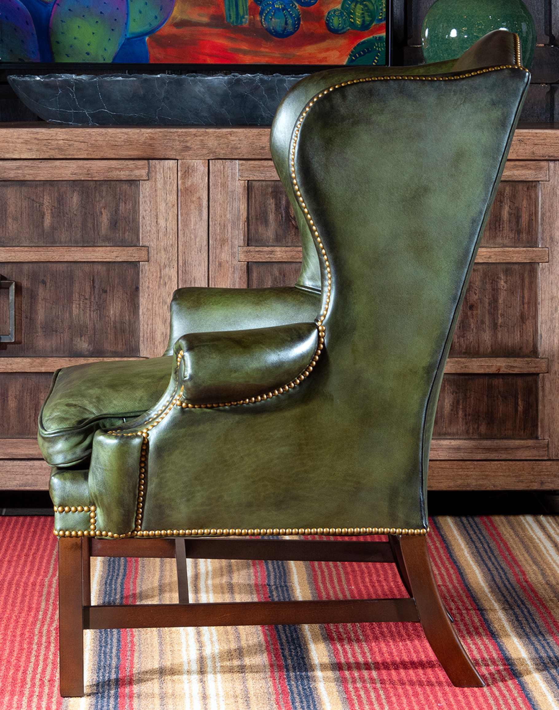 Discover elegance and comfort with the Gentry Olive Wingback Chair, a timeless addition to any home. This exquisite piece, 100% American-made, showcases the pinnacle of quality and craftsmanship. Upholstered in luxurious, hand-brushed olive-green leather, it exudes sophistication and durability, ideally suited for the Classic Ranch and Refined Ranch collections.