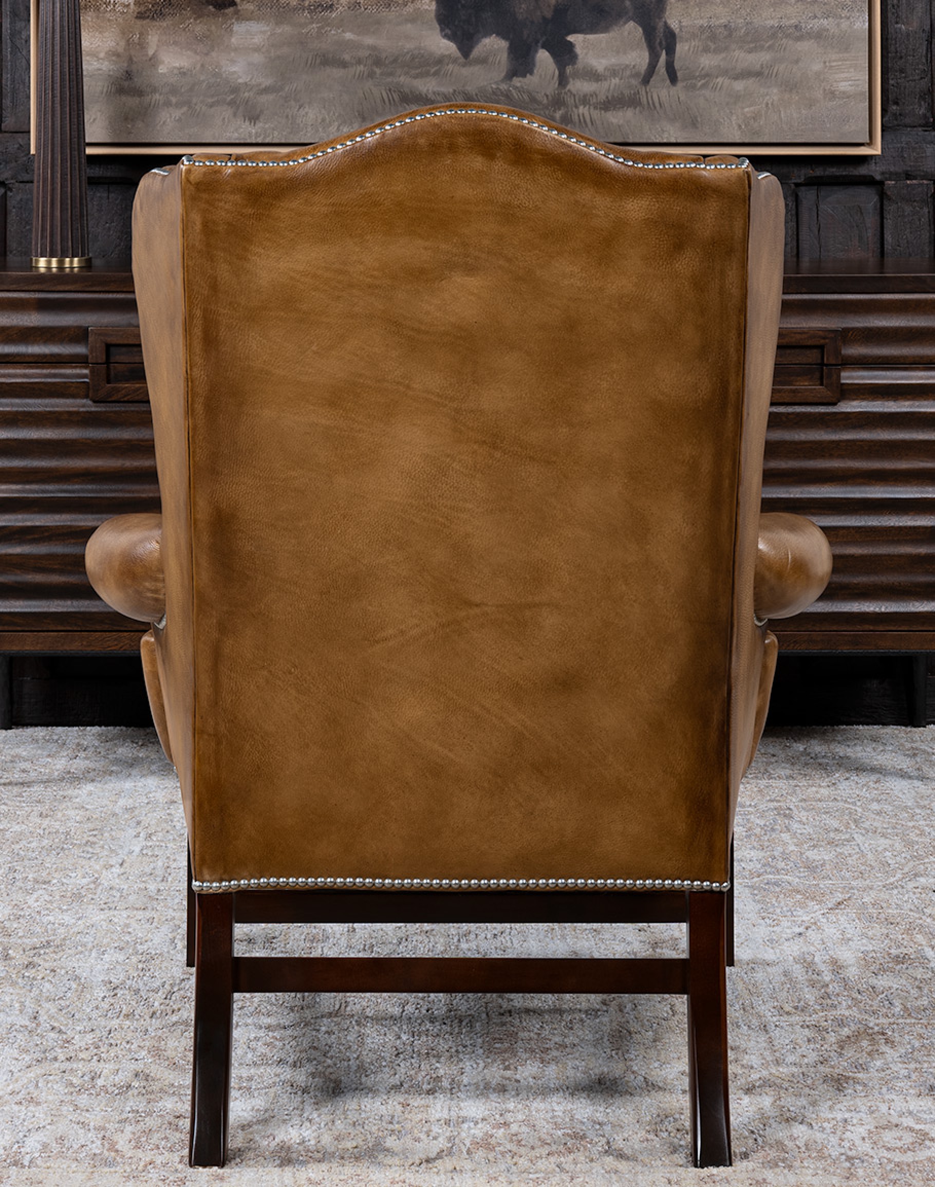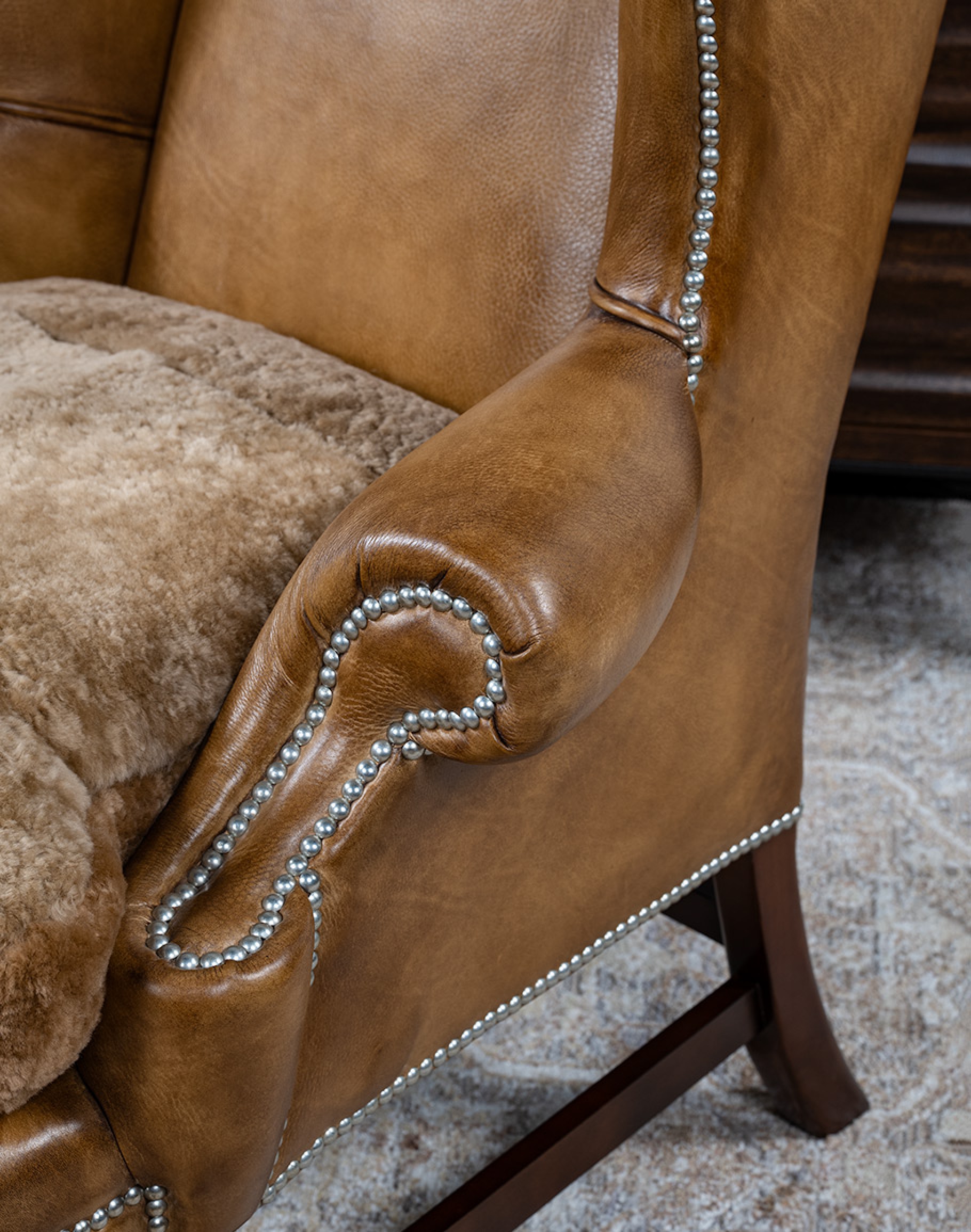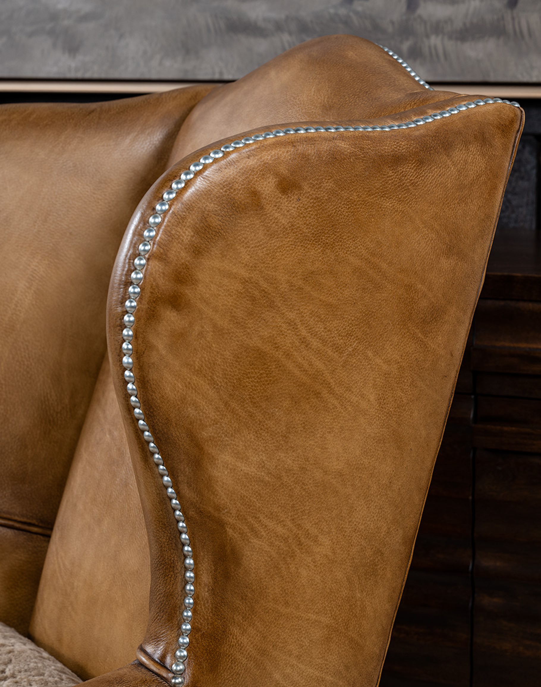 The chair’s warm saddle tan hue brings natural depth and richness to any interior, while the winged back silhouette and hand-applied antique nickel nailhead trim create a distinguished profile. A solid hardwood frame ensures enduring stability, complemented by a deep seat and plush shearling cushion for inviting comfort.